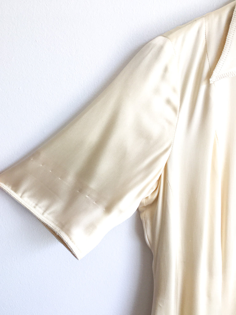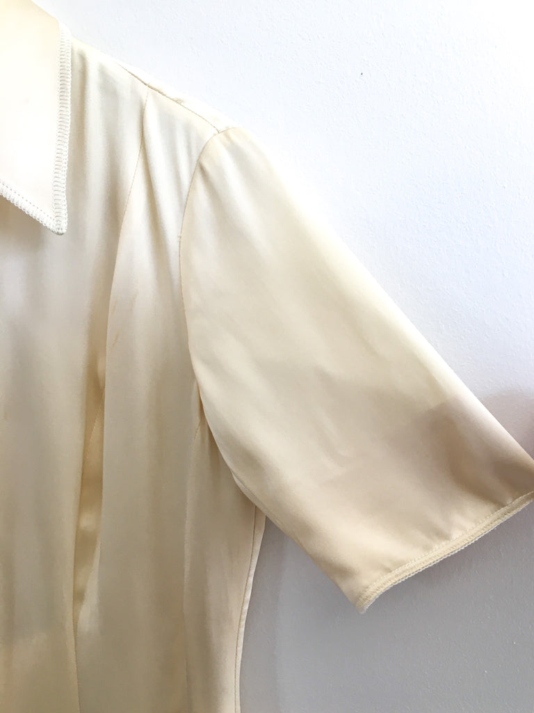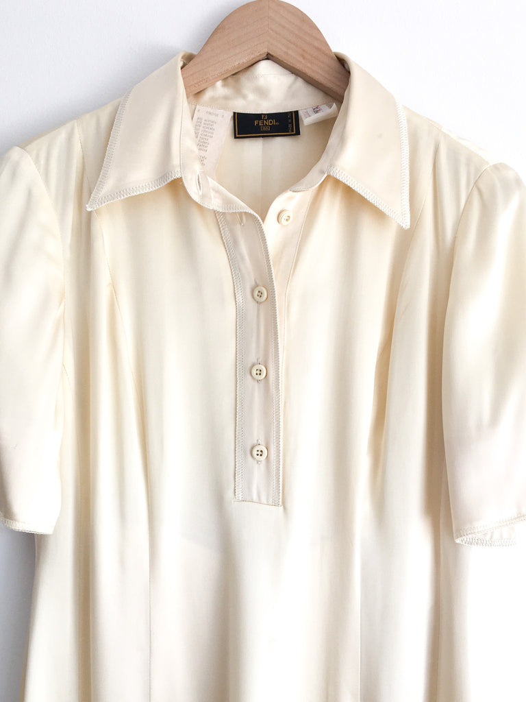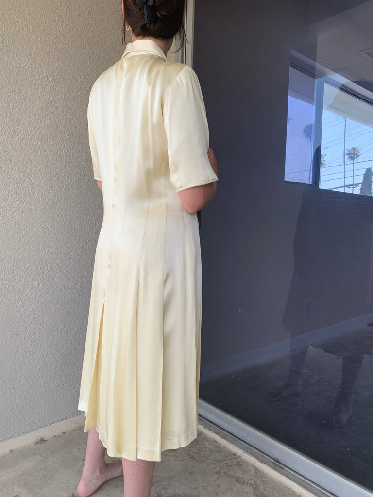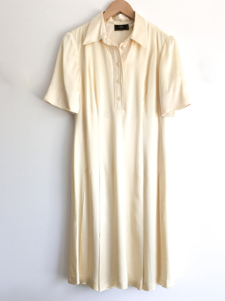 A classic, minimalist dress. Short sleeves, button front, pleated skirt detailing.