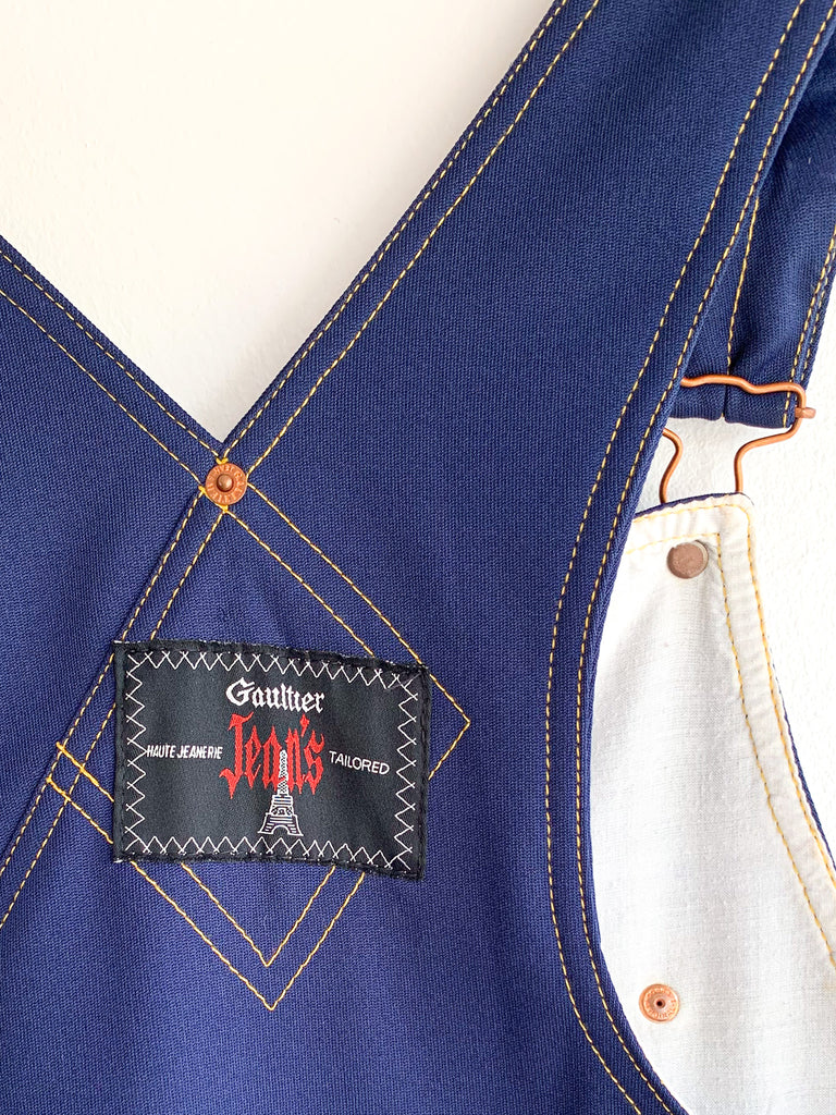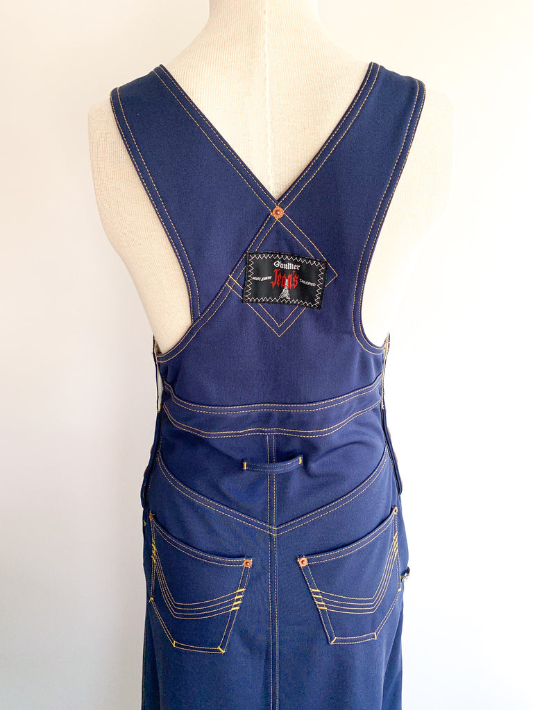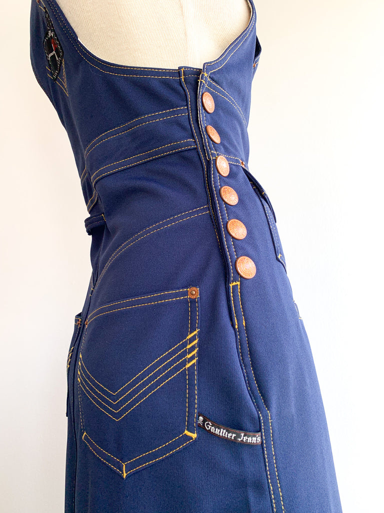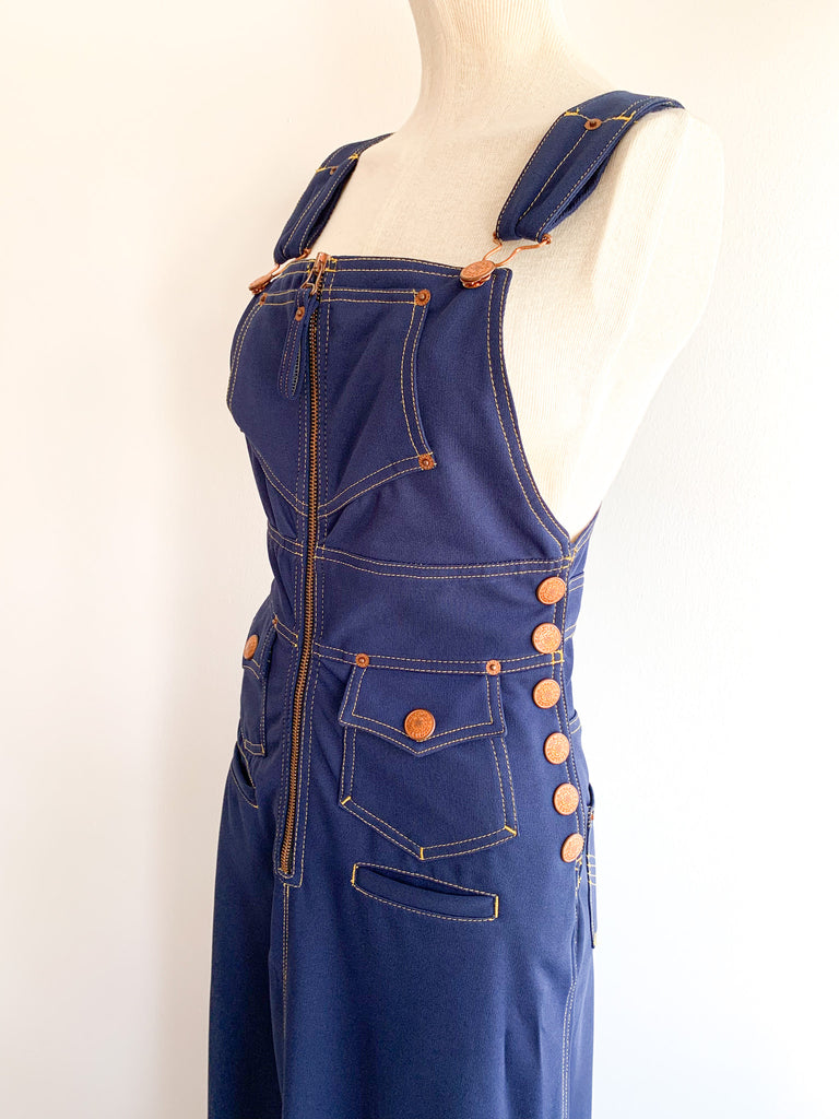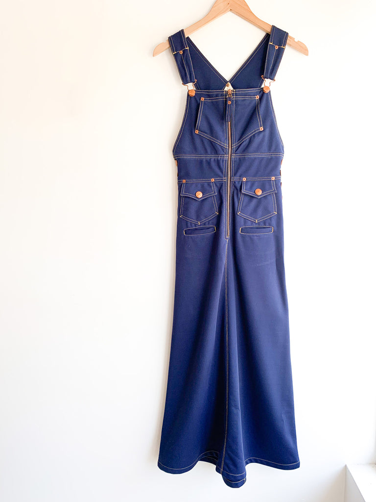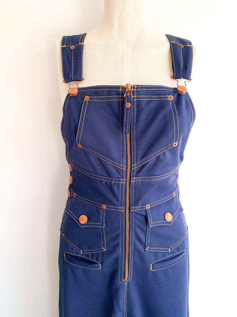 Overall maxi dress from Jean Paul Gaultier Jeans. Dark navy blue with copper hardware. Fitted and fabulous.