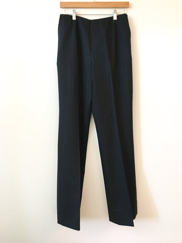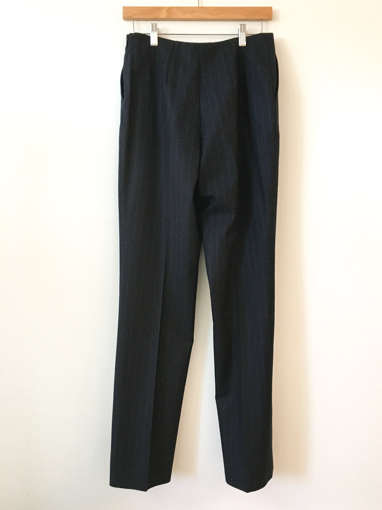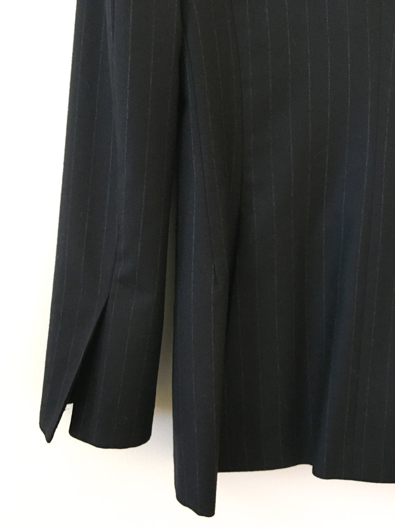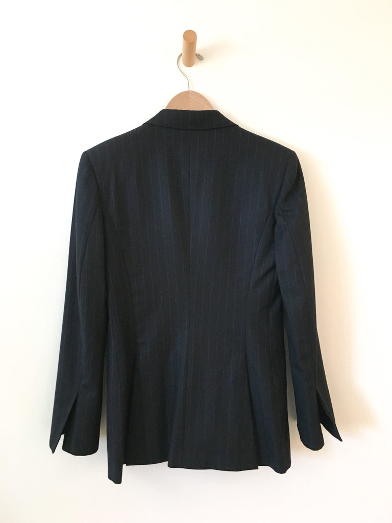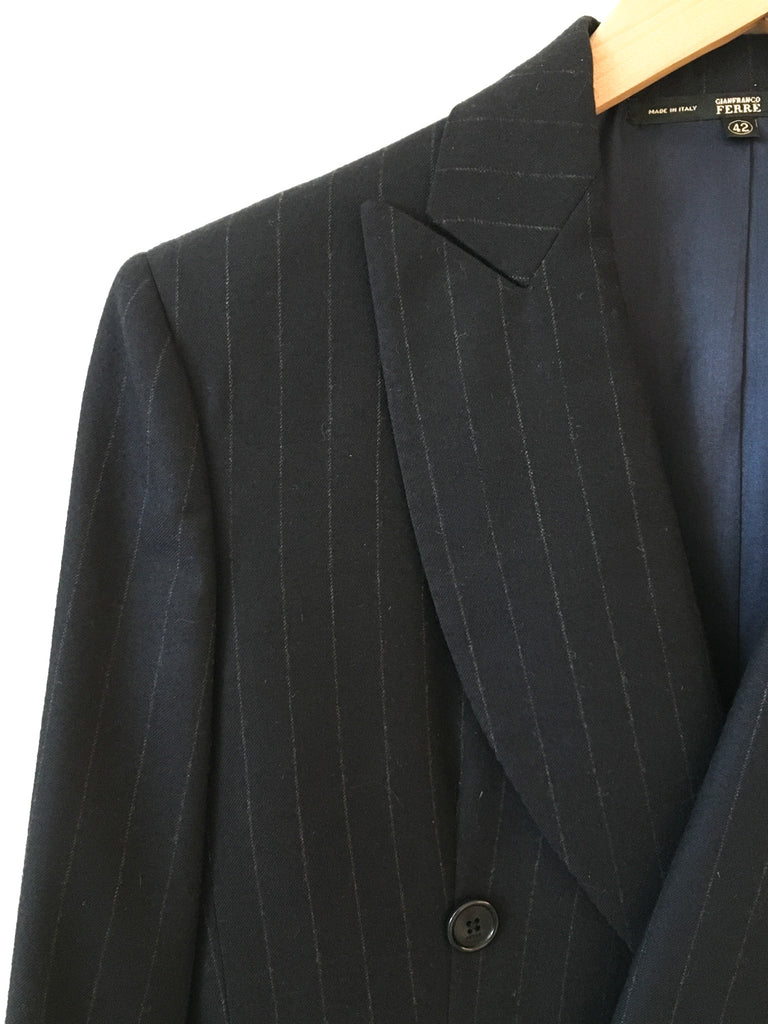 Classic with a twist. The cuffs of this chalk stripe Gianfranco Ferré navy blazer are an interesting, flattering cut. Softest wool perfection with gorgeous luxurious silk lining. Pair this blazer with denim and a vintage t-shirt. It’s all about the fit and this double breasted blazer is the BEST fit.