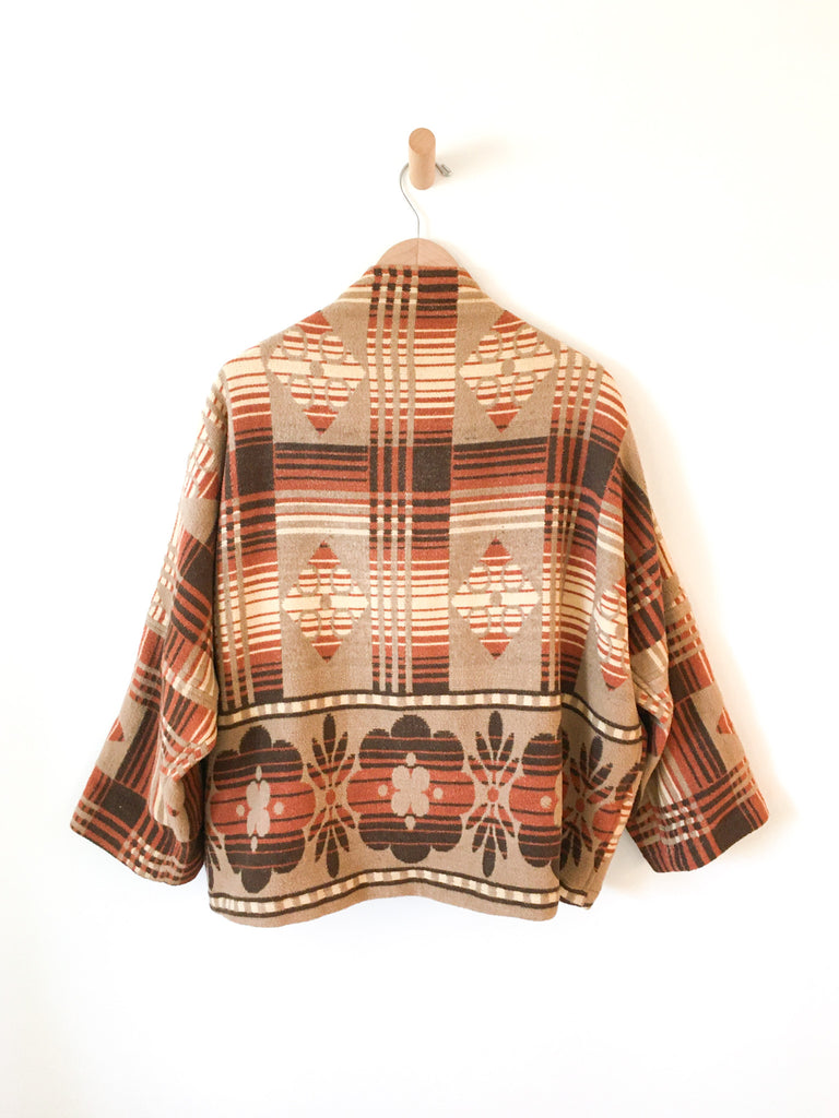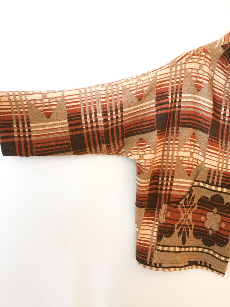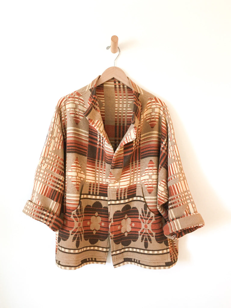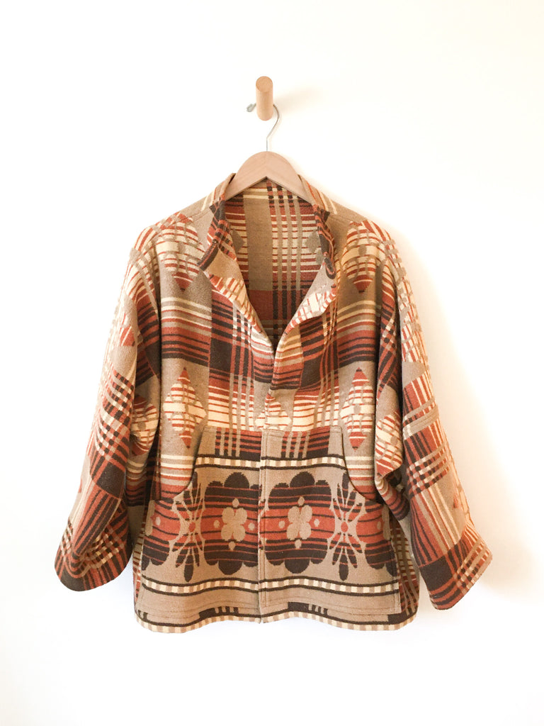 Carny Couture Studio designed blanket jacket with front pockets. Rich earthy shades evoking a summer campfire. Handmade locally here in Los Angeles by our talented seamstress. This pattern is exclusive to Carny Couture and is called the “Amelia” jacket after Brooke’s paternal Grandmother or “Tūtū”. An easy layering piece to wear year-round.
