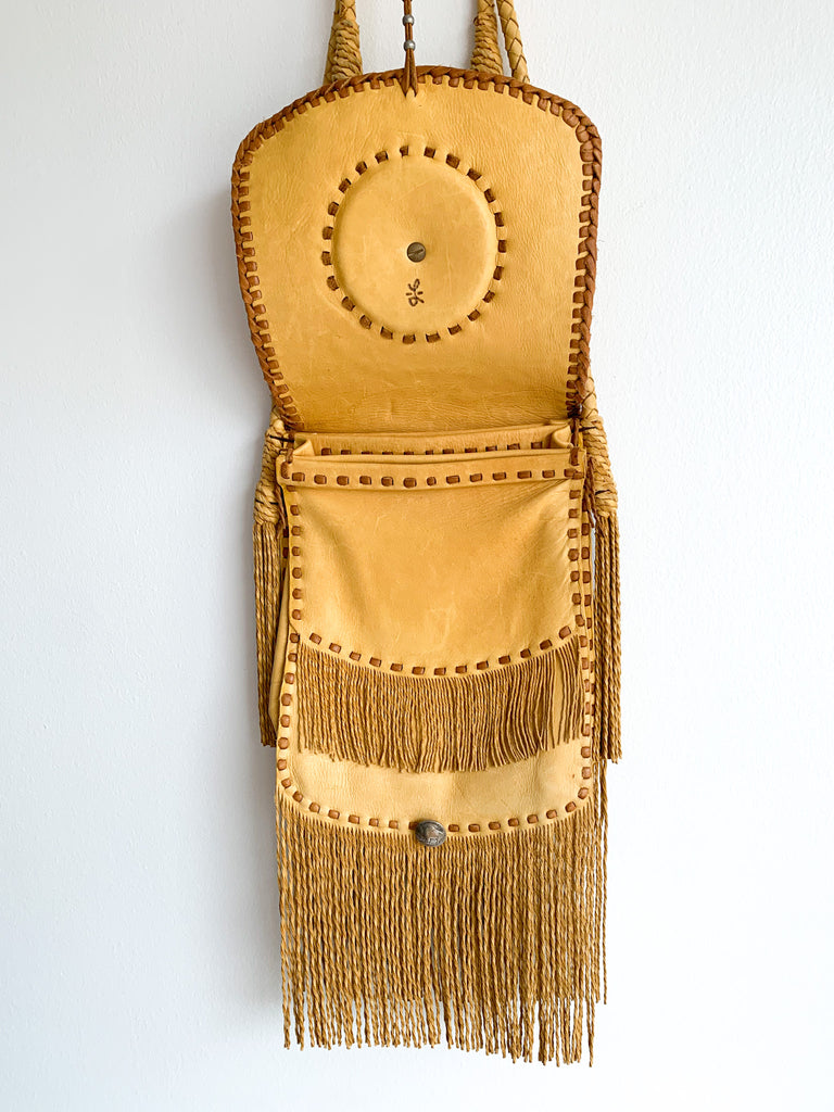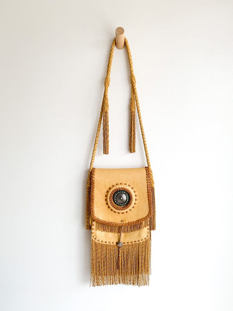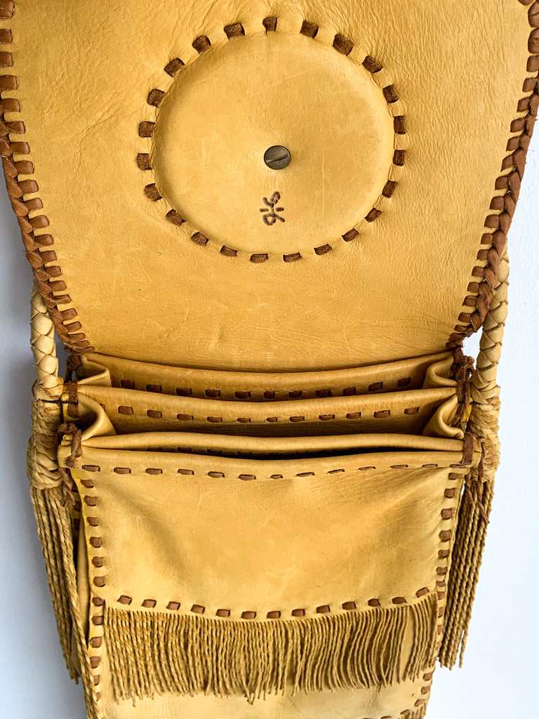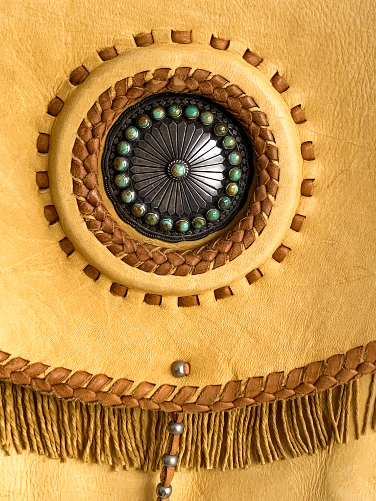 Special one-of-a-kind, hand-made deerskin hand bag featuring sterling and turquoise details and Buffalo nickel. Made by master crafters Brenda and Steve Lampman with artist Aaron Anderson expert silversmithing.