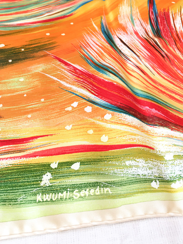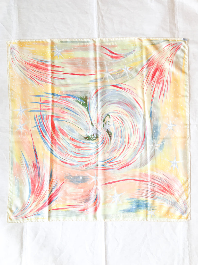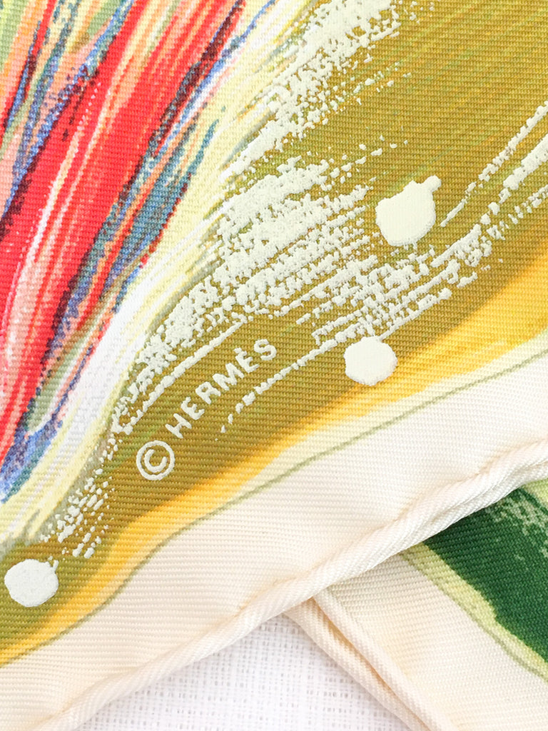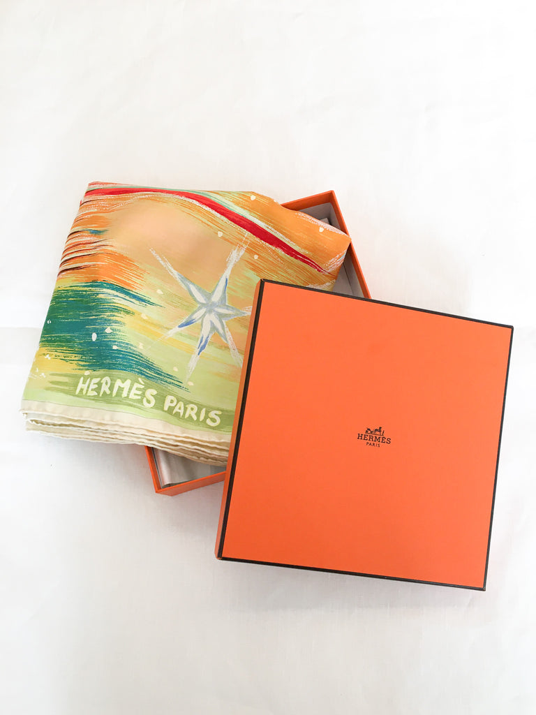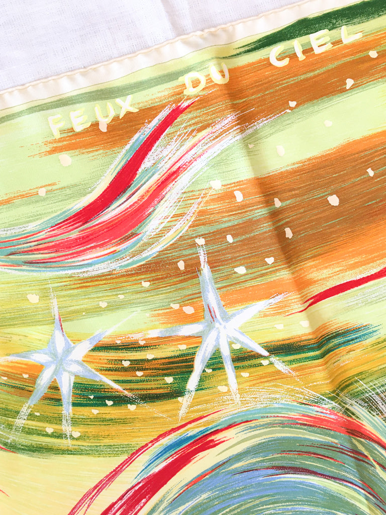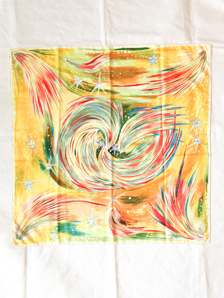 The Hermes “Feux Du Ciel” scarf was designed in 2000 by Sefedin Ibrahim Alamin to celebrate the new millennium. Meaning “Fires of Heaven,” this Fuex Du Ciel silk scarf draws on a celebratory palette of yellow, orange, red and green inspired by fireworks against a starry night sky.