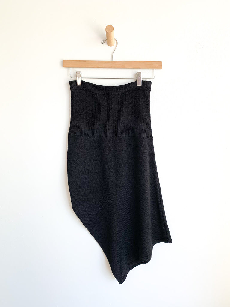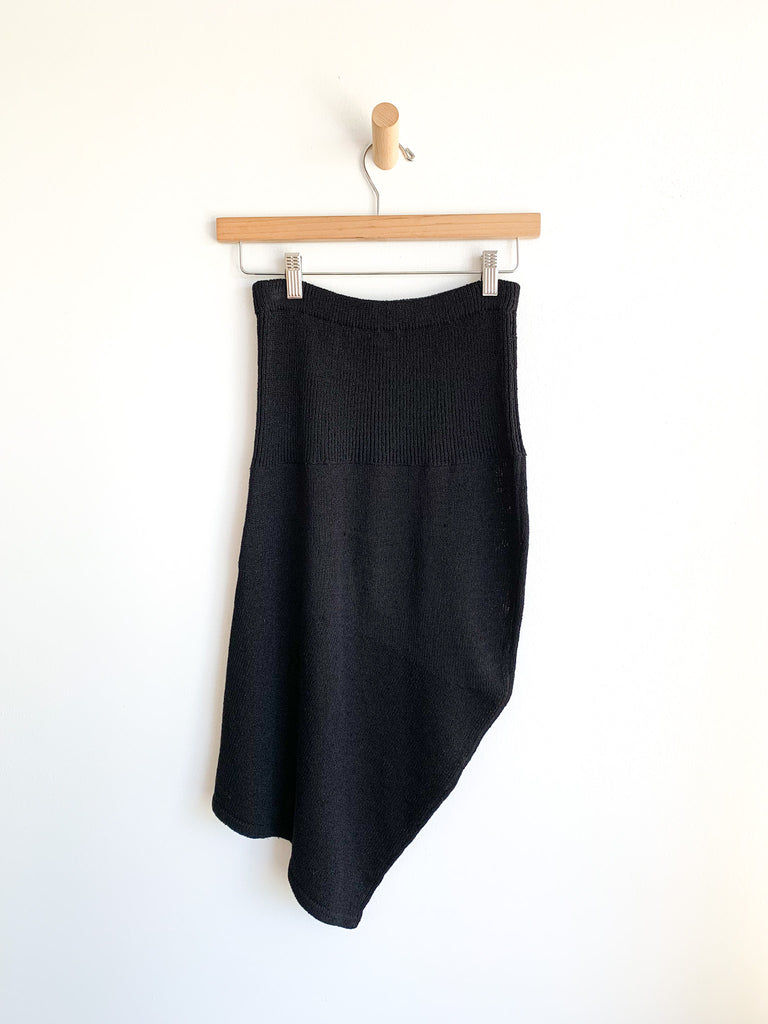 Iconic knit asymmetrical skirt and top ensemble.