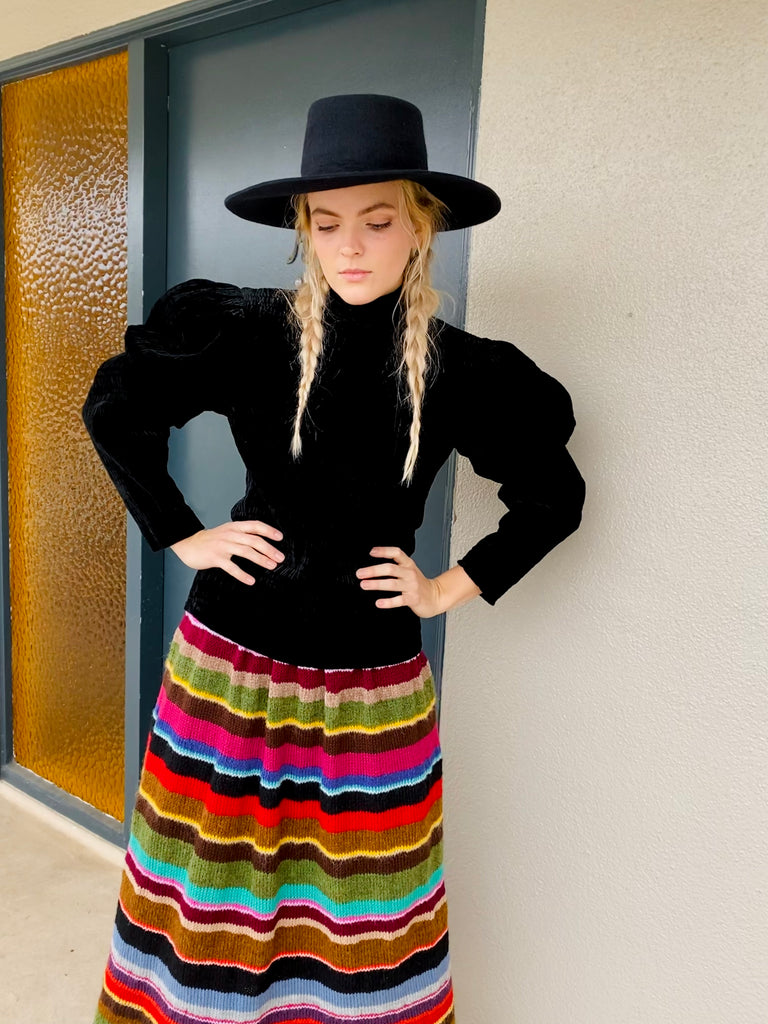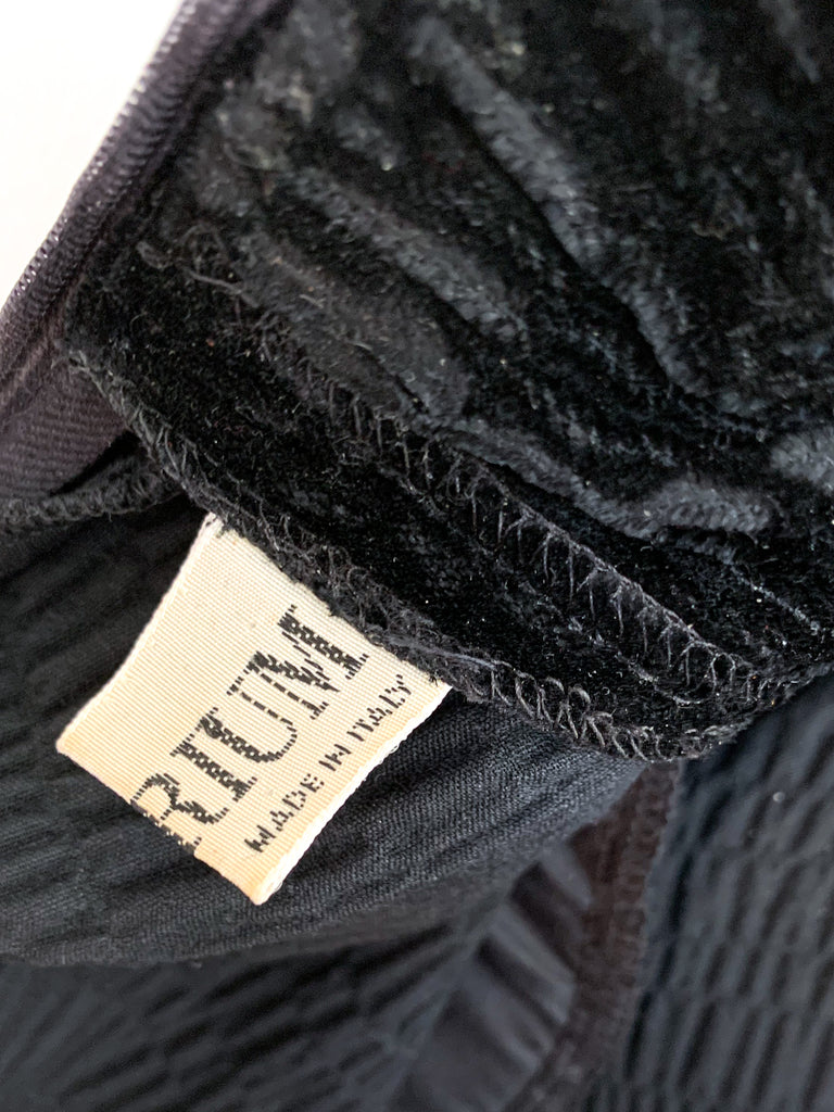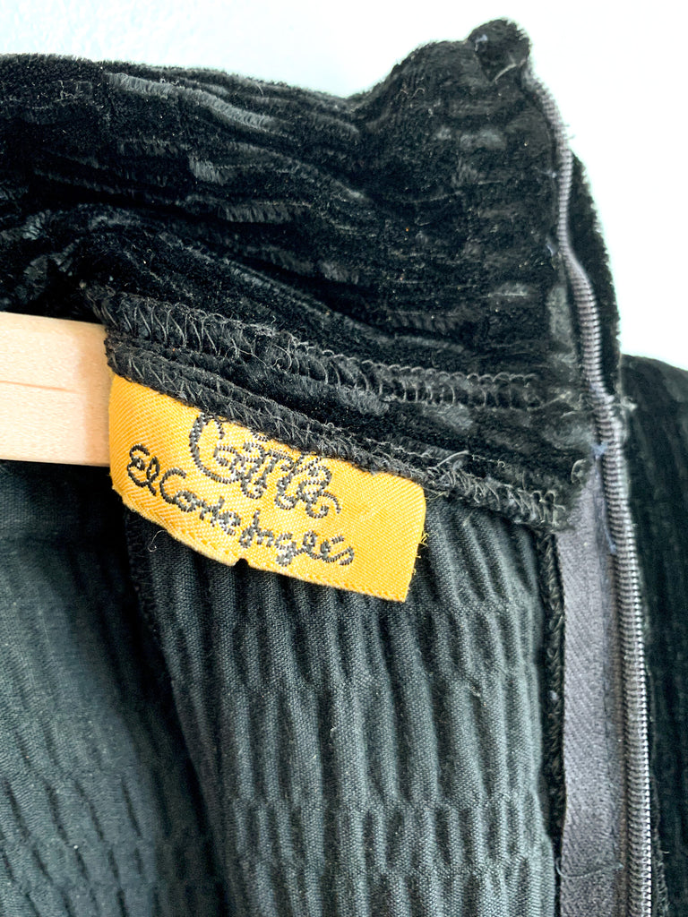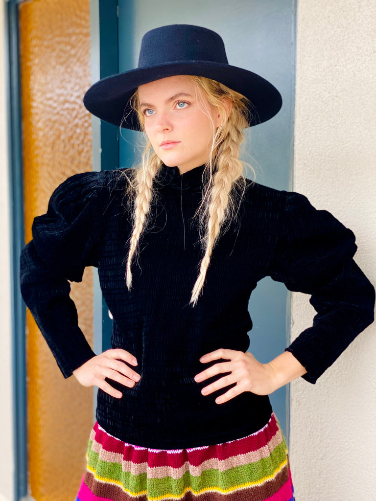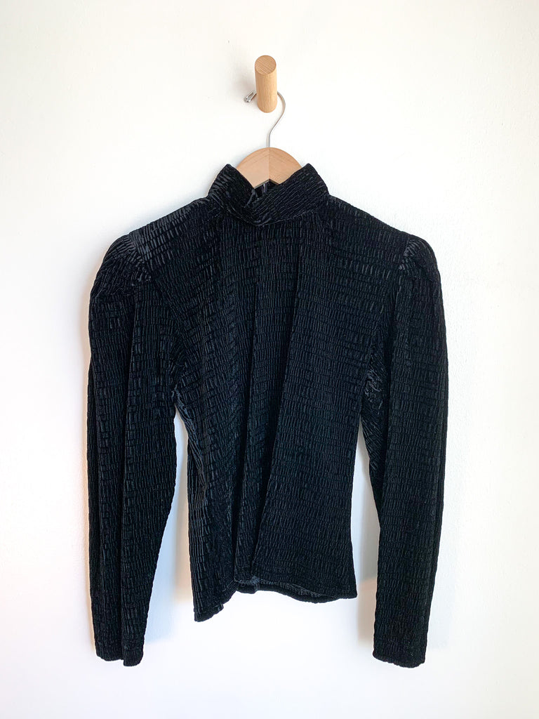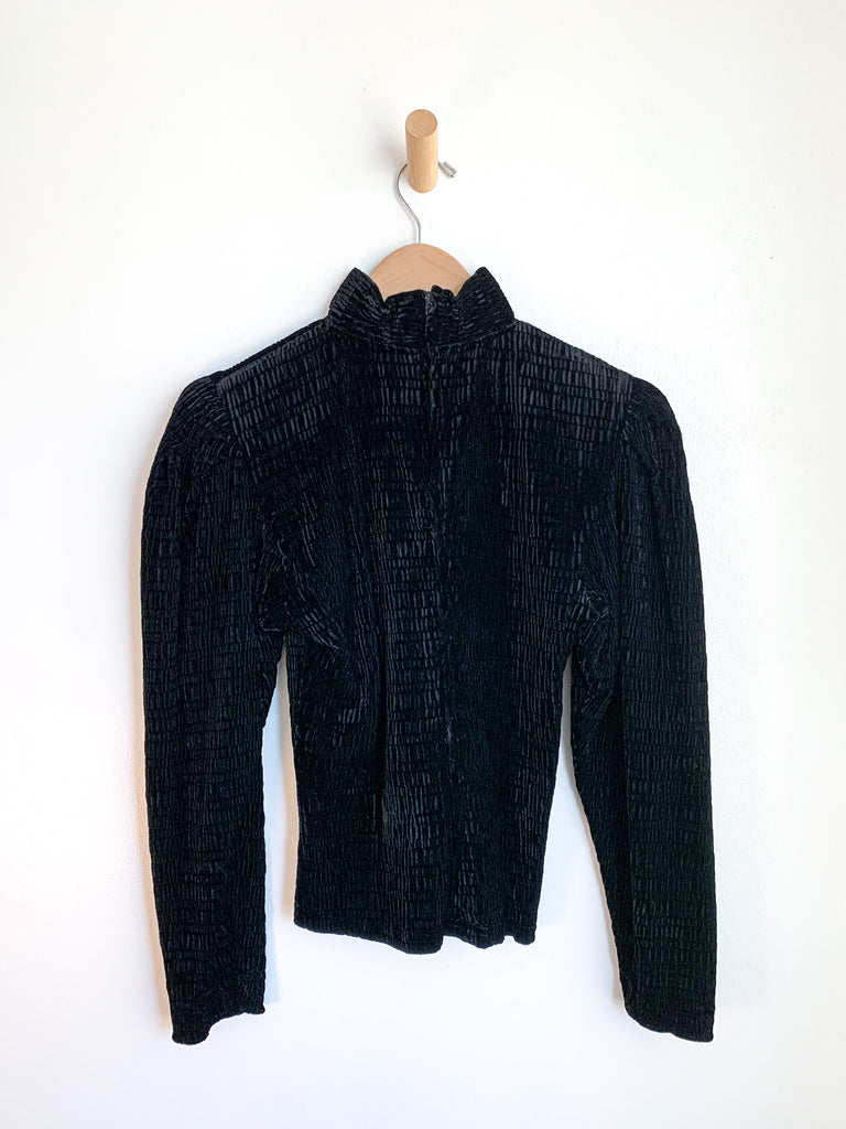 High neck, puffy shoulders long sleeve velvet blouse. Zips up the back. Very dramatic with copious smocking over the entire garment.