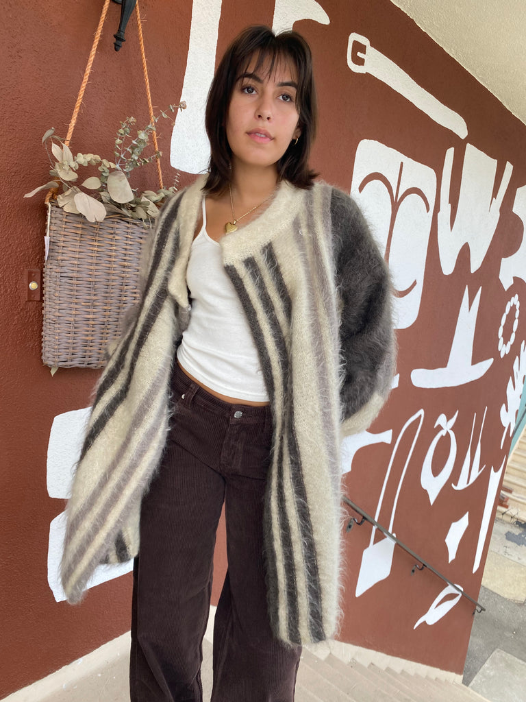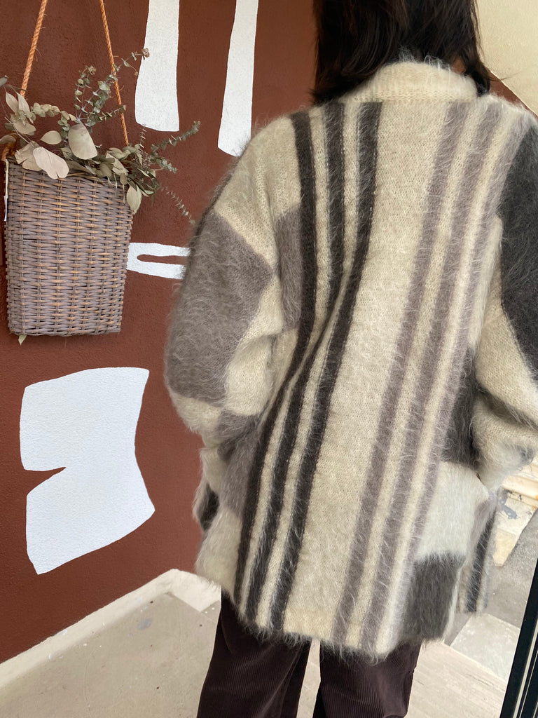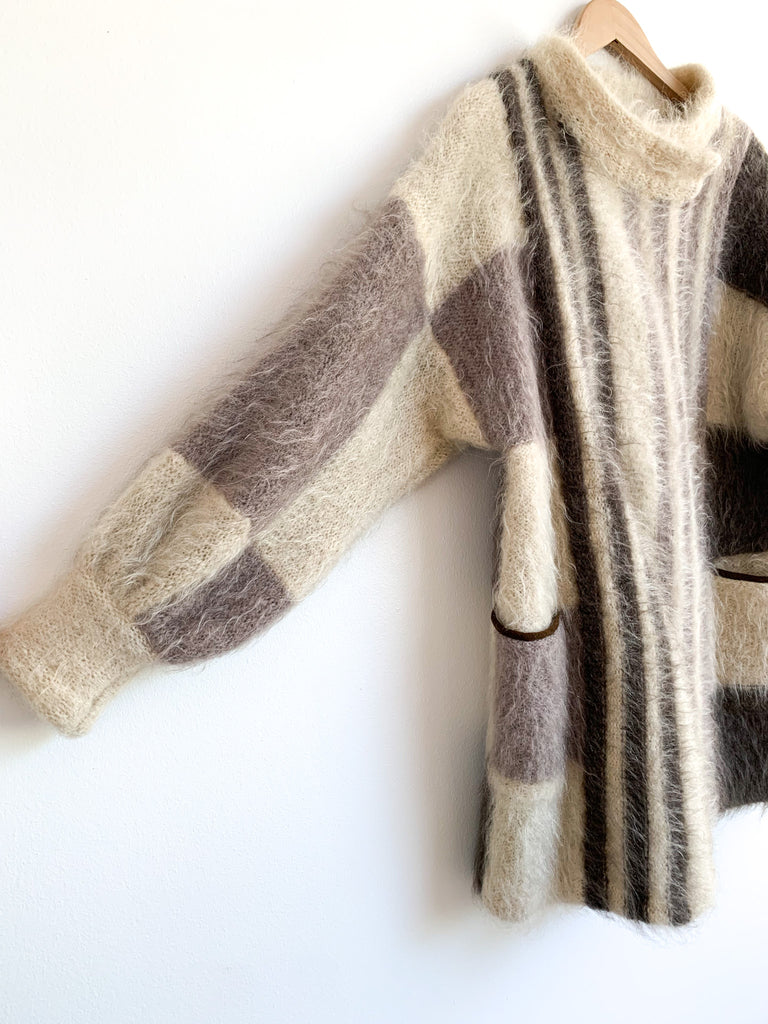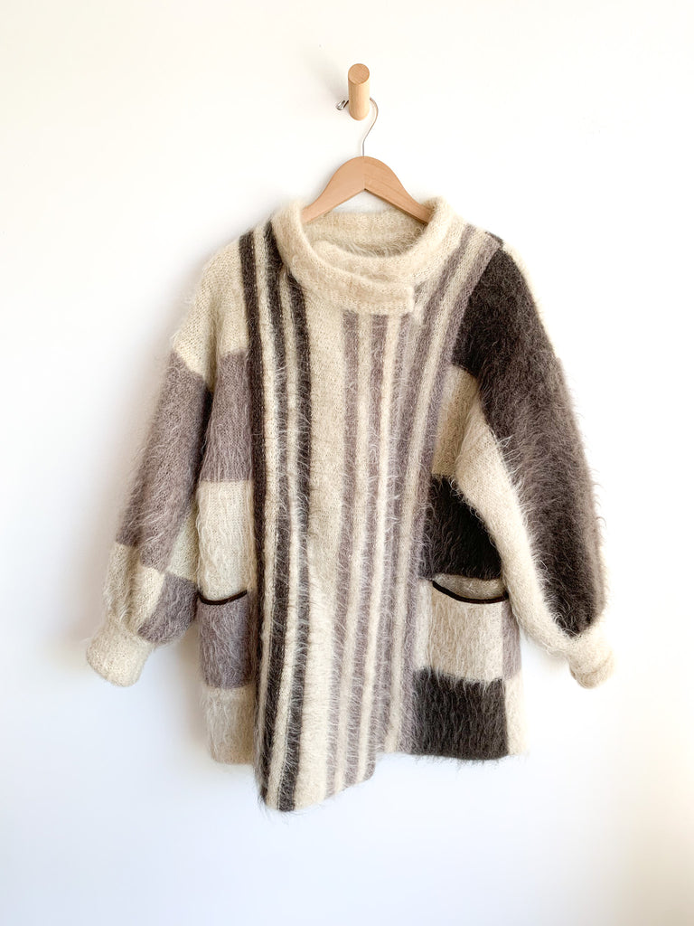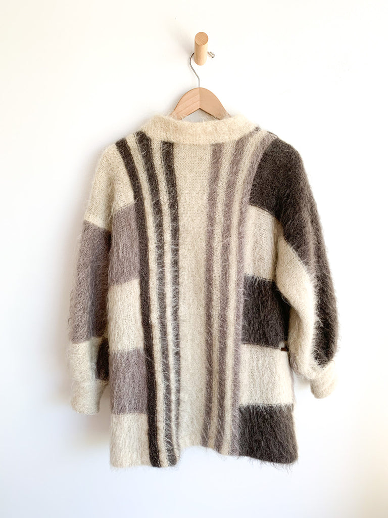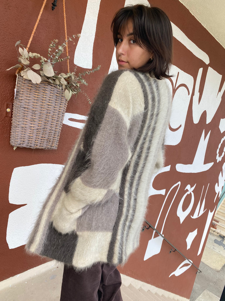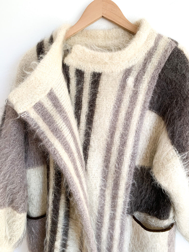 Truly unique, cozy and timeless mohair cardigan in neutral ivory, charcoal and grey graphic color block. Front pockets and hook closure at neck. Sleeves are cuffed with a slight balloon. Big fit, in a good way.
