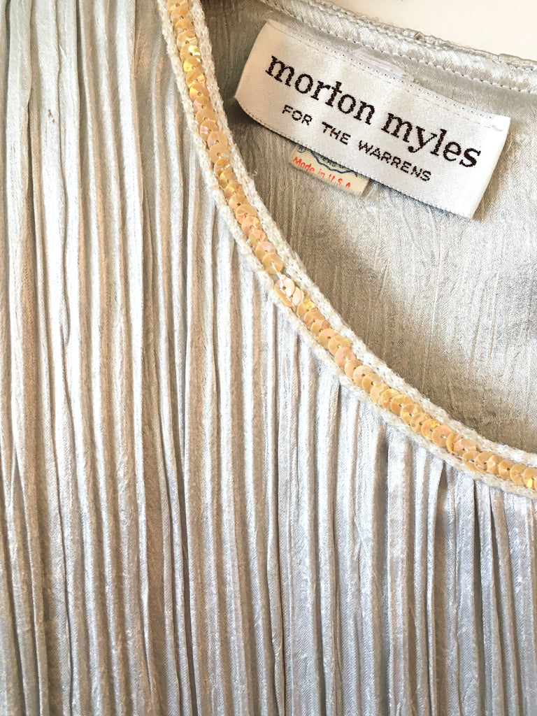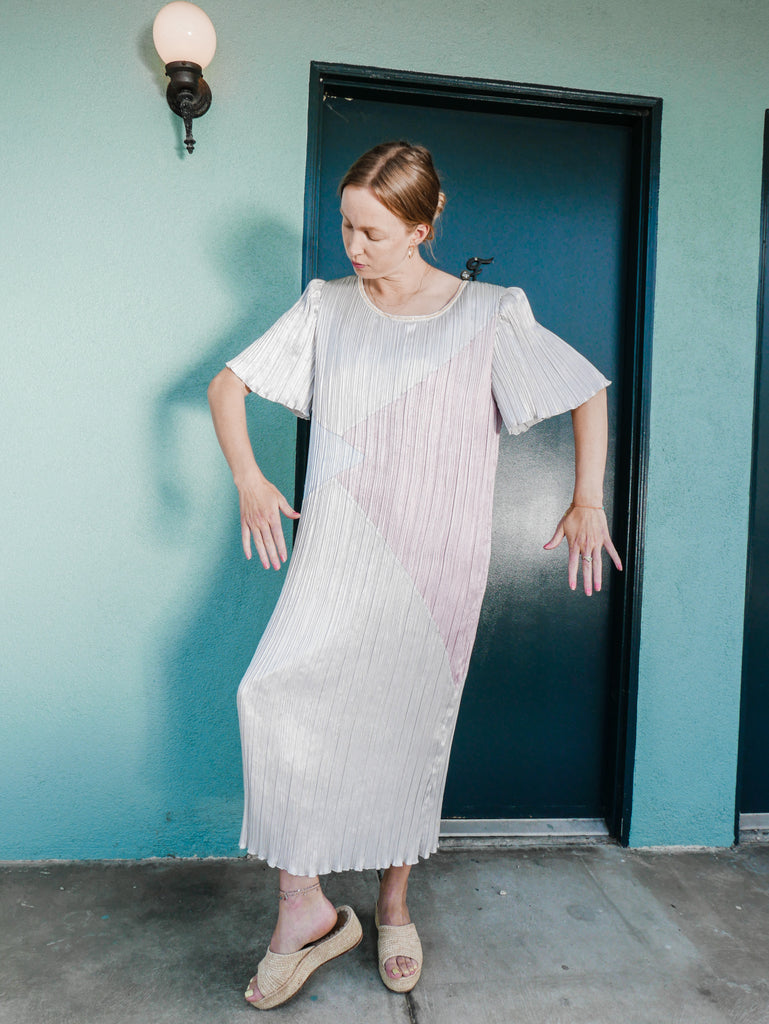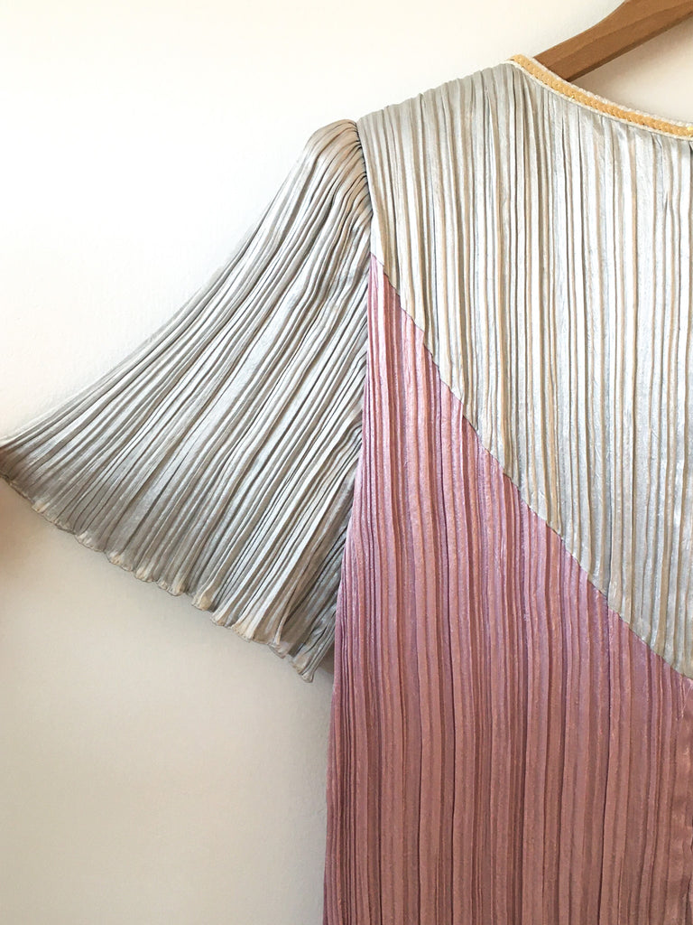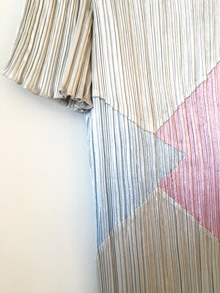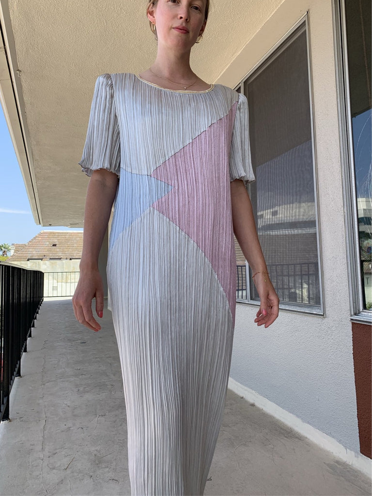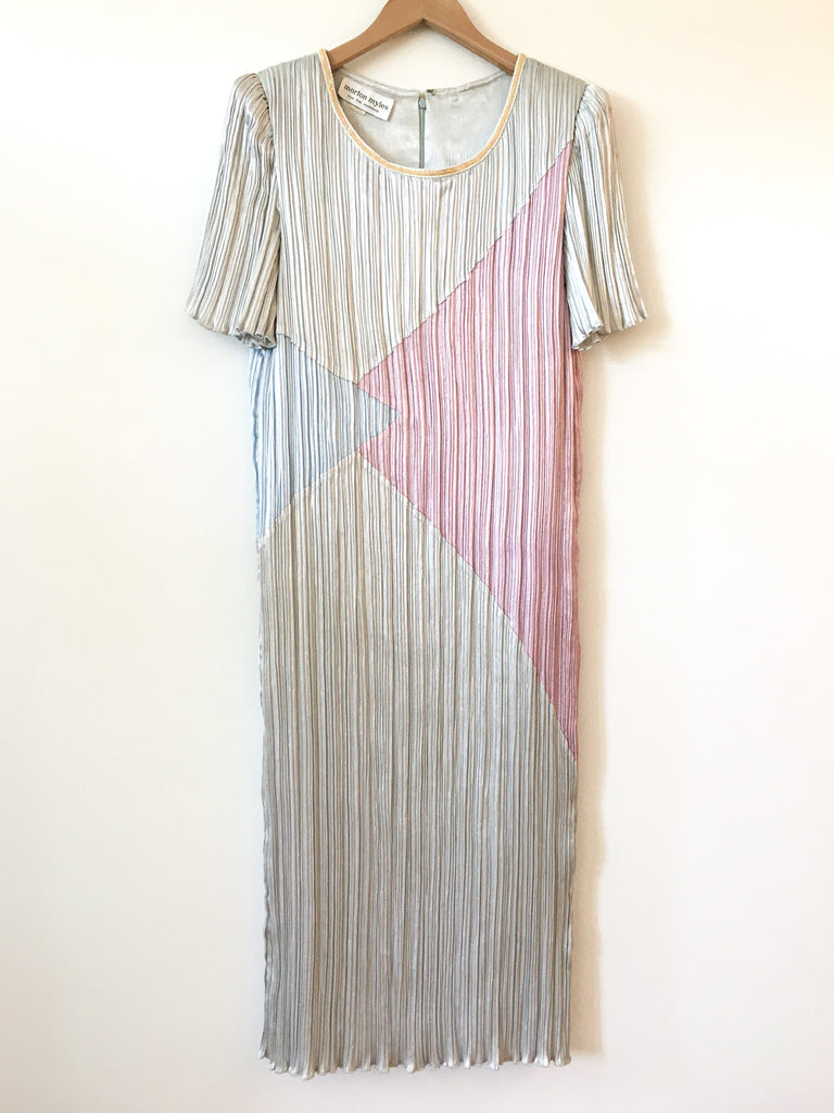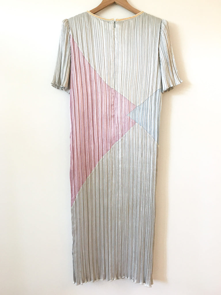Pleated 1980’s pastel color block column dress with short trumpet sleeves, back zips and sequins at round neckline.