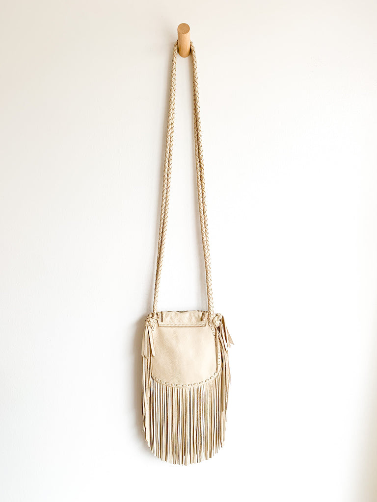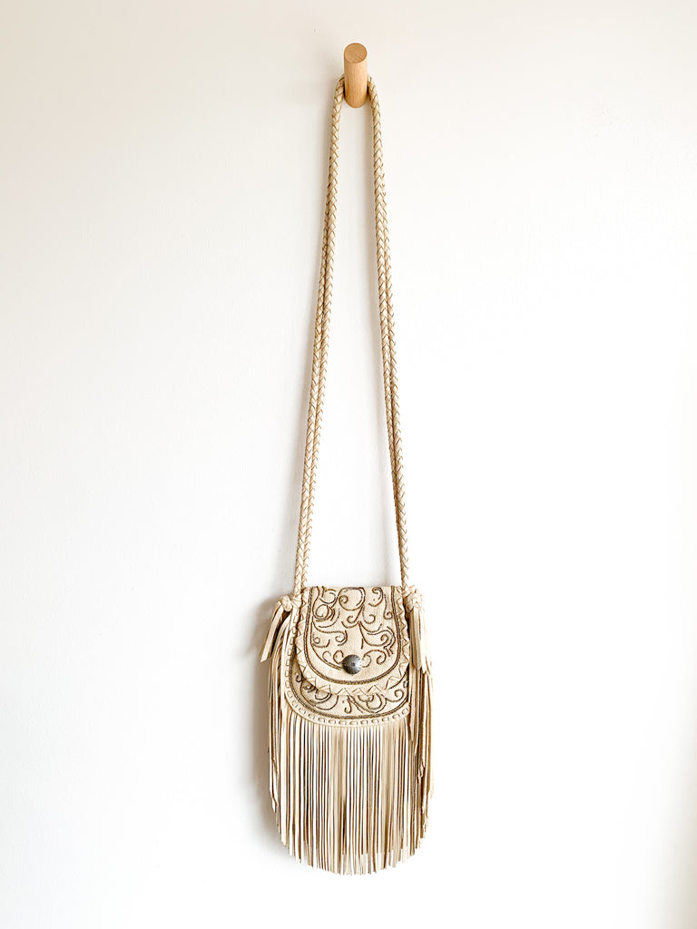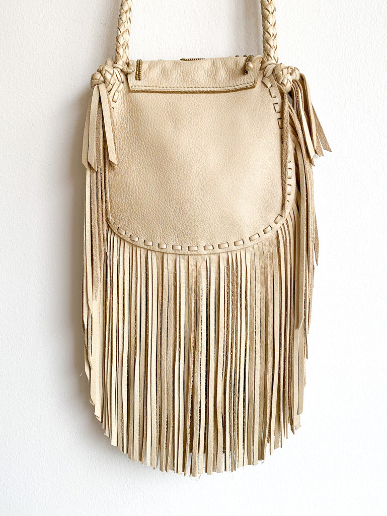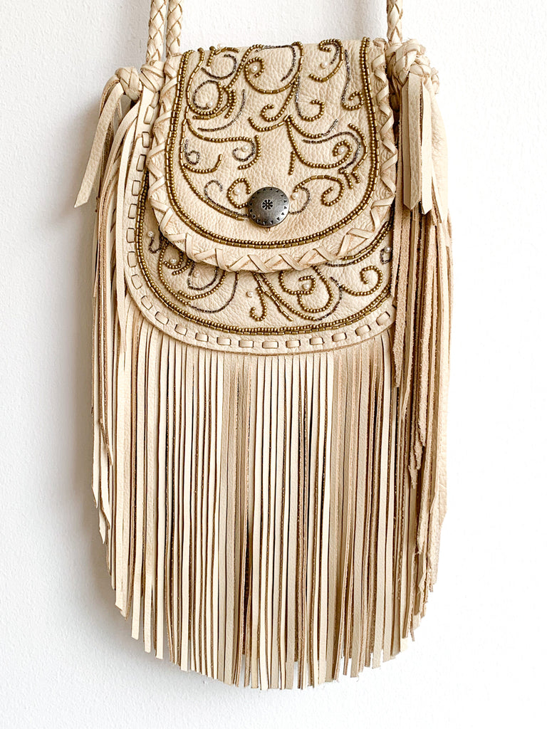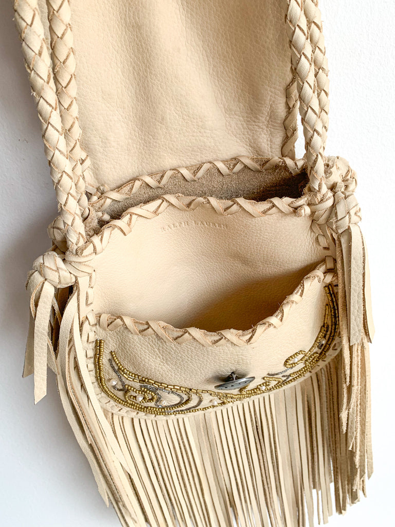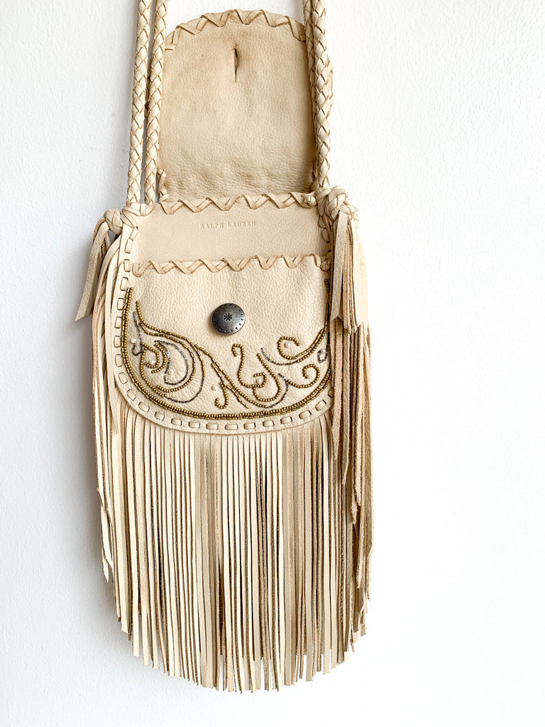 Unused pearl and bead embellished, fringed Ralph Lauren cross body purse in cream deerskin leather. High-end quality.