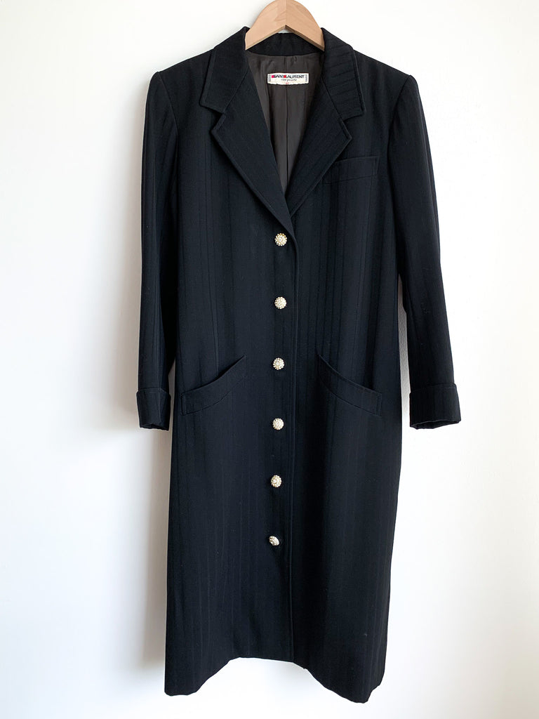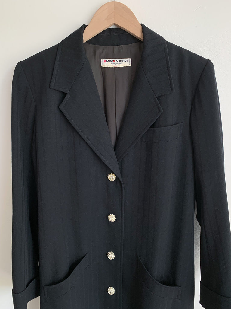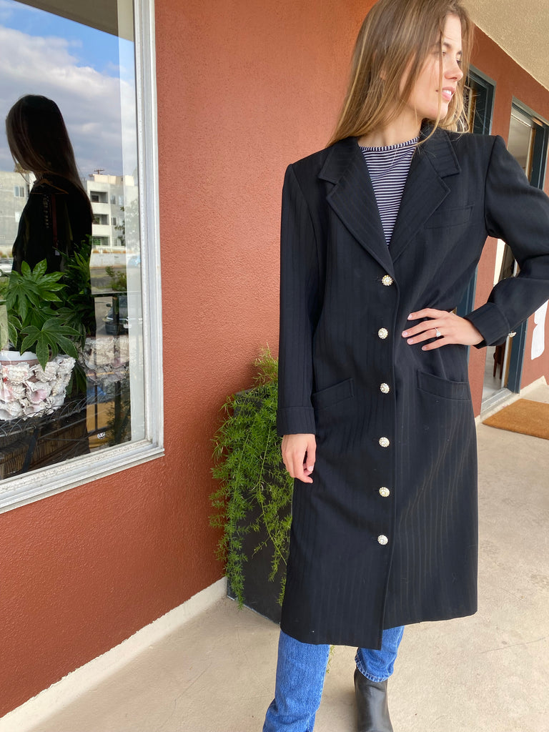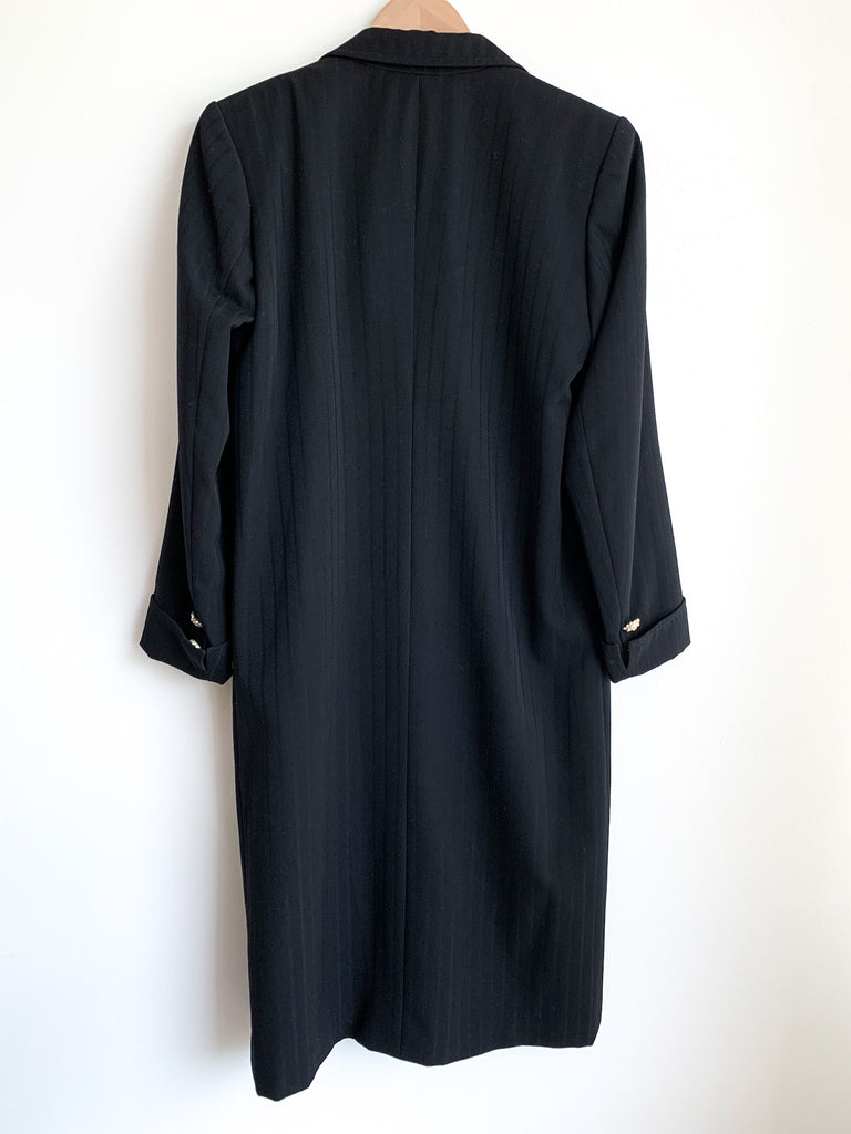Structured lapel black on black vertical stripes long fitted blazer. Front breast pocket, notched lapel, angled pockets. Rhinestone embellished buttons. Can be worn as a dress or a duster jacket.