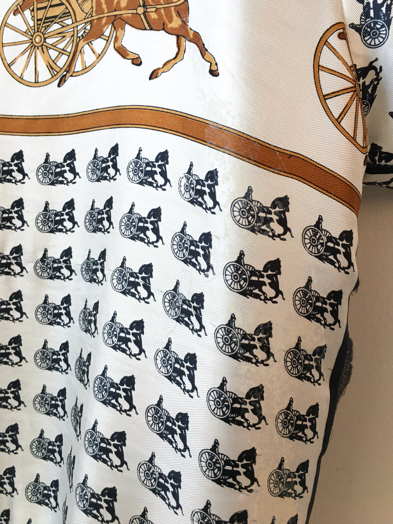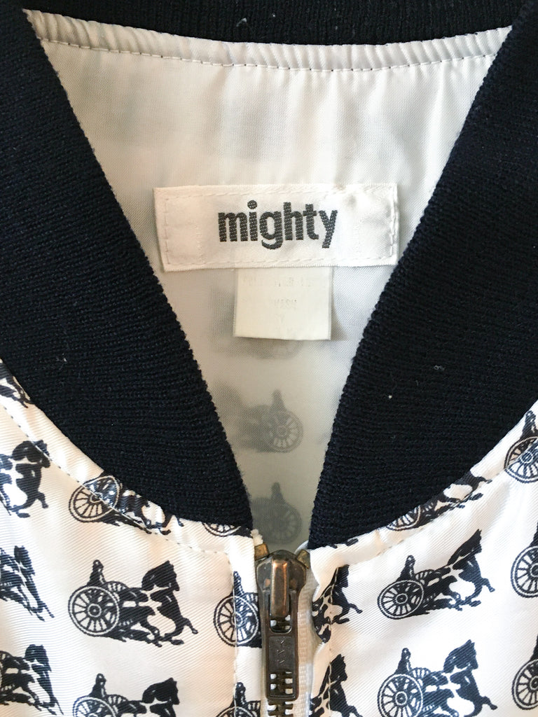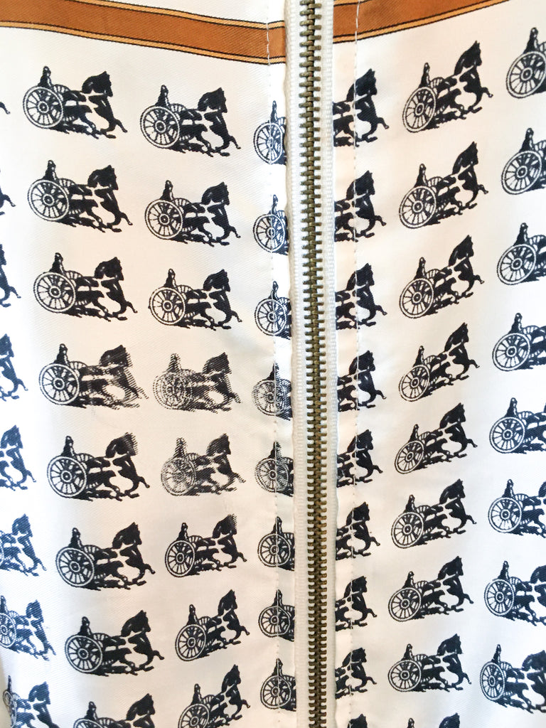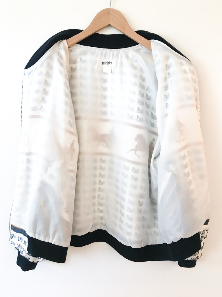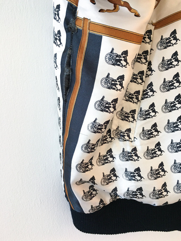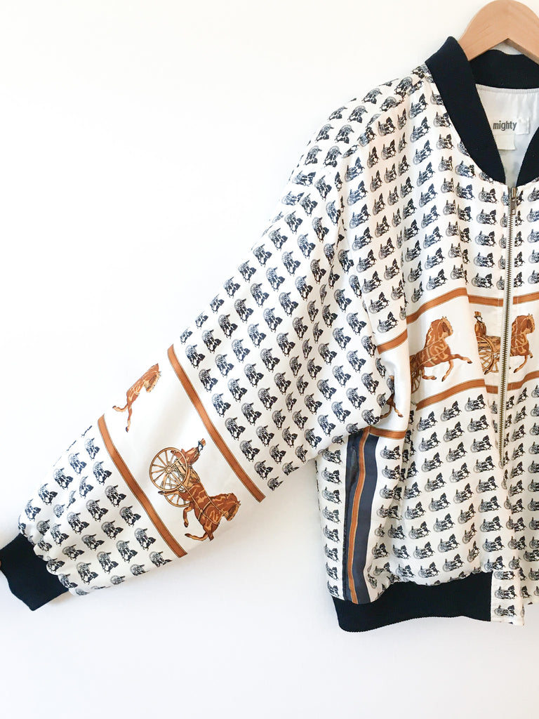 Lightweight silky smooth 1980’s zip up bomber jacket with shoulder pads and Hermes-inspired horse harness racing print.