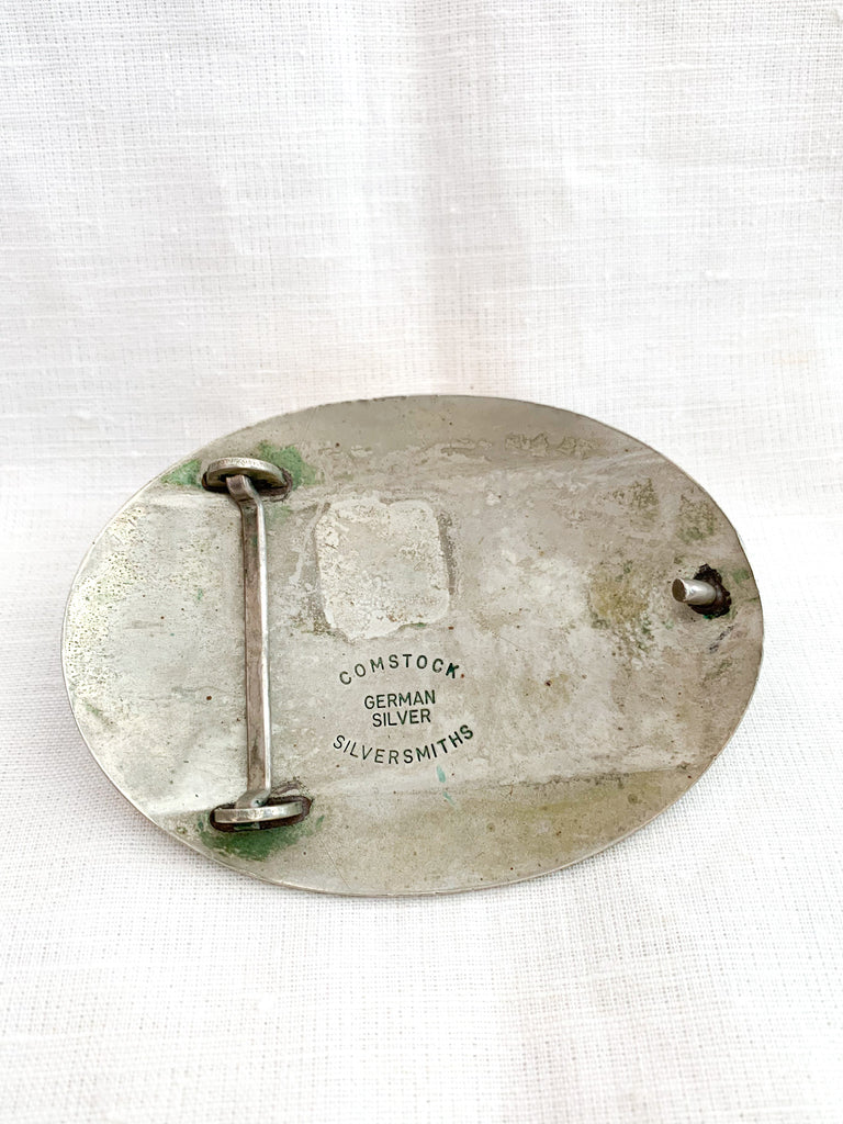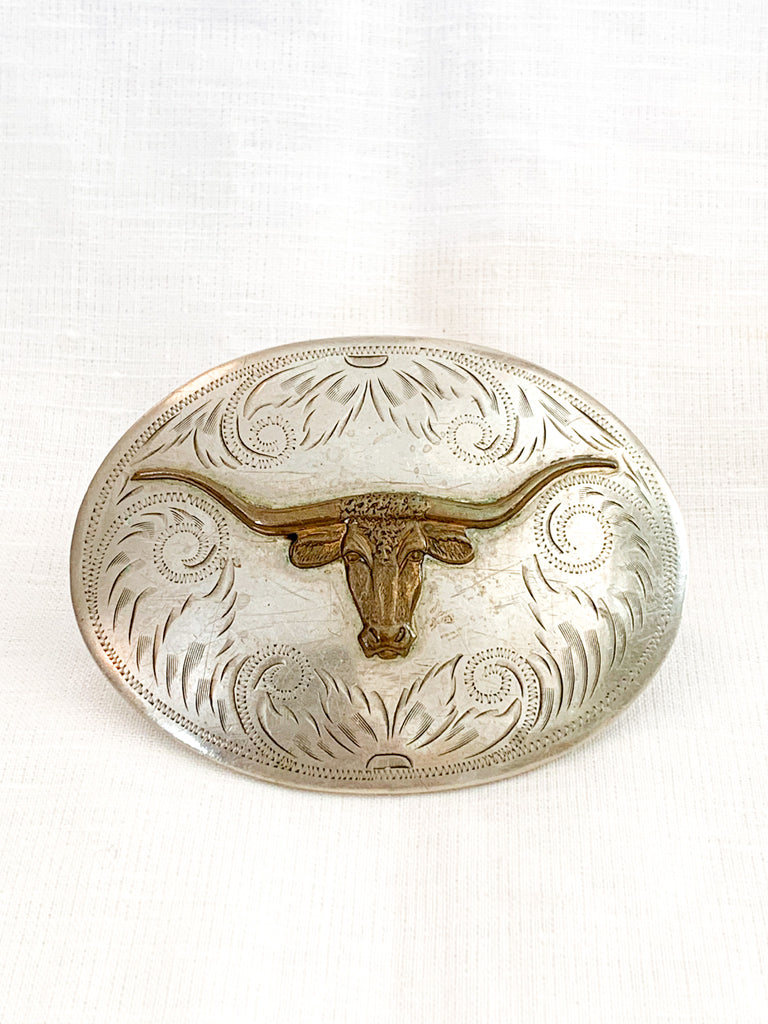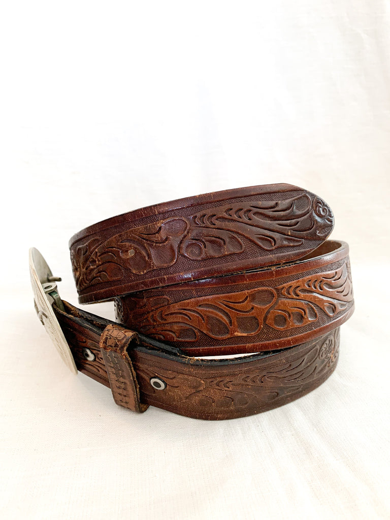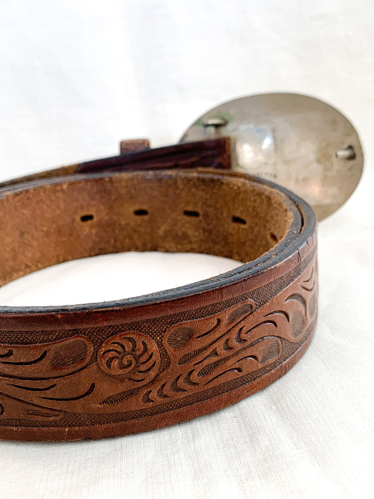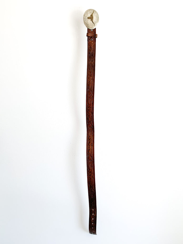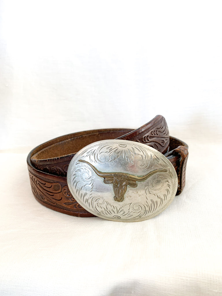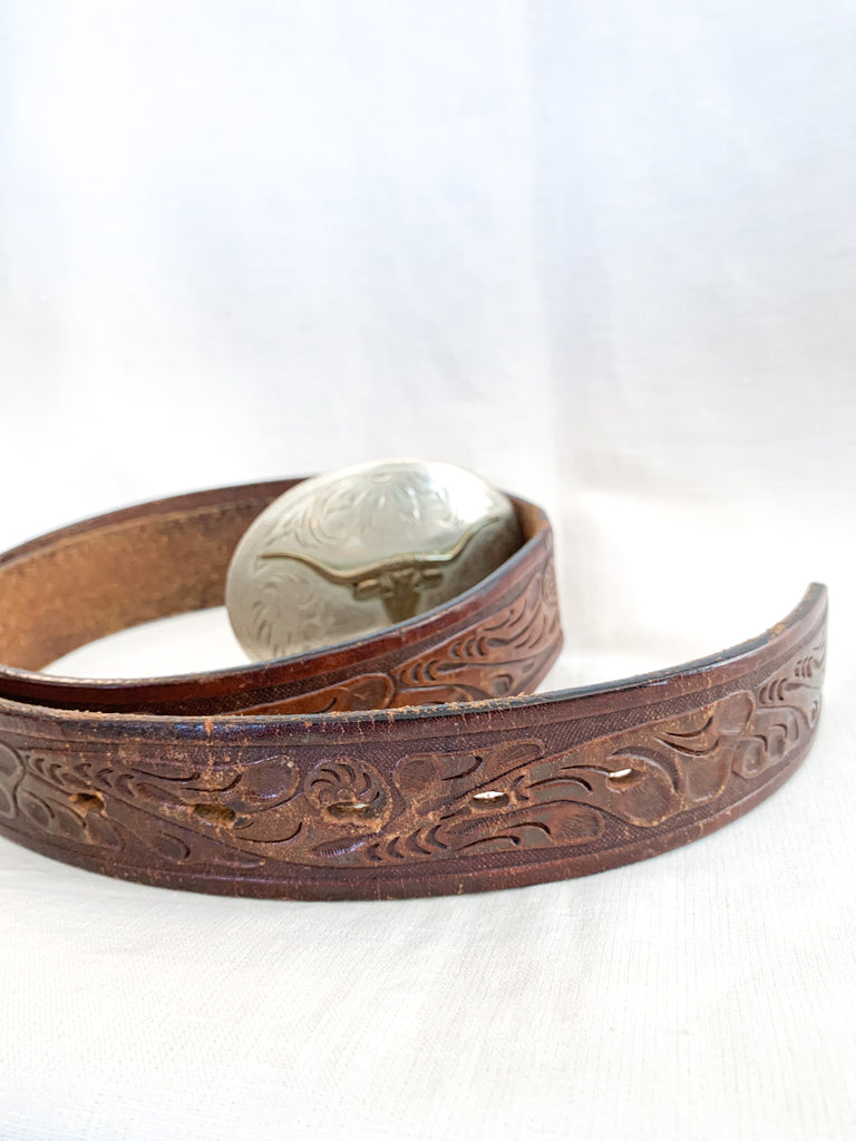Longhorn brass and ornately crafted German silver oval buckle on a tooled leather belt. Leather belt is distressed throughout.