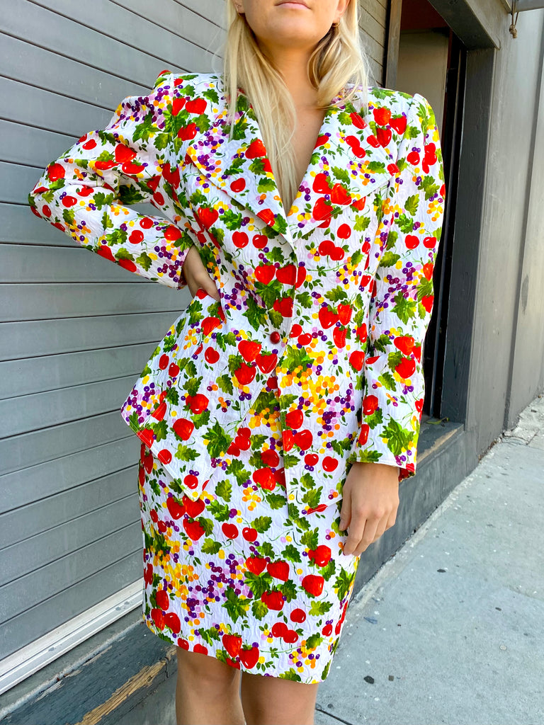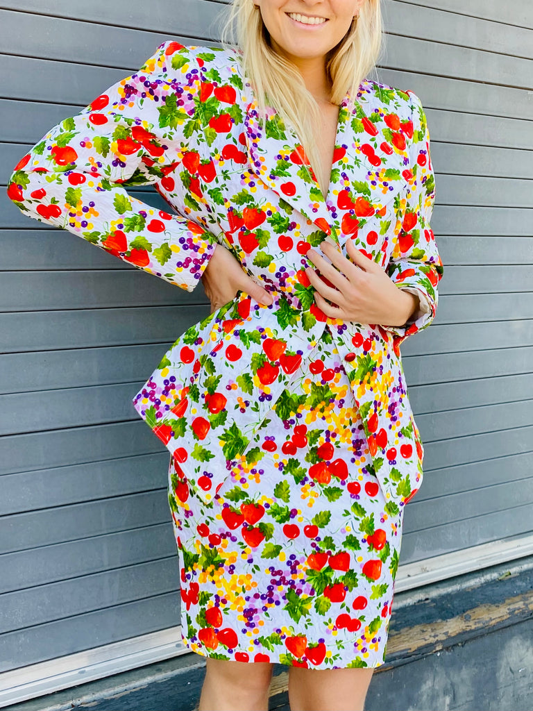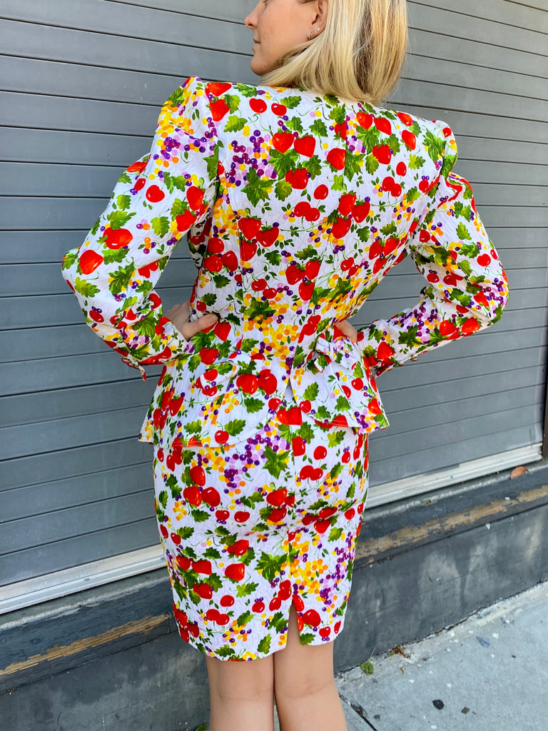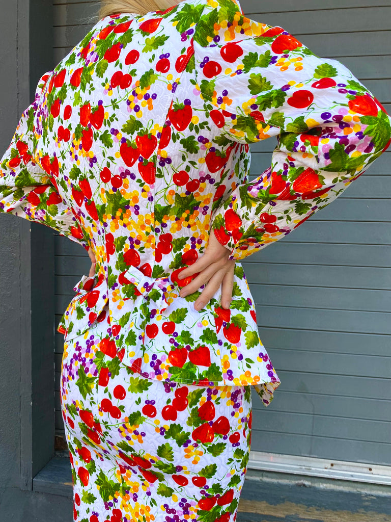 Fruit printed skirt suit. Lightly quilted cotton statement maker. Exaggerated blazer with flattering peplum fit looks great with denim as well.
