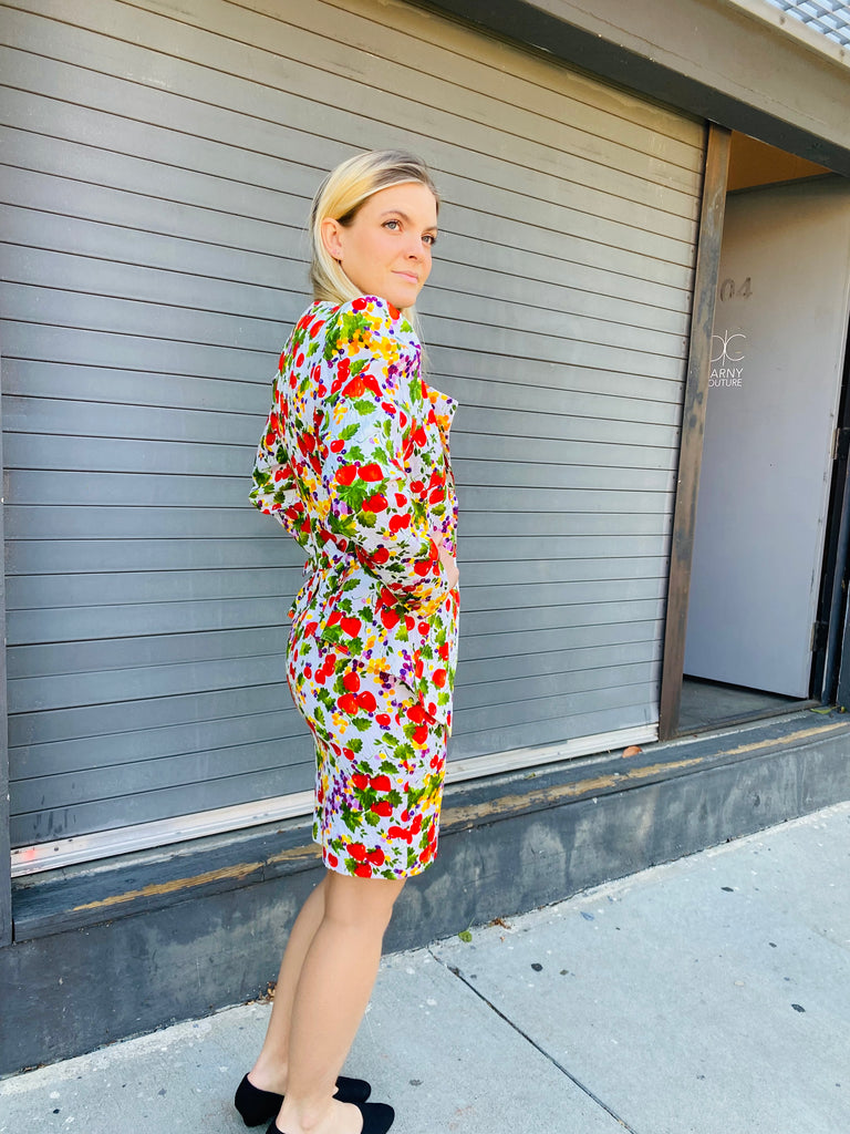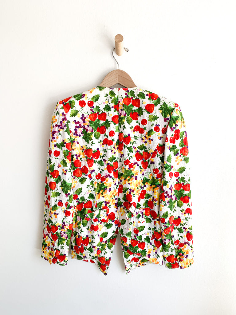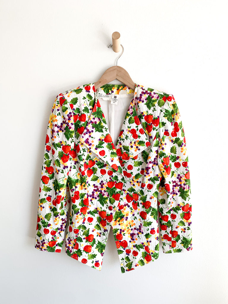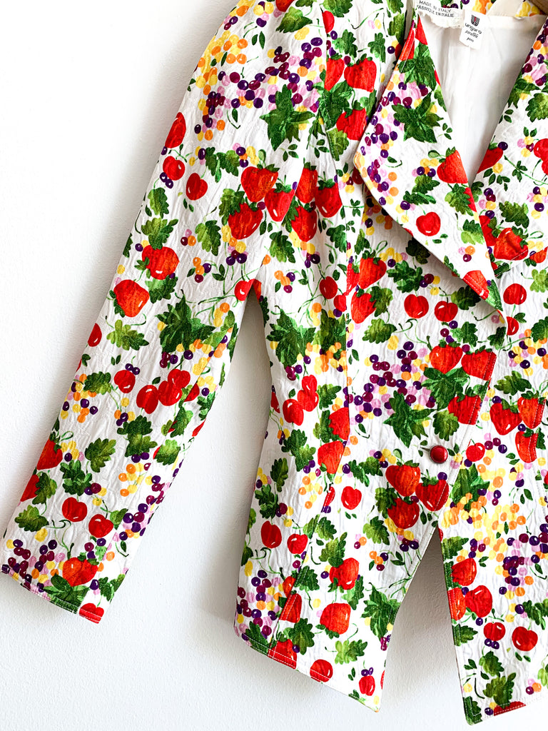 Fruit printed skirt suit. Lightly quilted cotton statement maker. Exaggerated blazer with flattering peplum fit looks great with denim as well.