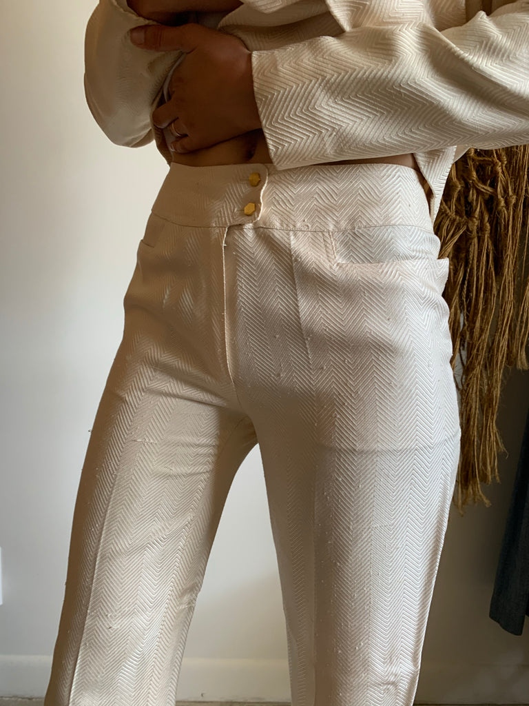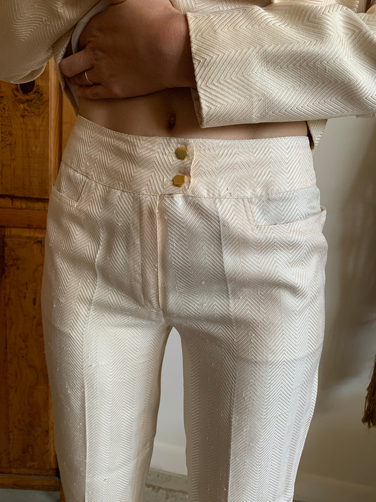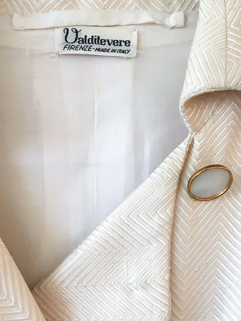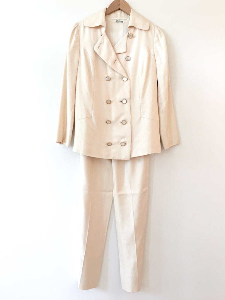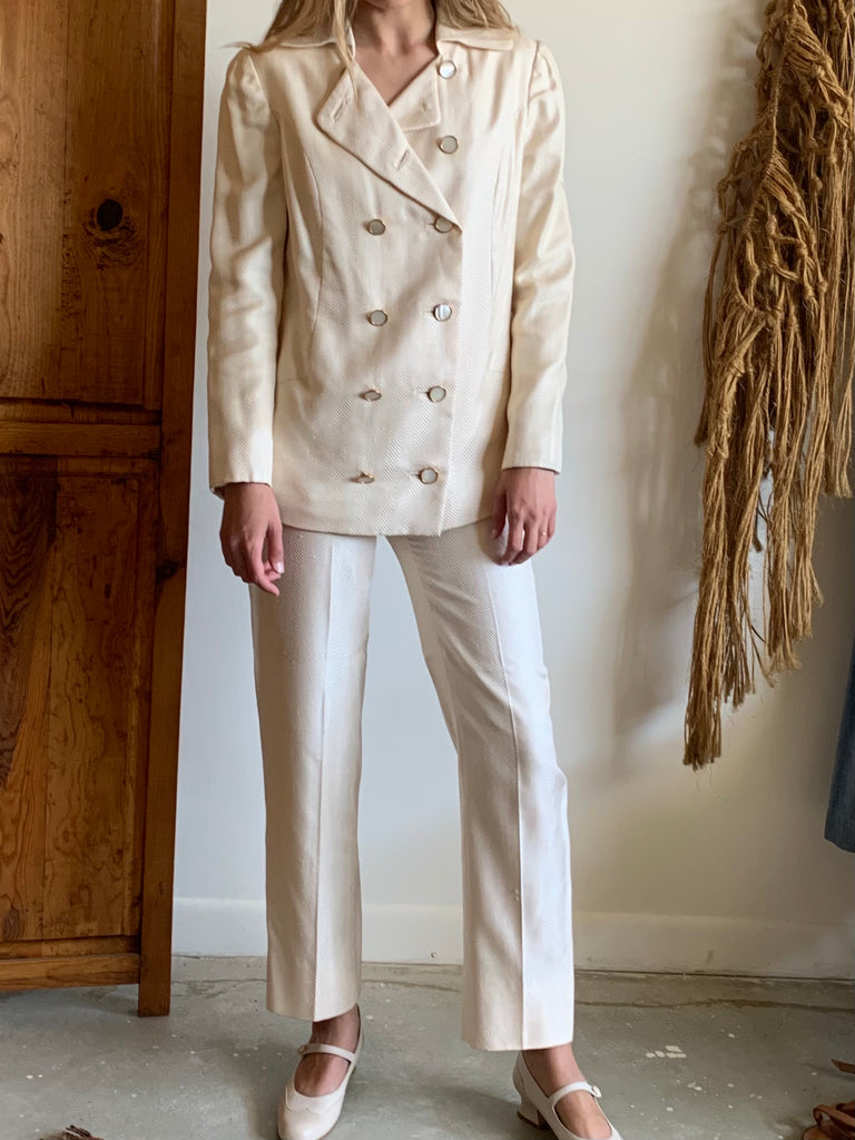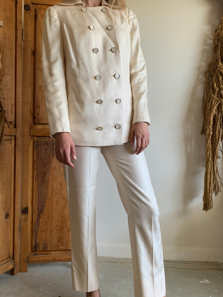 Fitted, double-breasted silk jacket and pants suit. Jacket is fully lined and pants are unlined. Handmade detailing. Italy is known for its wonderful hand-loomed silks.