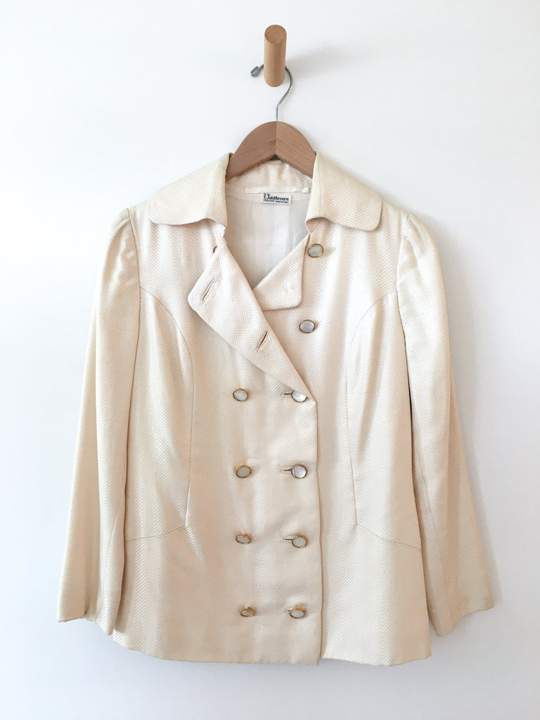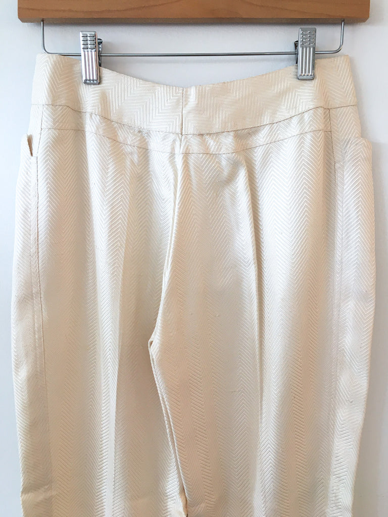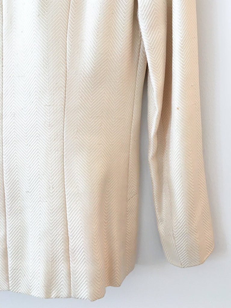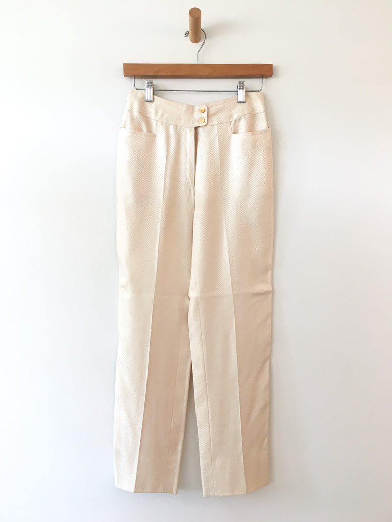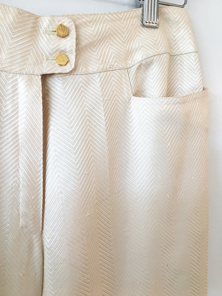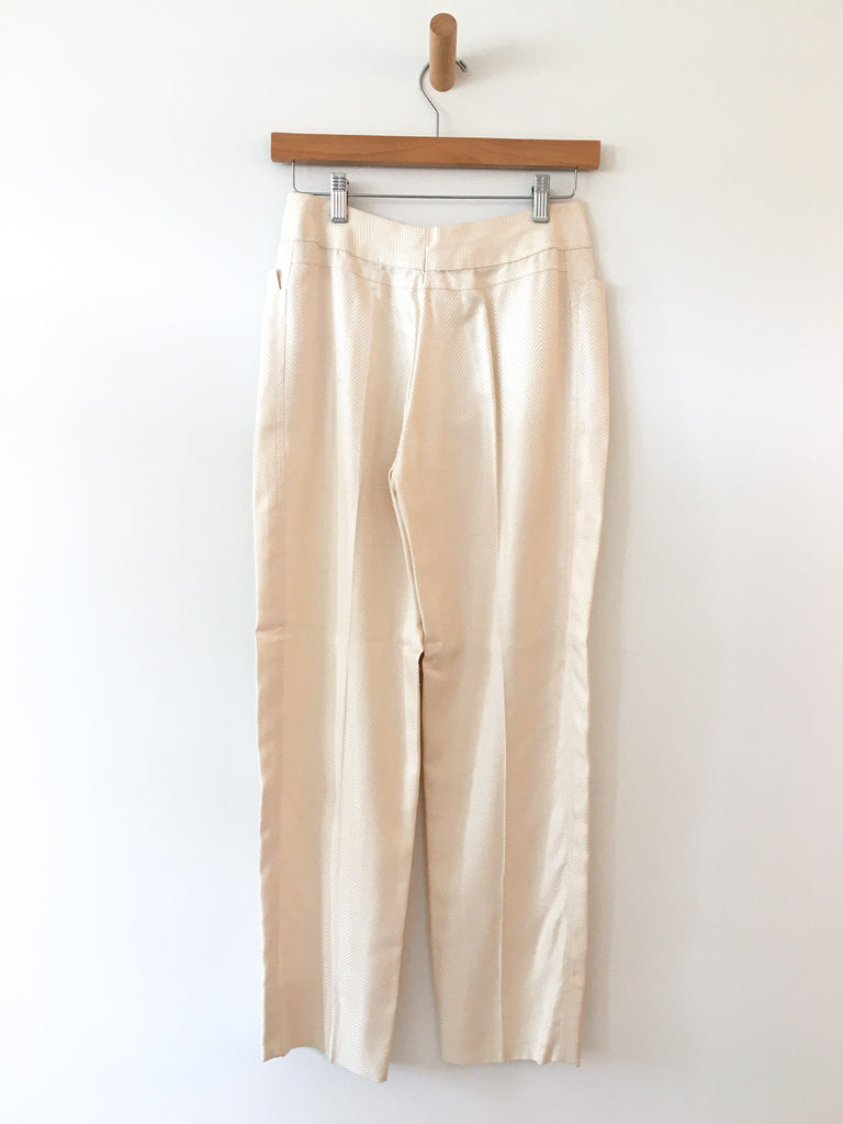 Fitted, double-breasted silk jacket and pants suit. Jacket is fully lined and pants are unlined. Handmade detailing. Italy is known for its wonderful hand-loomed silks.