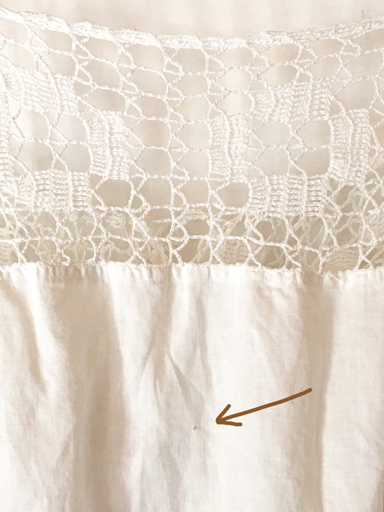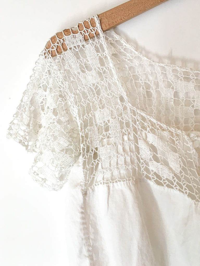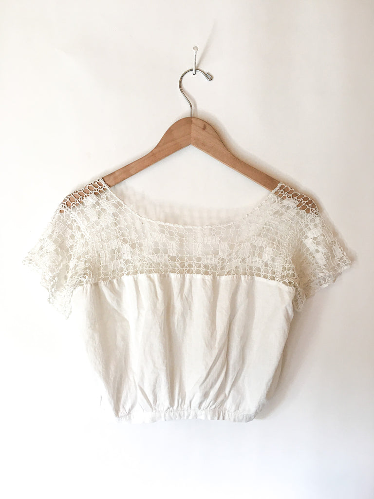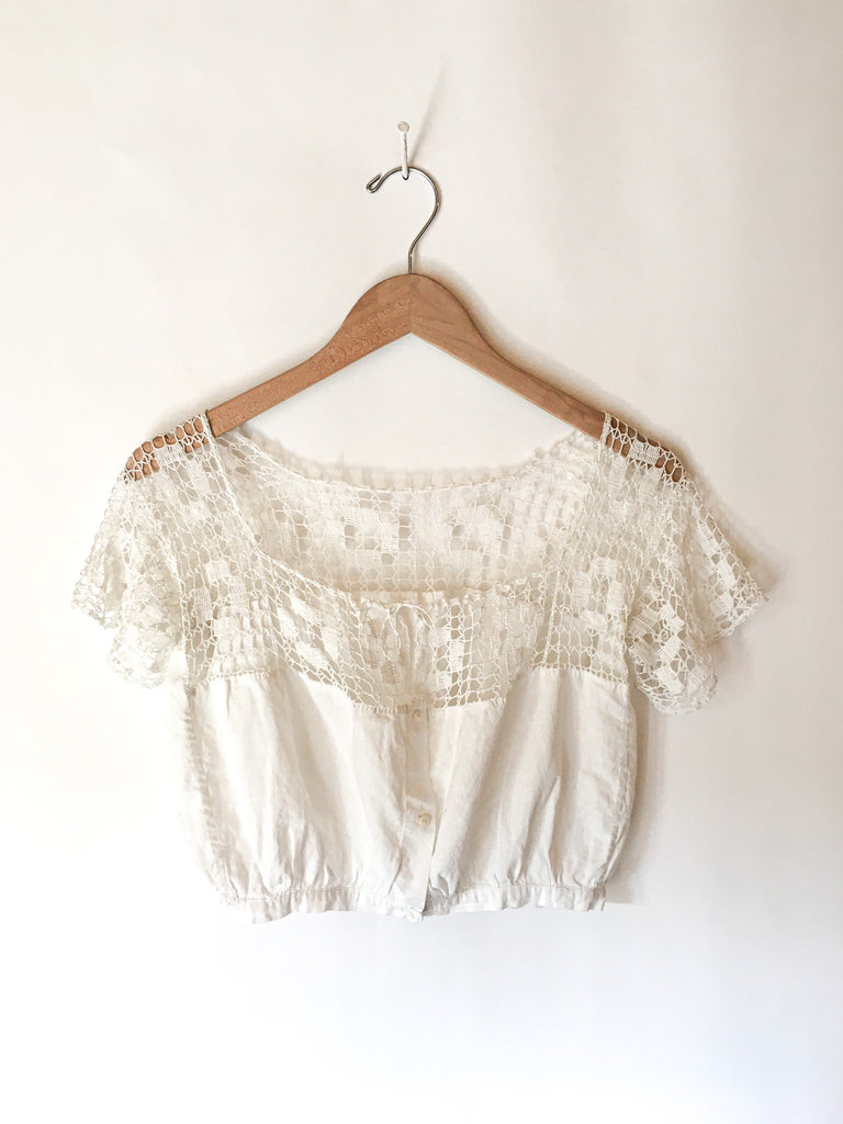 Sweet & delicate Victorian corset cover camisole top. Hand made crochet and cotton button front with original crochet tie at neckline. Cropped fit looks perfect with high waisted jeans and shorts.