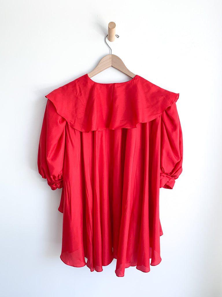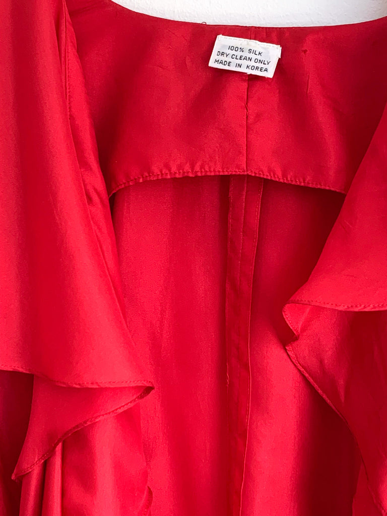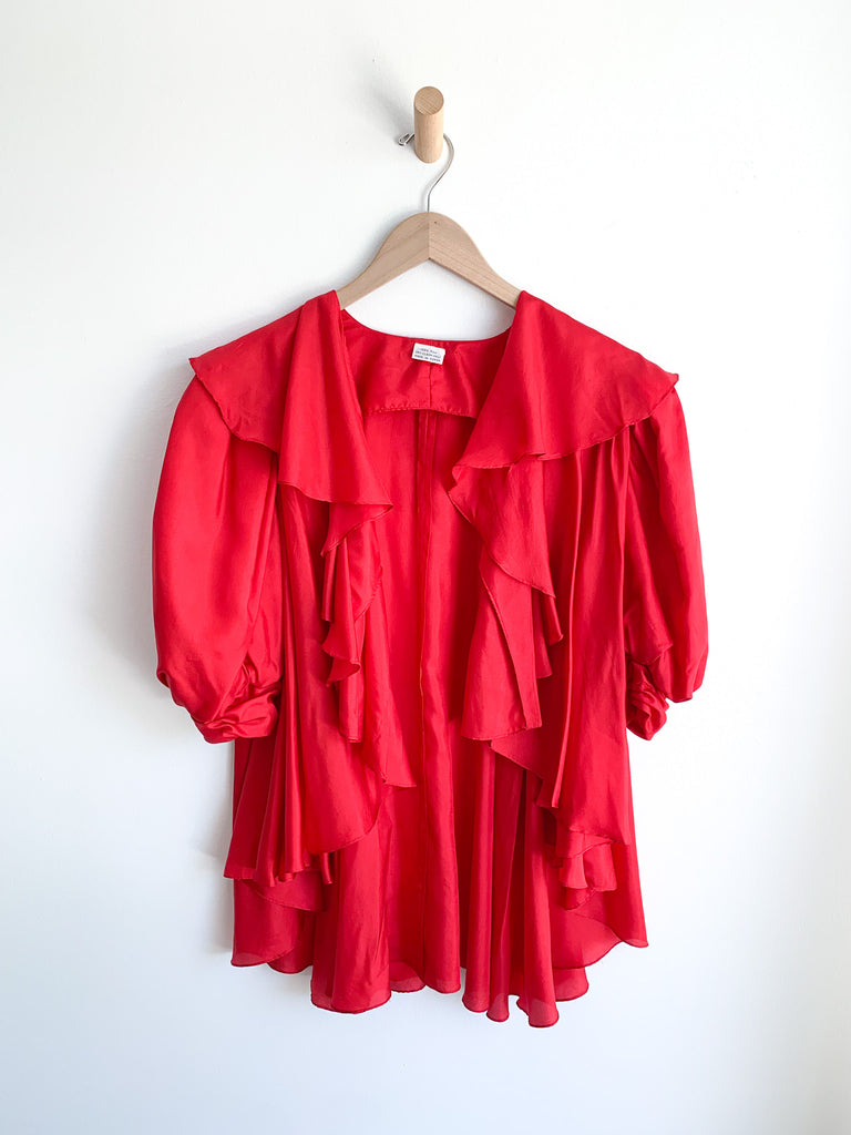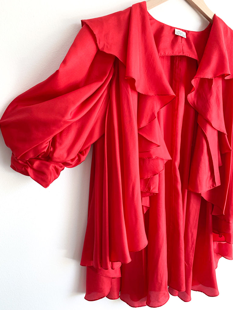 Soft delicate layers of vibrant poppy red silk, light as a feather, open front top or jacket. Wide collar, puffy sleeves and dramatic drape at back. Feels like it was inspired by a Victorian peignoir blouse. Made in Hong Kong. Likely circa 1980’s.
