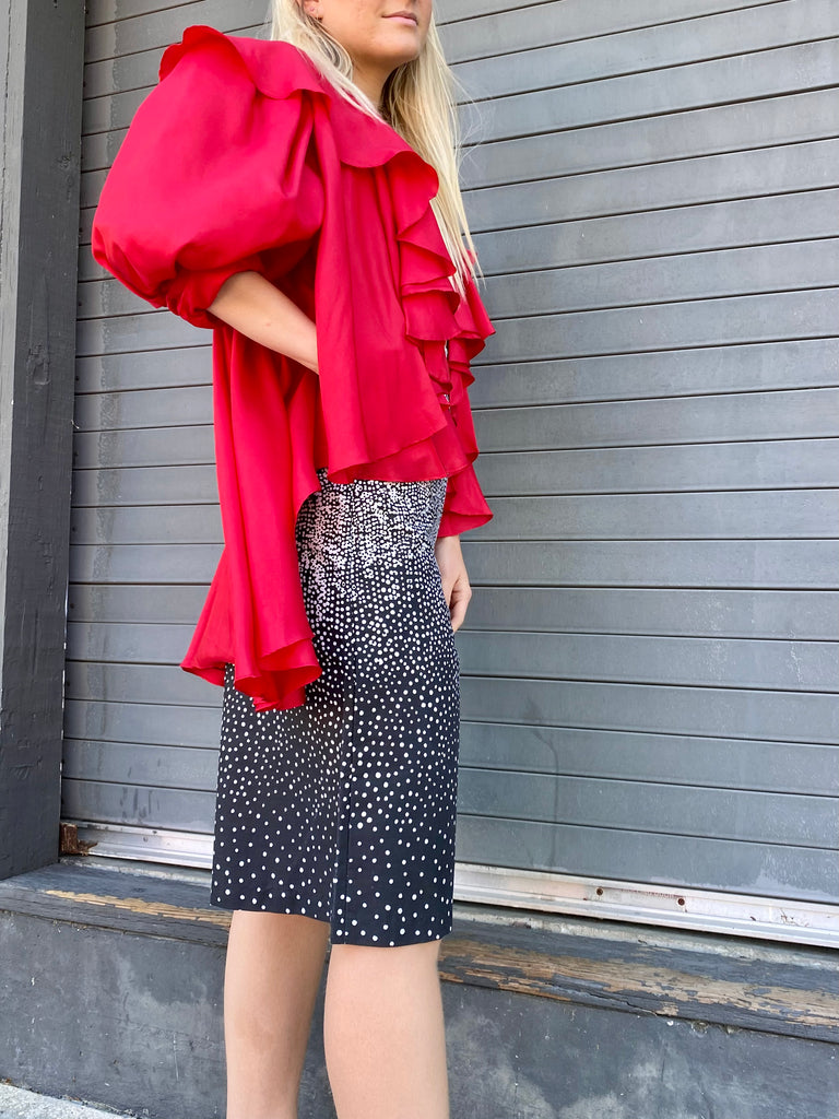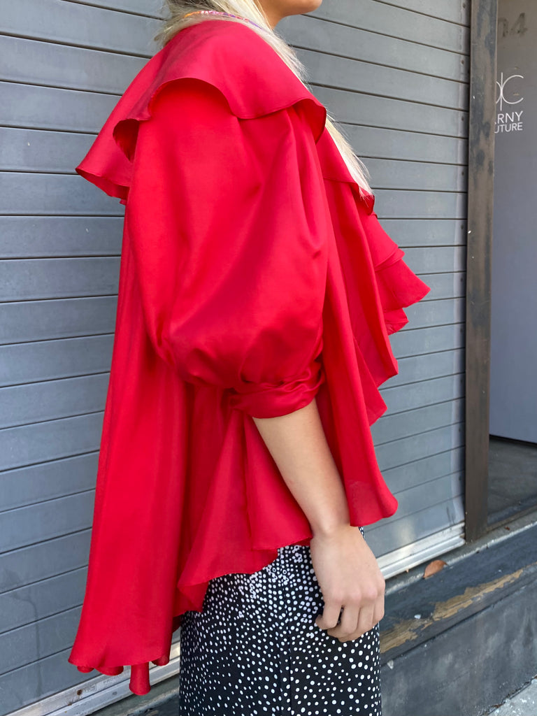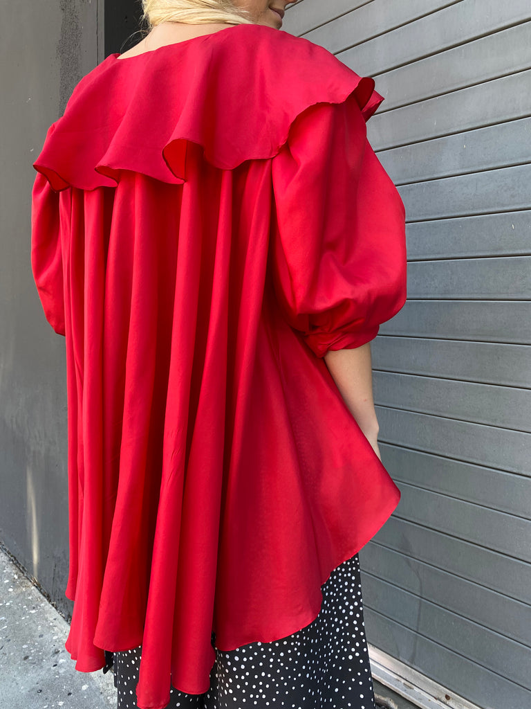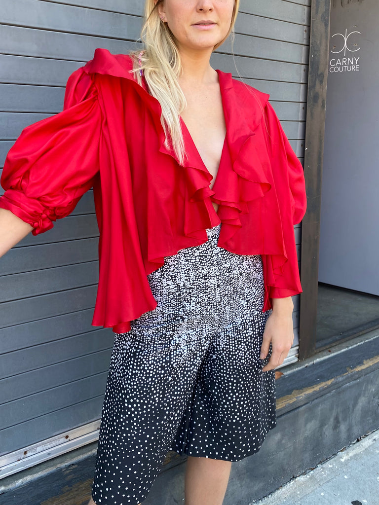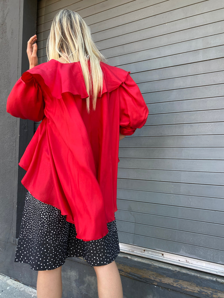 Soft delicate layers of vibrant poppy red silk, light as a feather, open front top or jacket. Wide collar, puffy sleeves and dramatic drape at back. Feels like it was inspired by a Victorian peignoir blouse. Made in Hong Kong. Likely circa 1980’s.