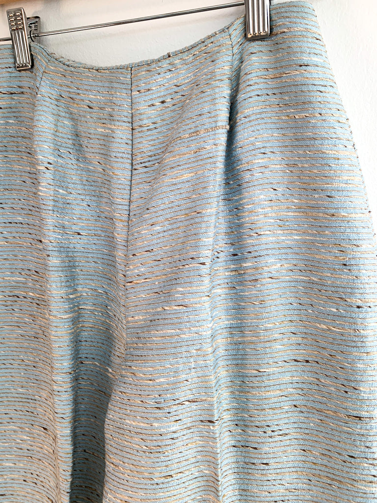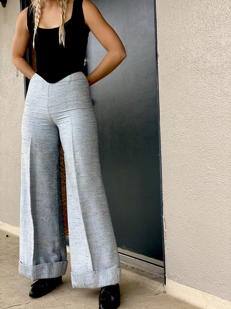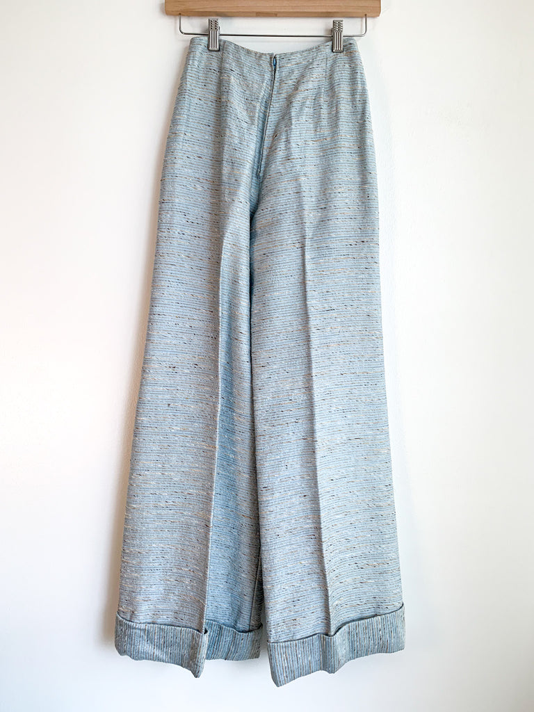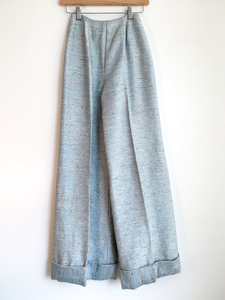 One-of-a-kind baby blue silk trousers with wide legs and exaggerated cuffs. Zips at back. Has matching tie or belt. Get creative and make suspenders.