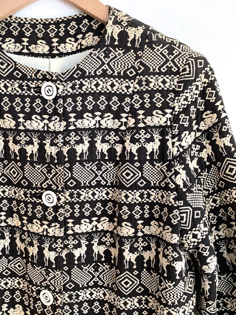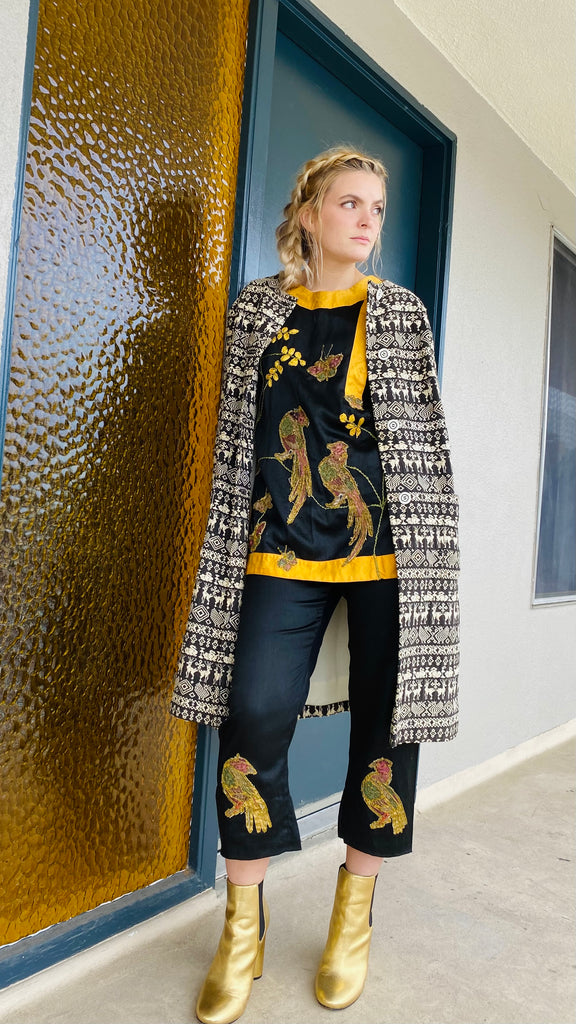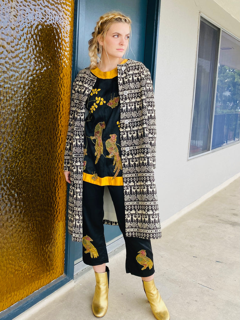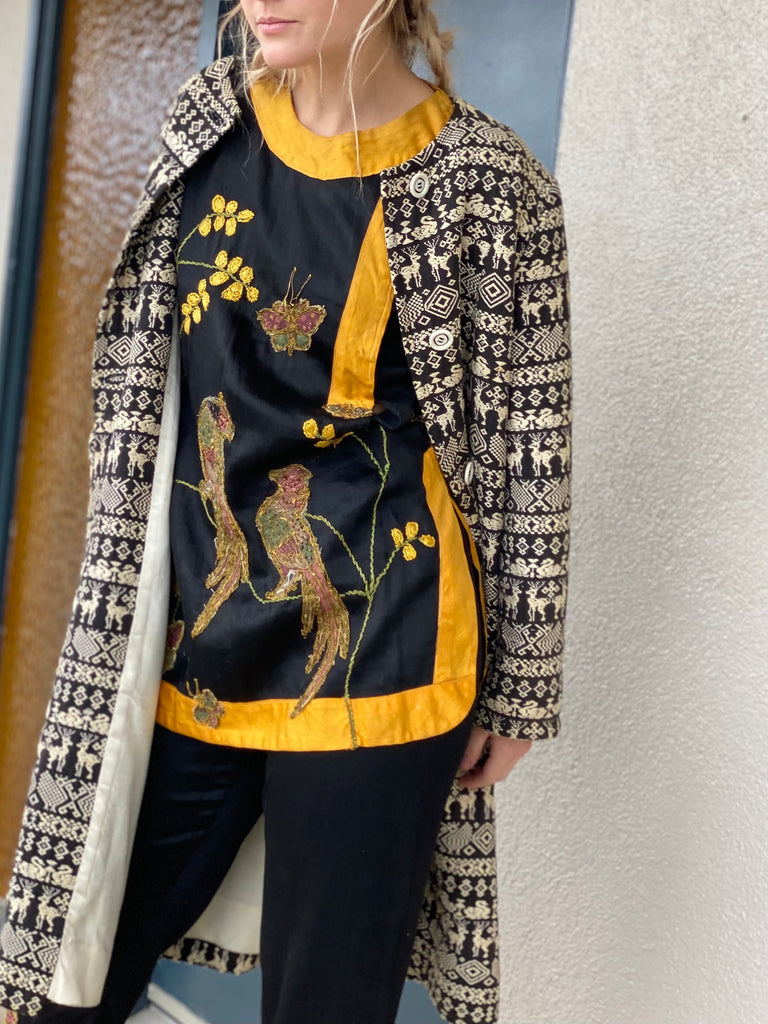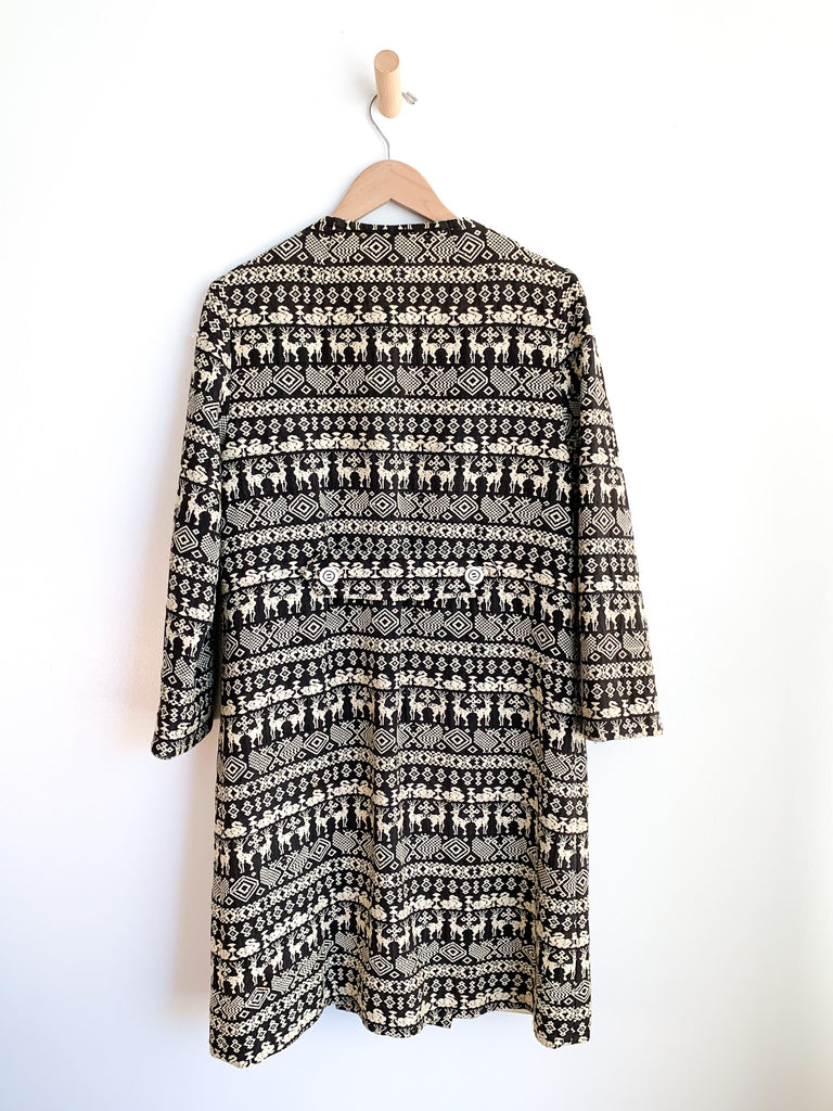 Embroidered Guatemalan textile long coat with front buttons and patch pockets. Fully lined. Structured straight fit no collar.
