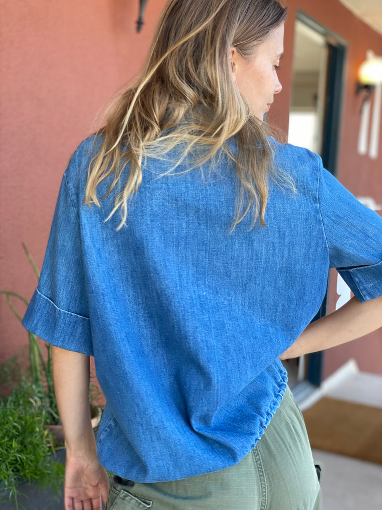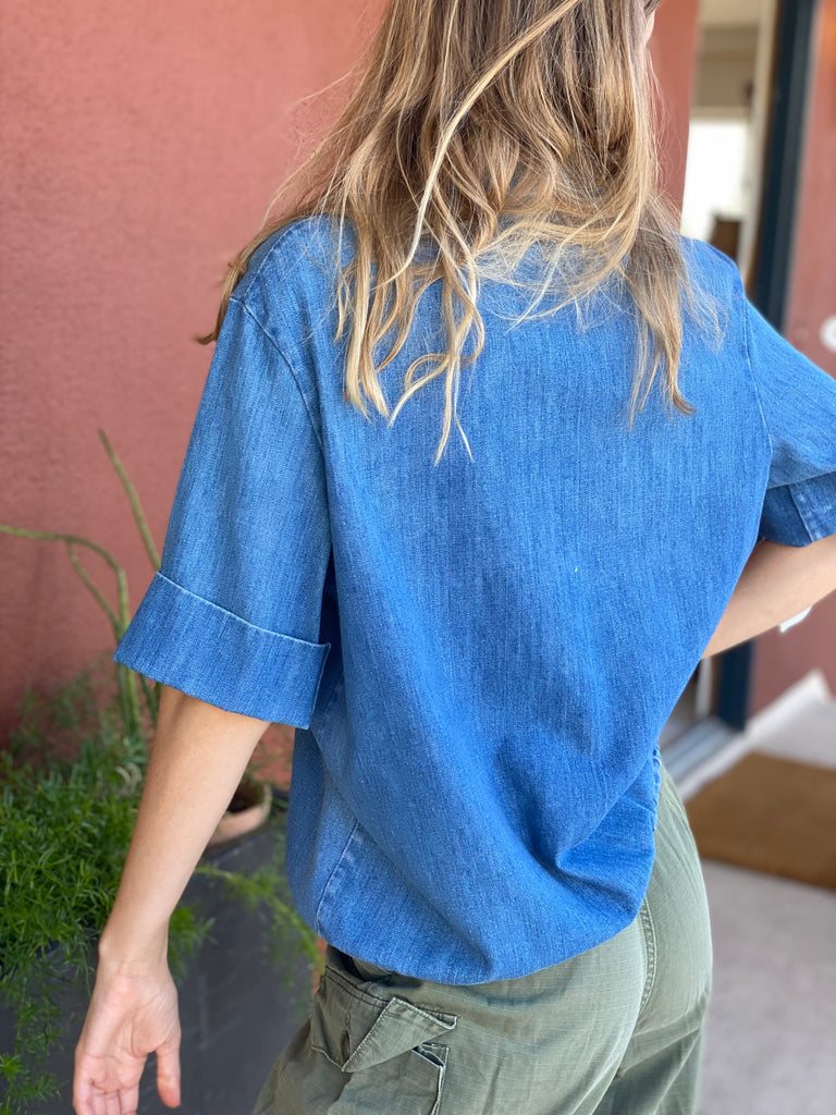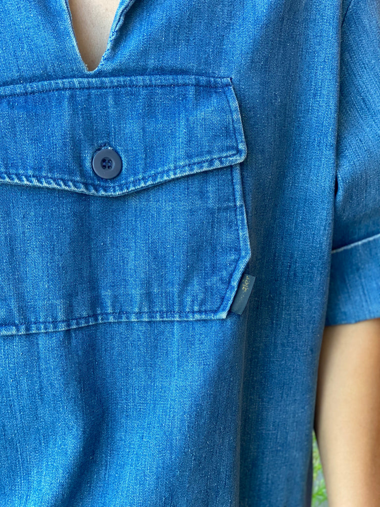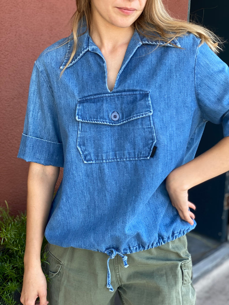 Short sleeve denim 1970/80’s pullover jacket featuring front pocket with button design and cuffed short sleeves with a drawstring waist. Full 1970’s collar.