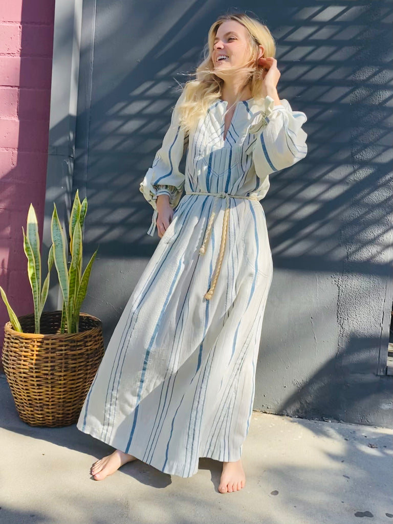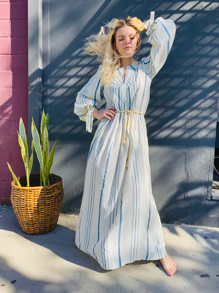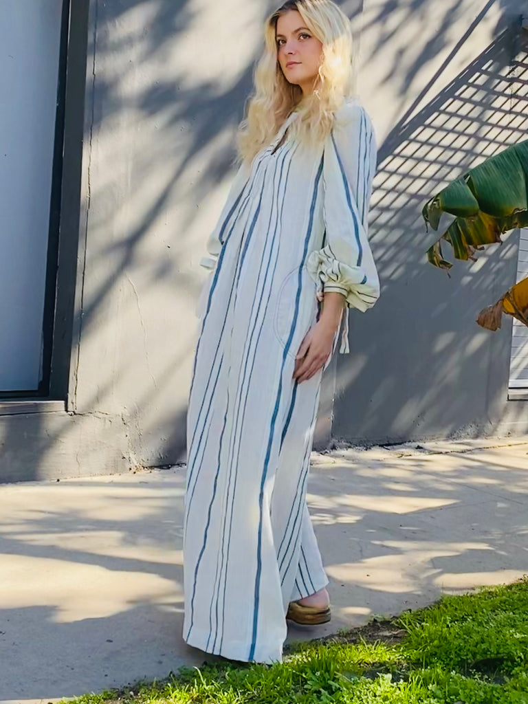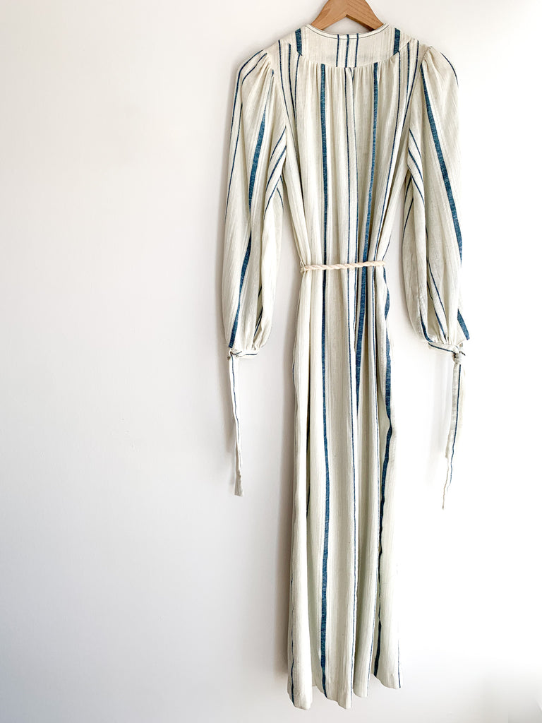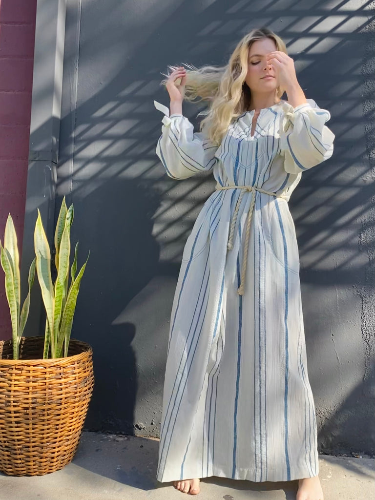 Gauzy cotton striped easy peasant dress. Optional tie at waist. Front pockets, full length, and long sleeves with ties at cuffs.