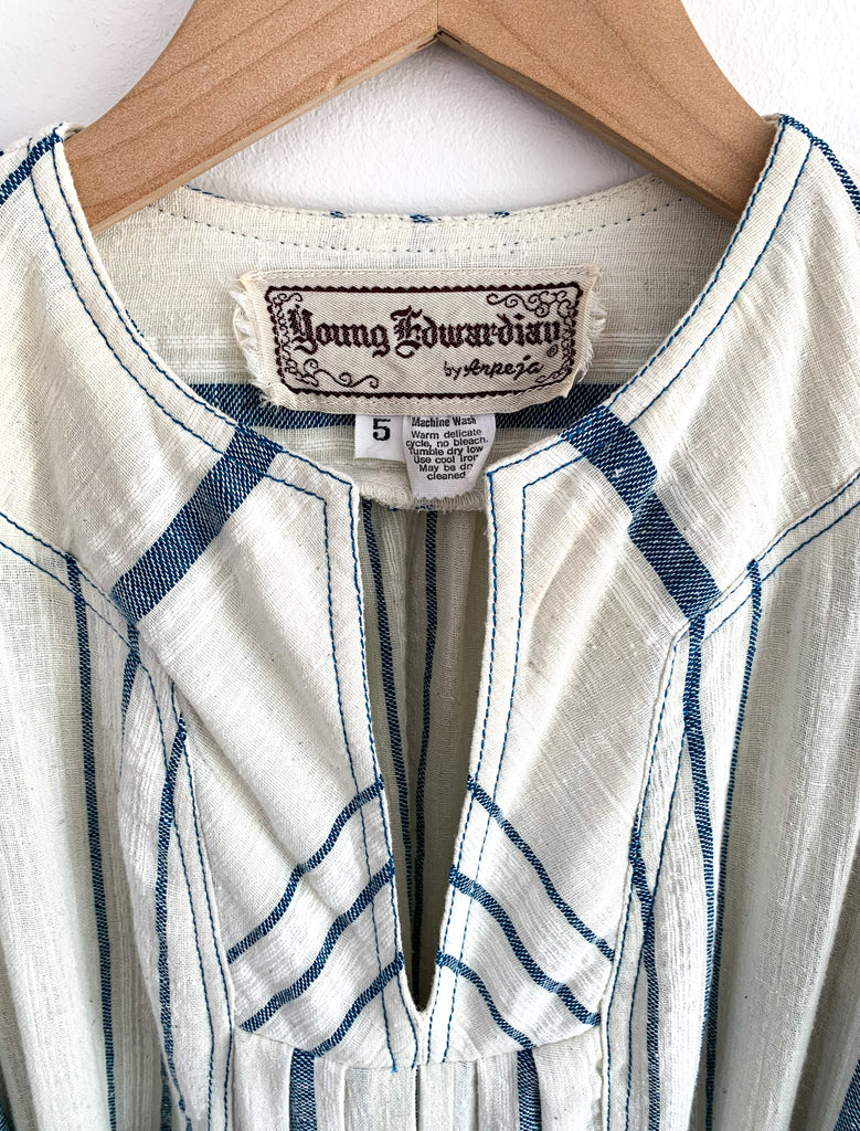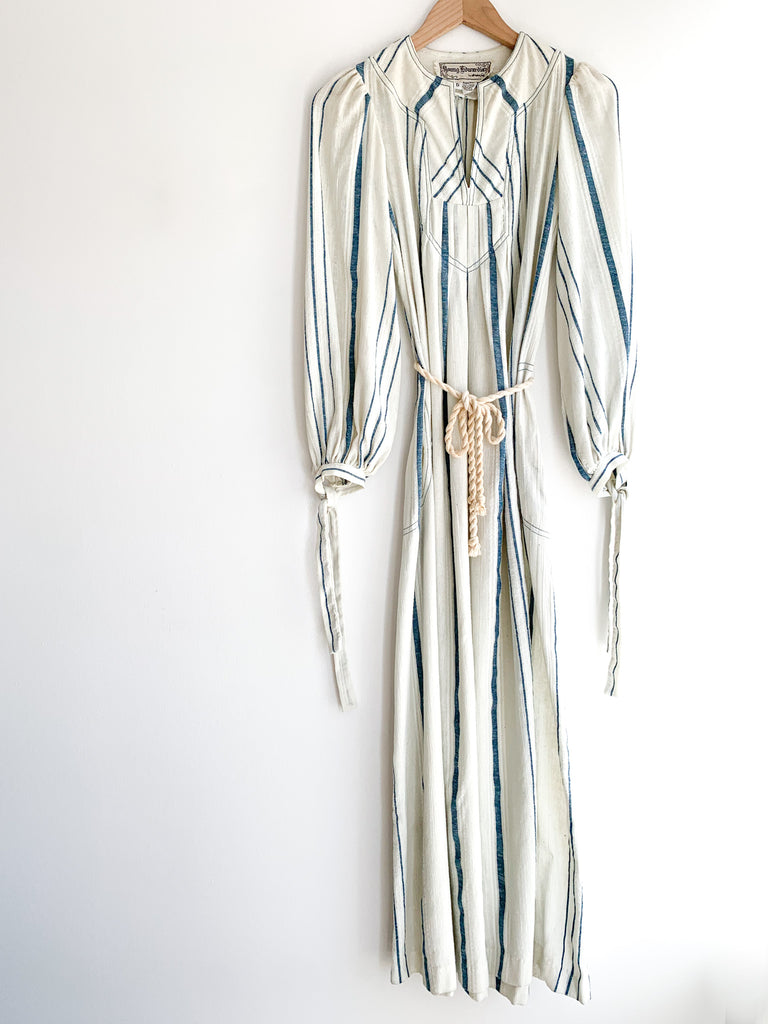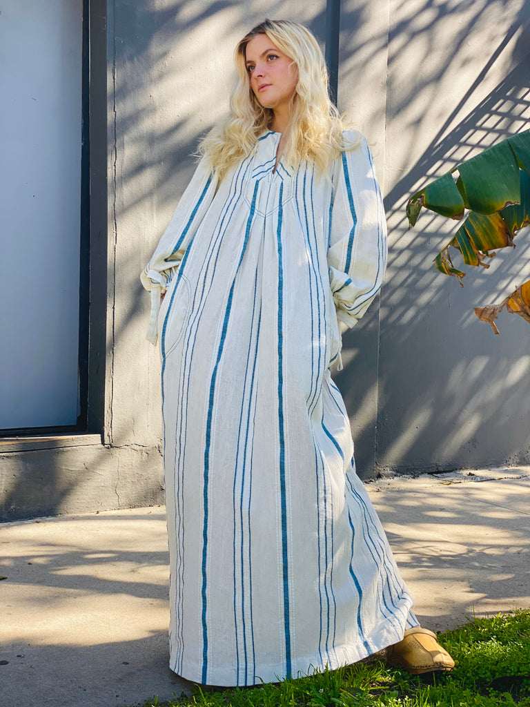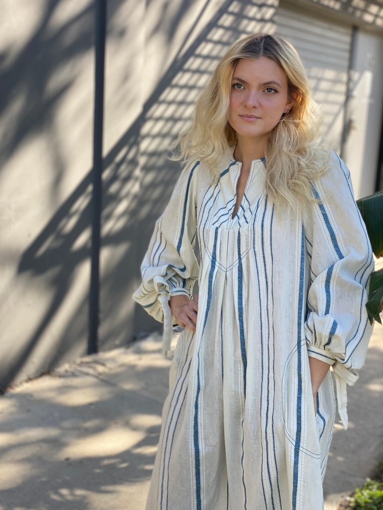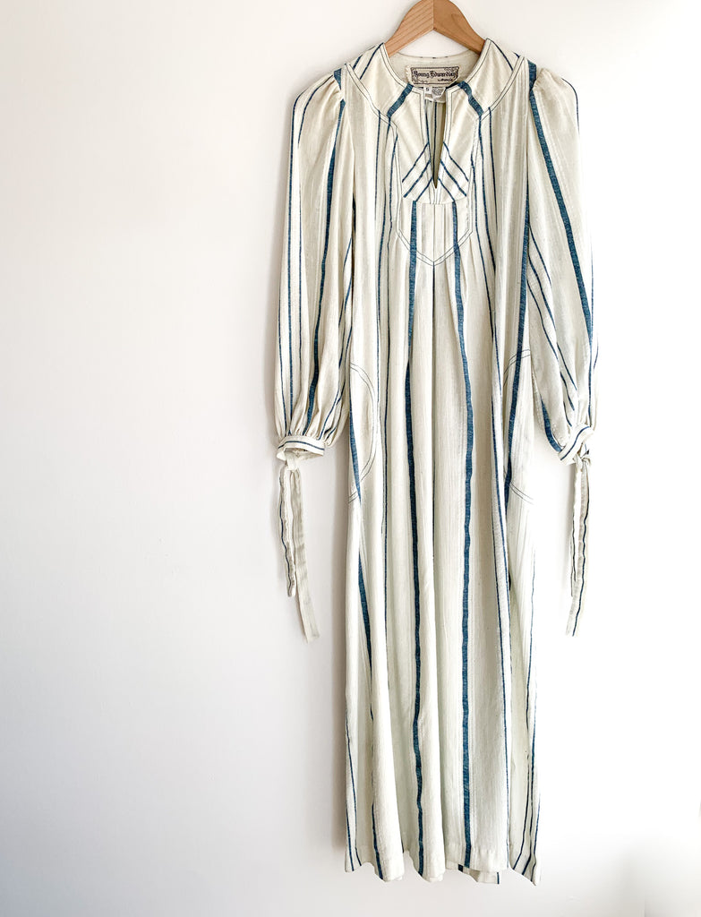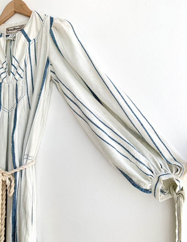 Gauzy cotton striped easy peasant dress. Optional tie at waist. Front pockets, full length, and long sleeves with ties at cuffs.