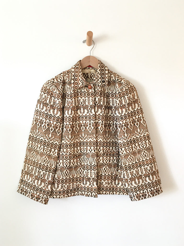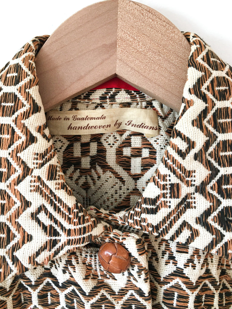 Single button, 1950’s styling, and side pockets. Tag reads “Woven by Guatemalan Indians”.