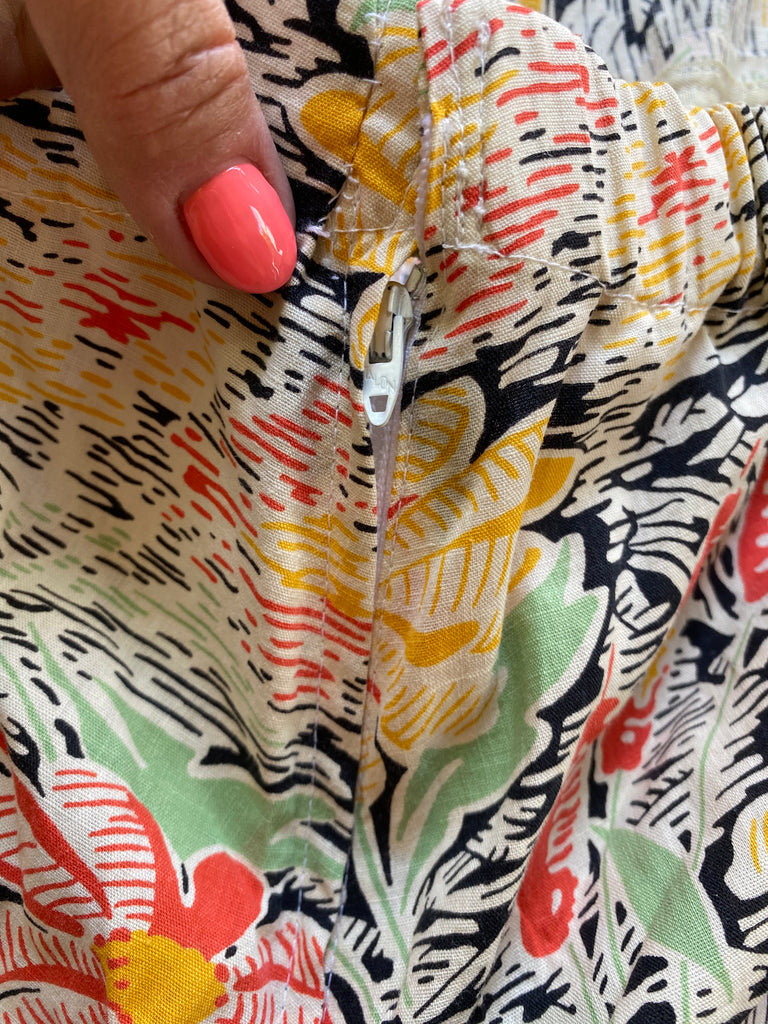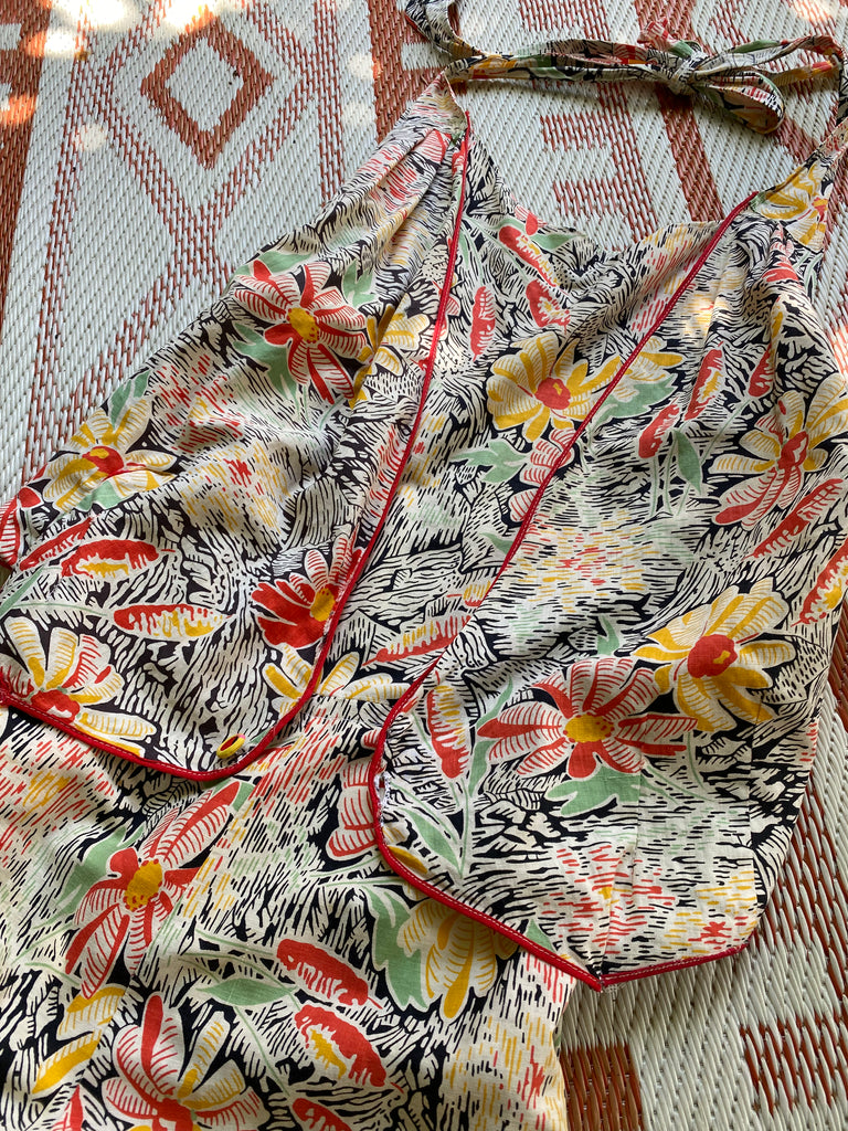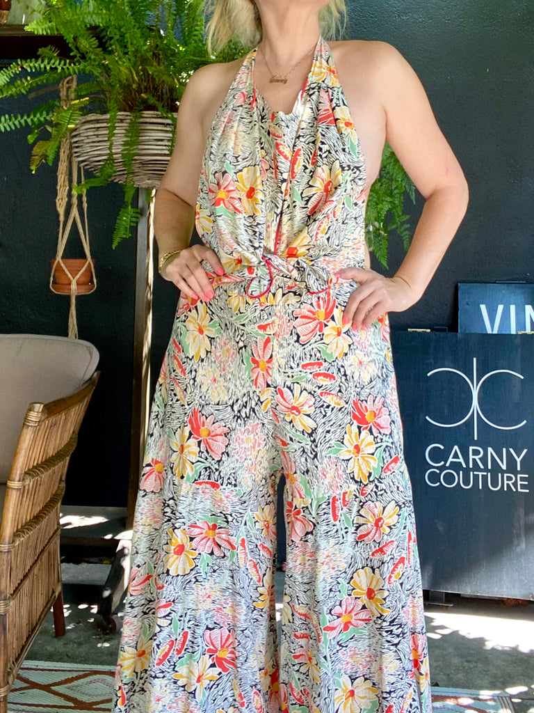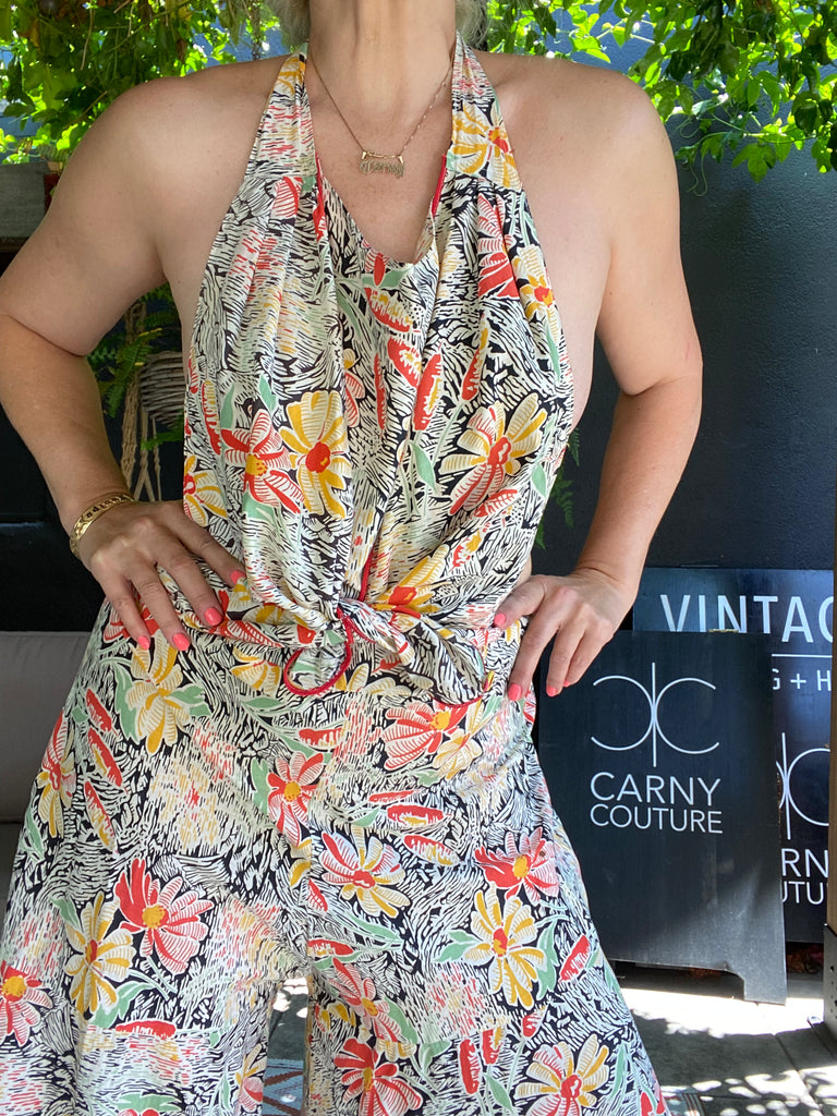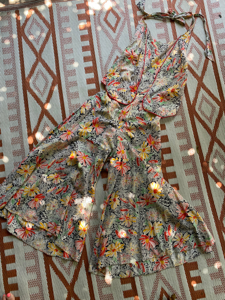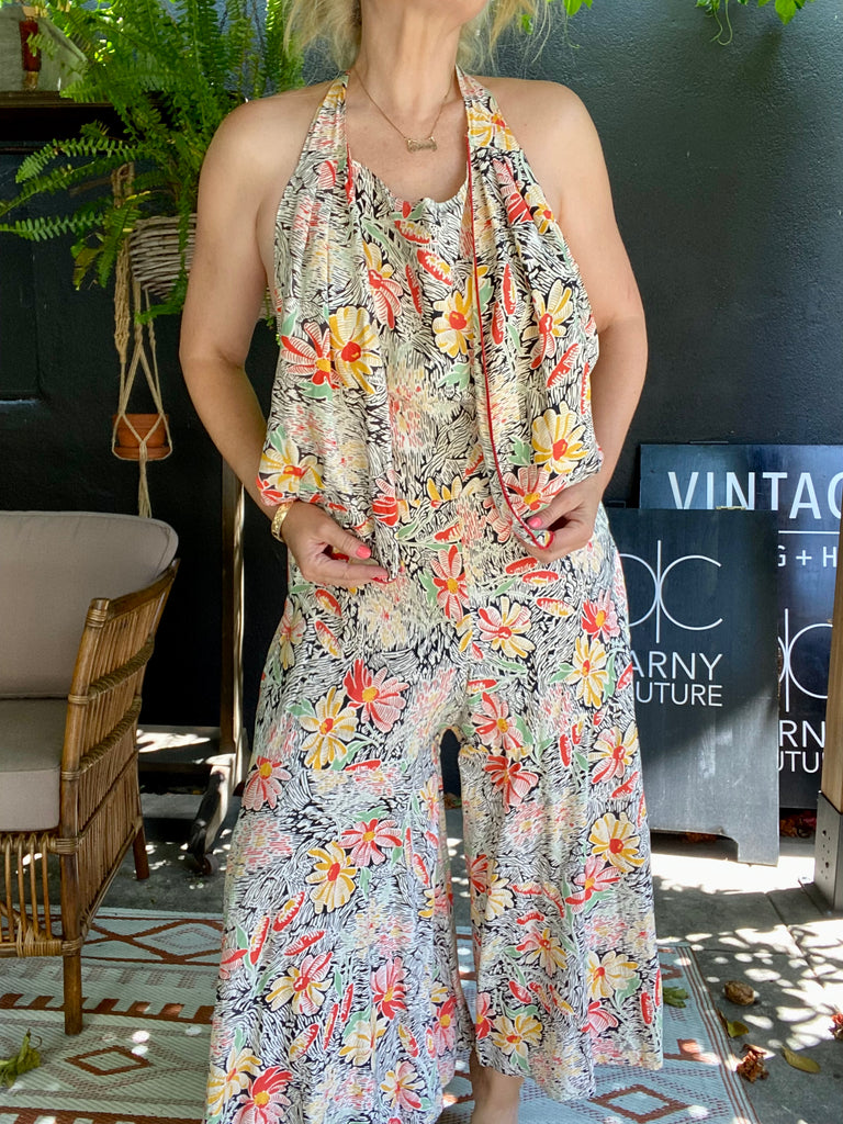 Cotton floral beach pajamas. Halter and vest front with open low back styling. Hand-made then altered and zipper added at later point. Wide bias cut legs. Flattering silhouette with the prettiest print. Rare find.