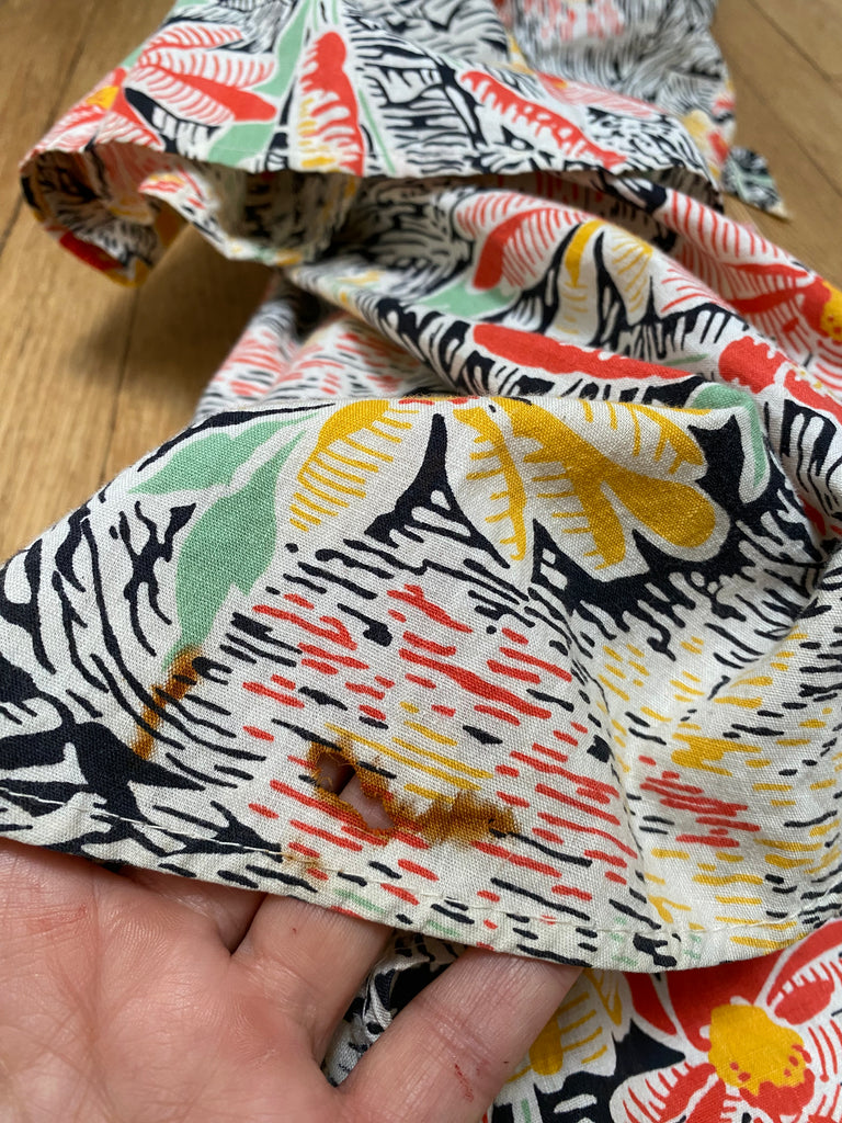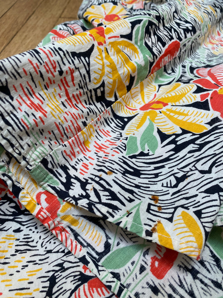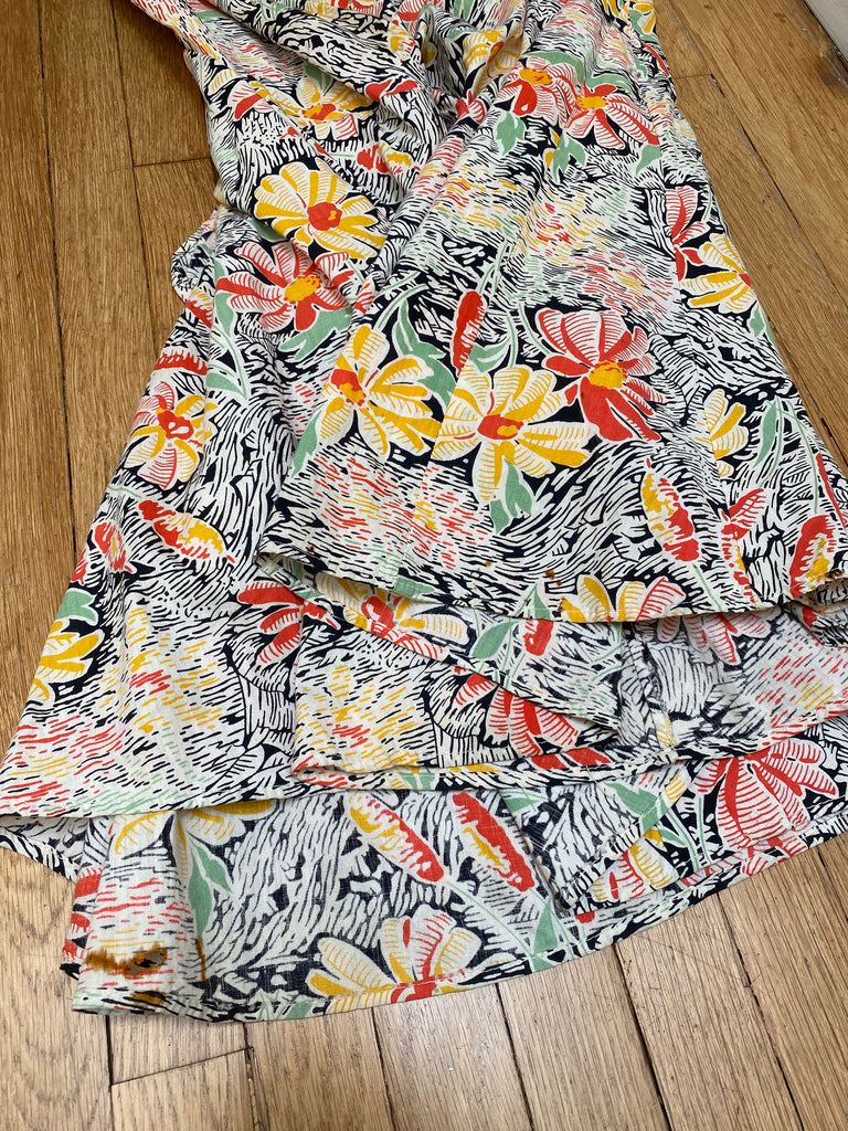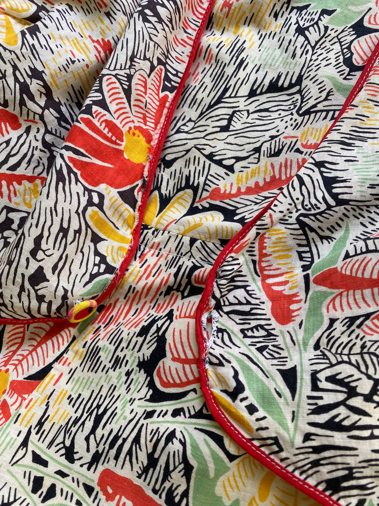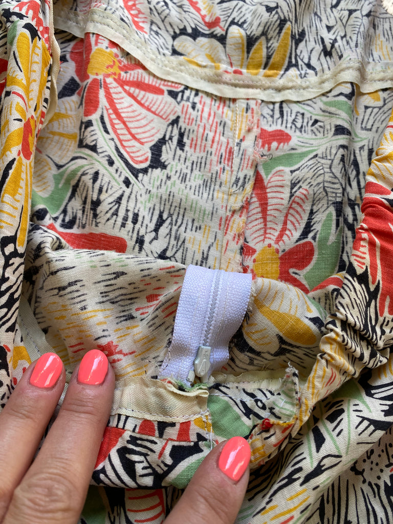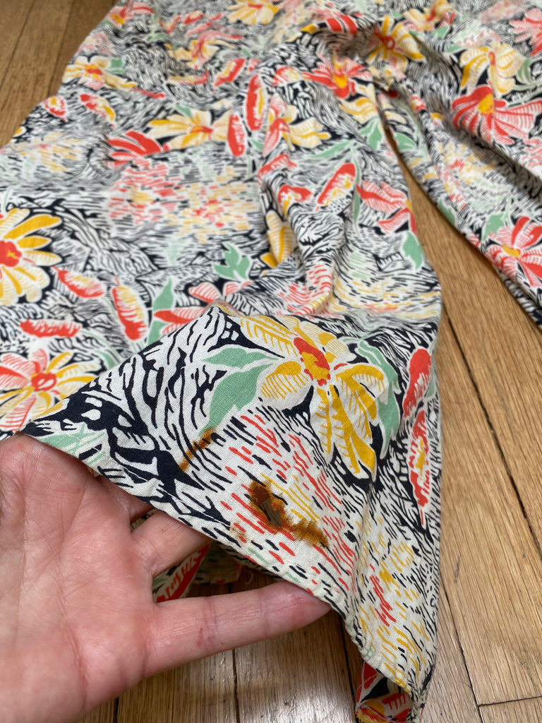Cotton floral beach pajamas. Halter and vest front with open low back styling. Hand-made then altered and zipper added at later point. Wide bias cut legs. Flattering silhouette with the prettiest print. Rare find.