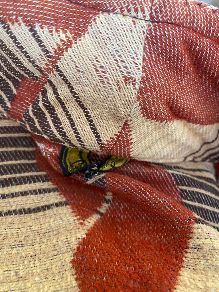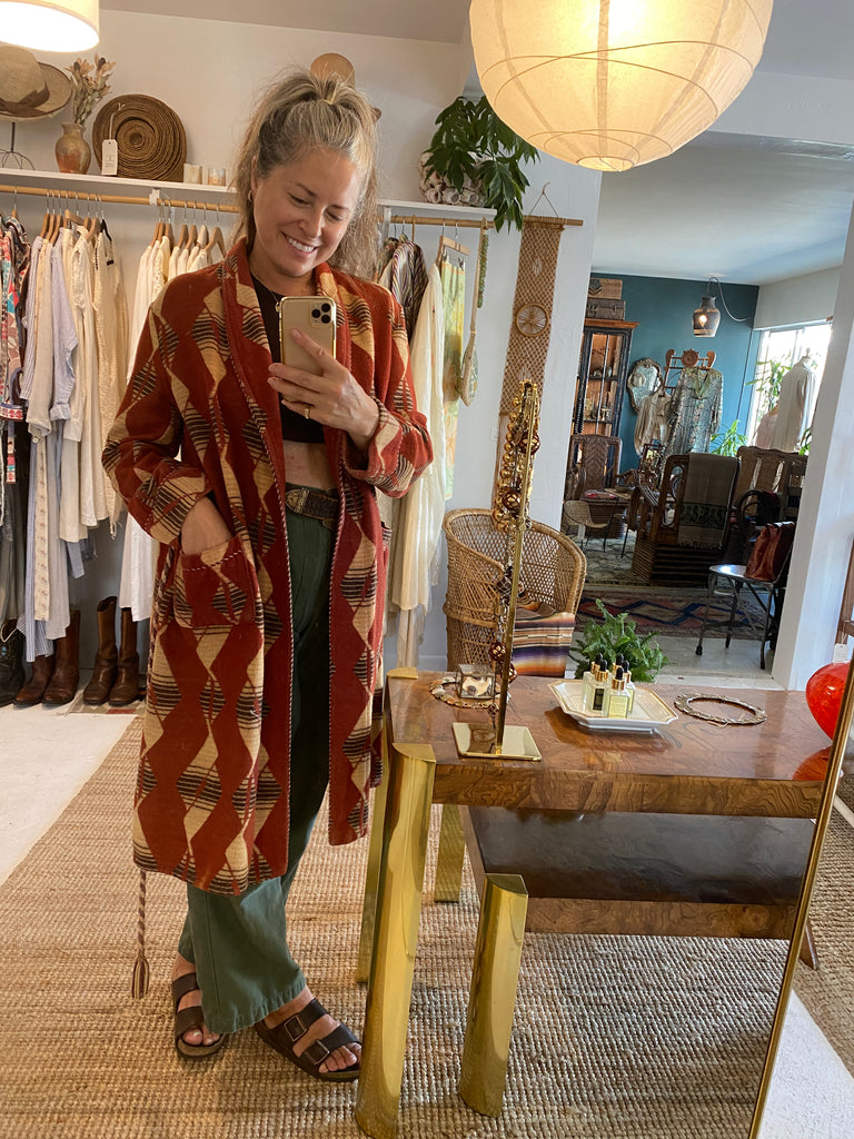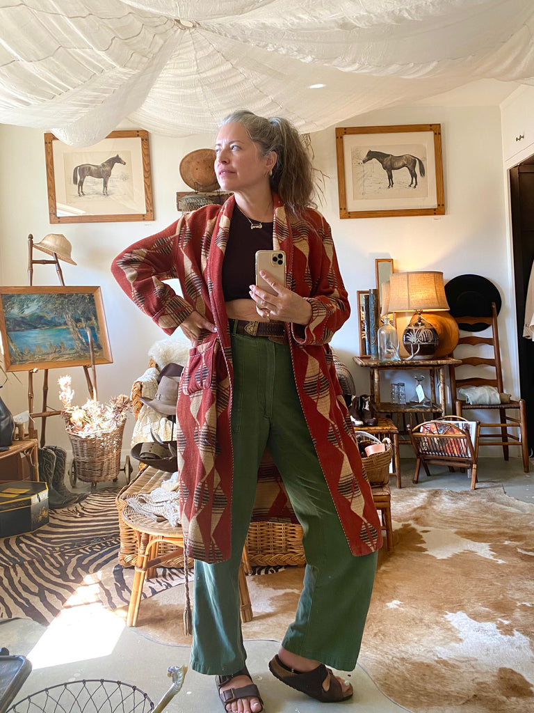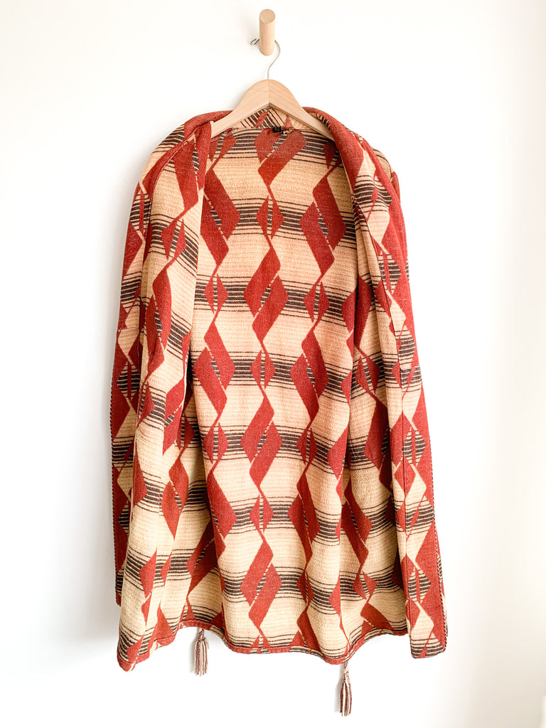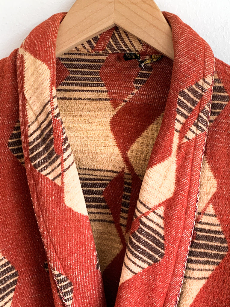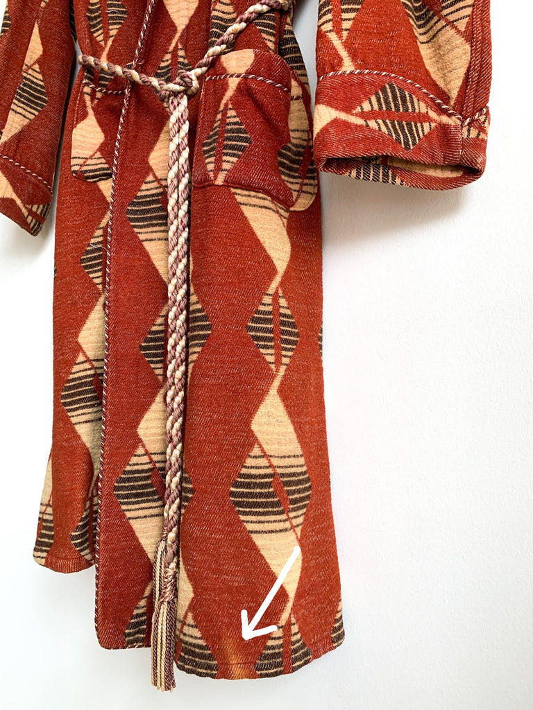 Brick red Beacon robe with front pockets and original twisted rope belt. Wear as a robe or a duster jacket. Nicely worn as expected from a well-loved 1950’s garment.