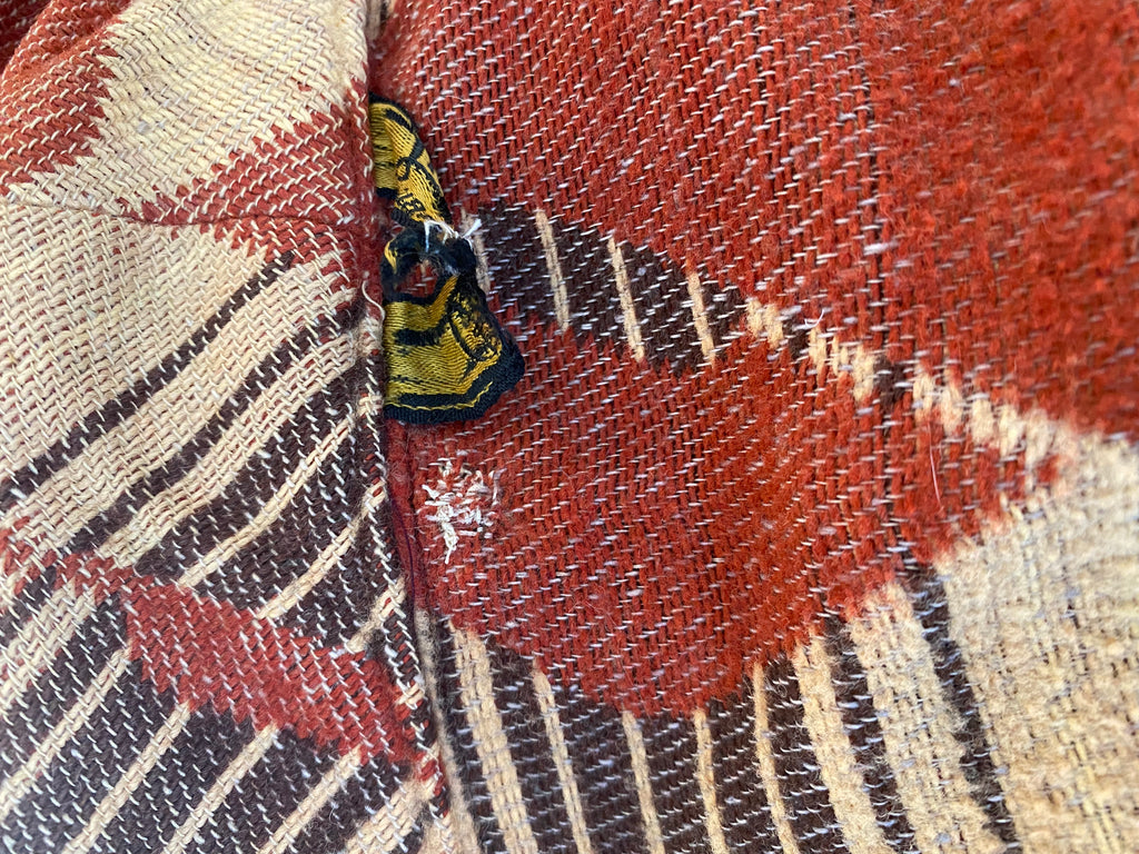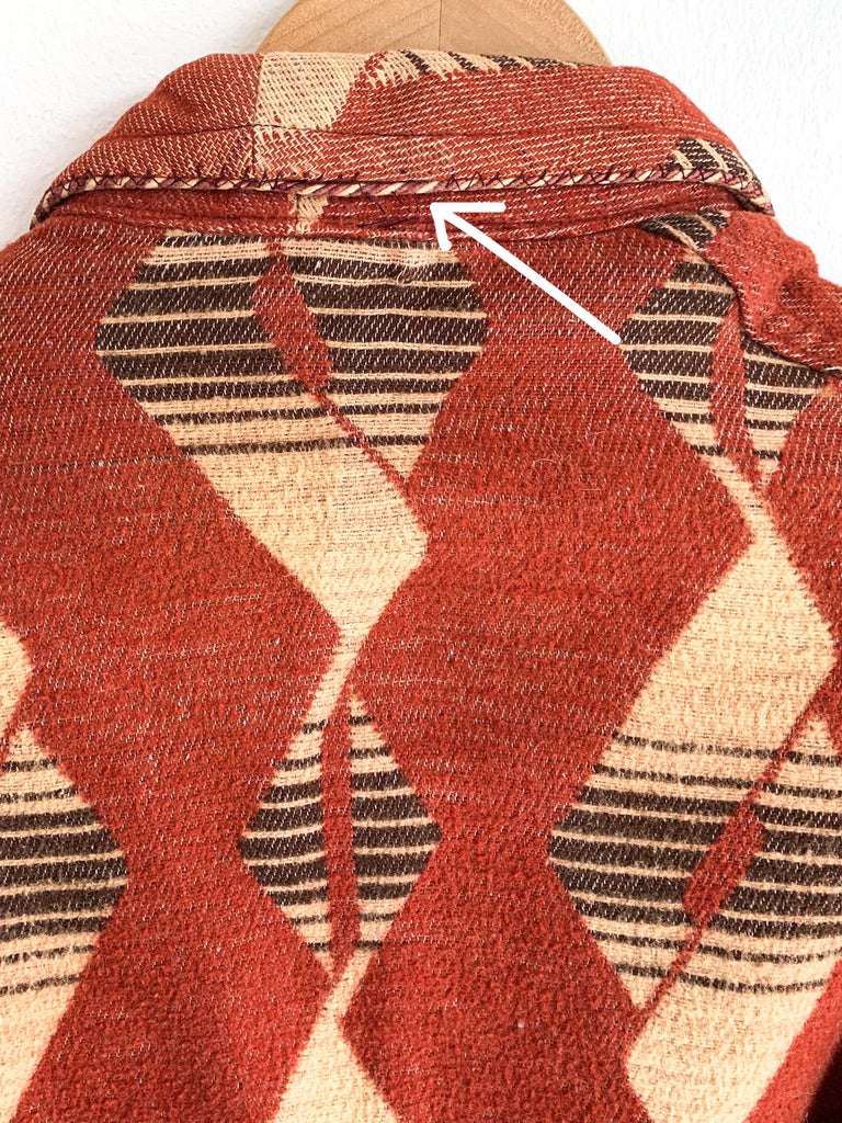 Condition: Very good. Fade mark at bottom and several missing stiches holding cord trim on back of collar (see photos). Hand repaired near tag. Tag is split.