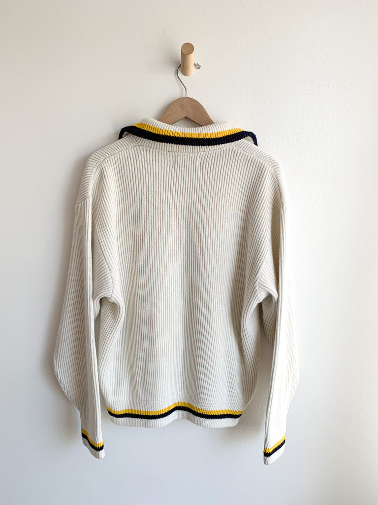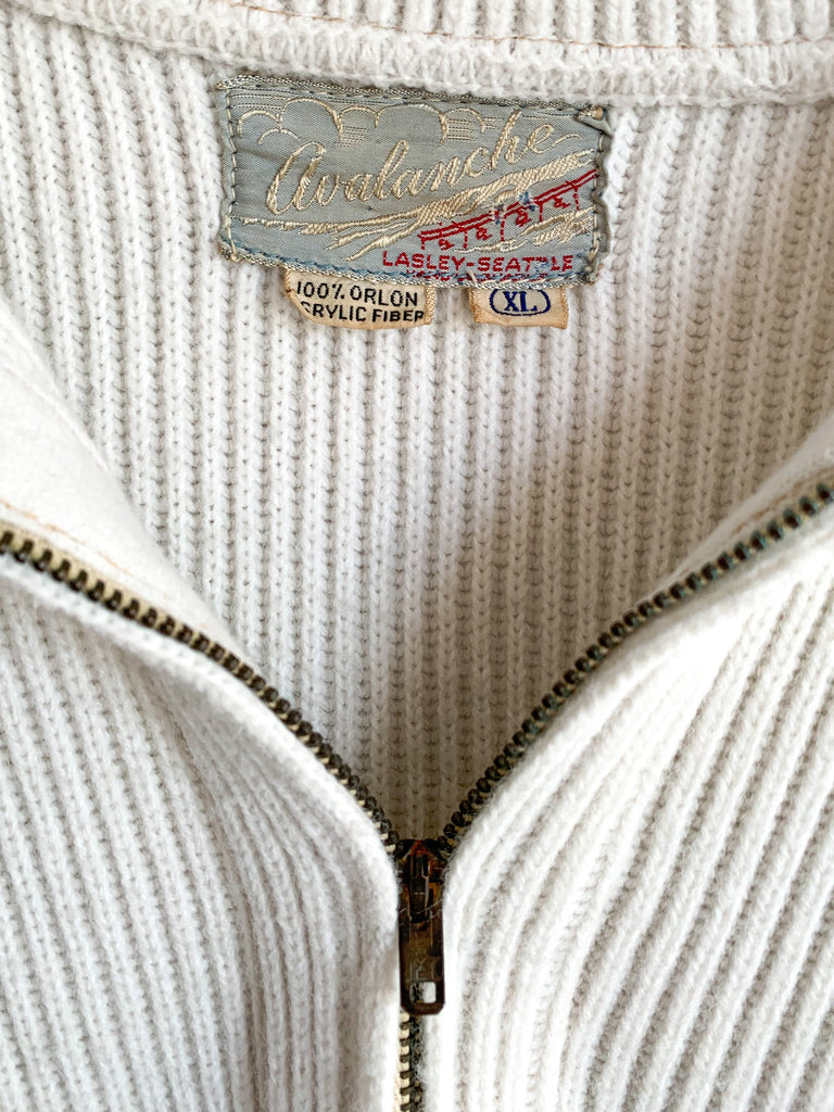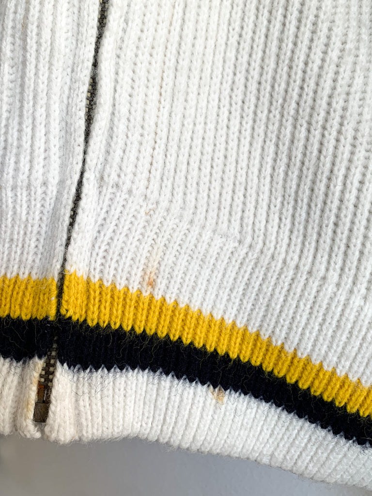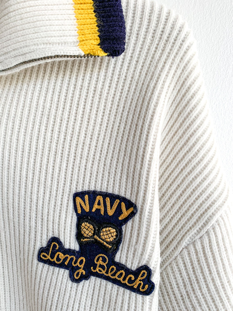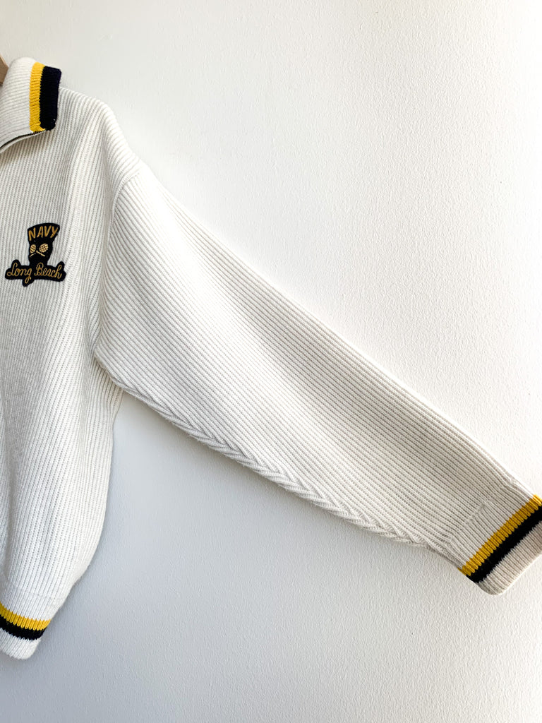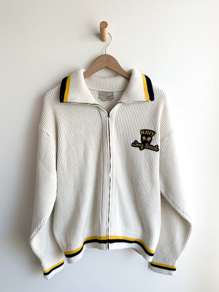 White chunk knit zipper cardigan accented with yellow & navy at collar and hem. Navy Long Beach patch, old zipper and fantastic label. Drop shoulder style makes this fit multiple sizes well. A perfect year-round layering staple. 1940/50’s.