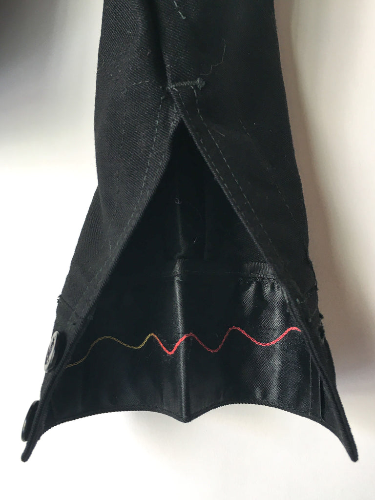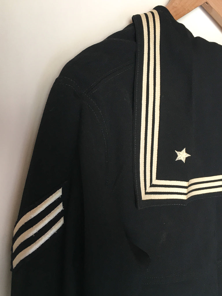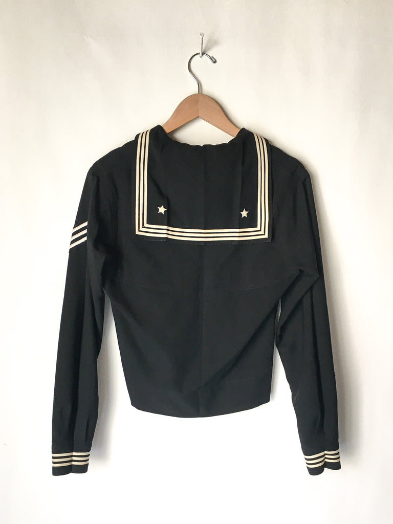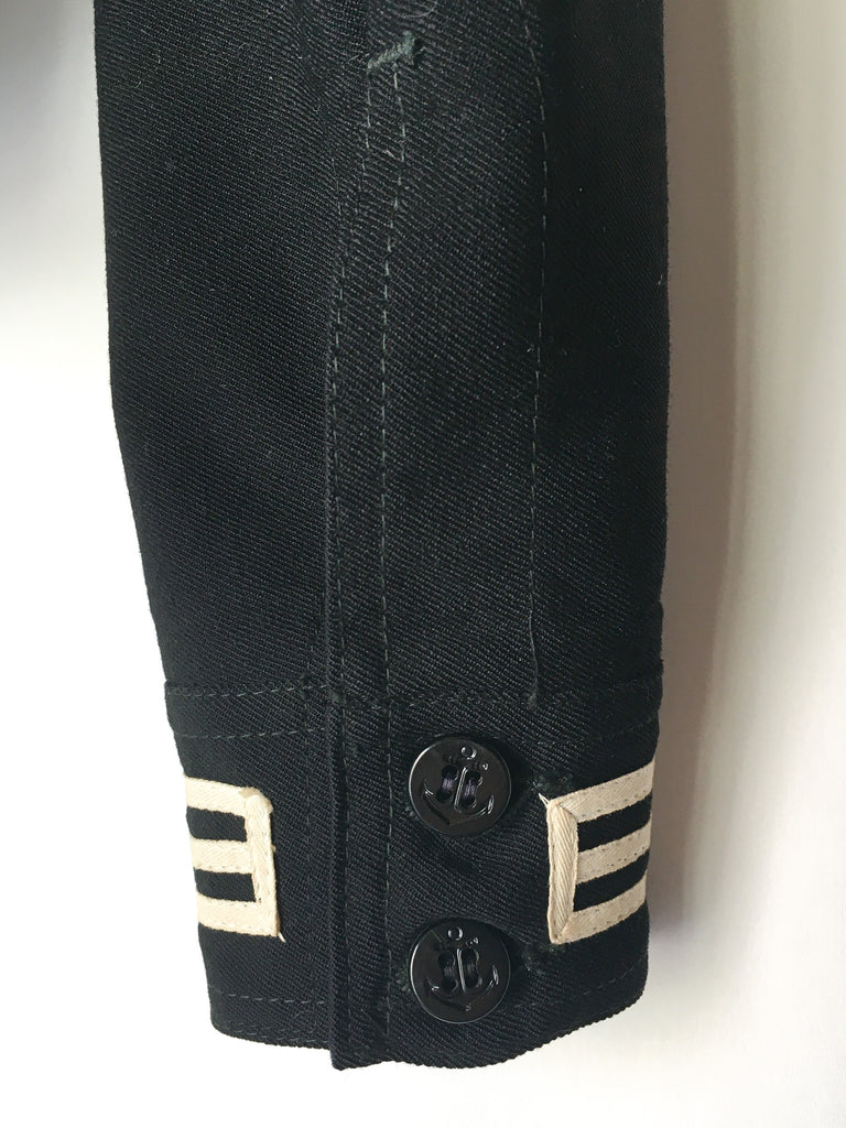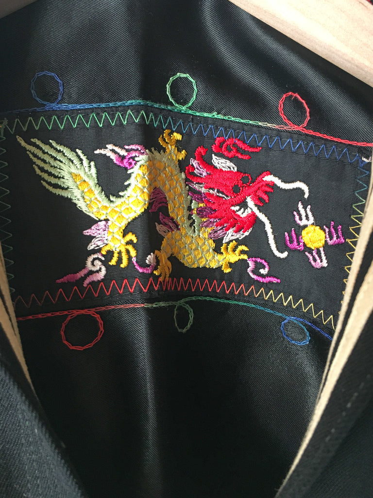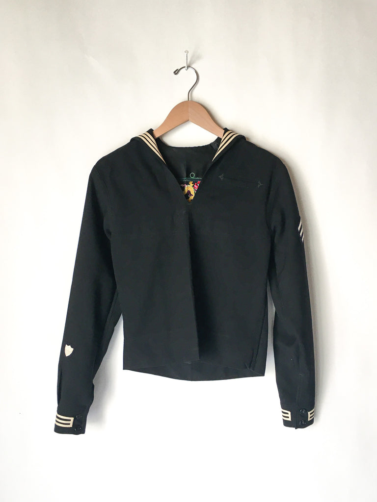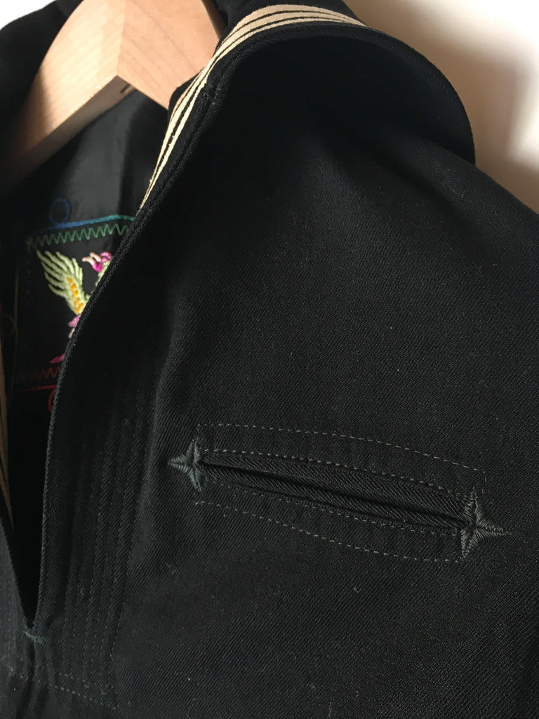 Traditional US Navy Sailor midi pullover in really fine woven wool from 1940/50’s. Embroidered chain stitching colorful dragon on inside at neck and more on the inside of cuffs is really special.