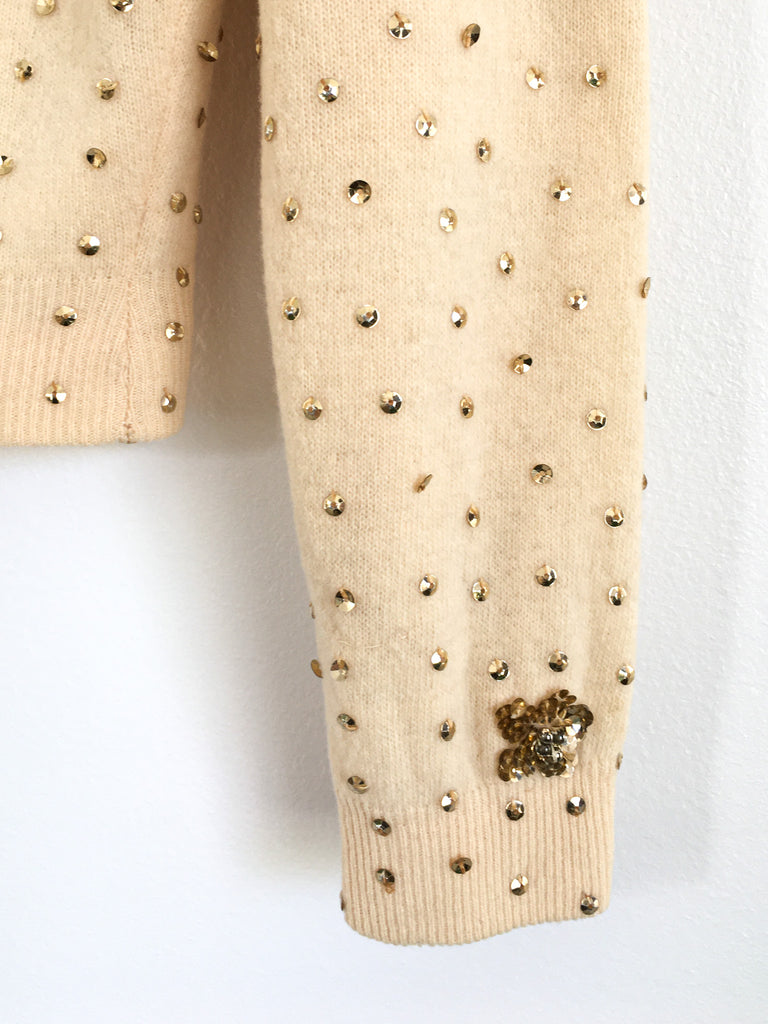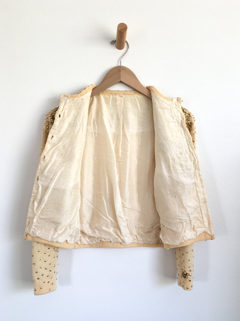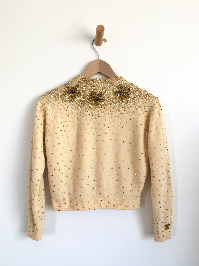 Heavily embellished, fully silk lined 1950’s wool cardigan sweater. The sequins and beads are all gold toned so the overall effect is a warm glow. We love these paired with classic denim. This is a particularly special arrangement of jewels.