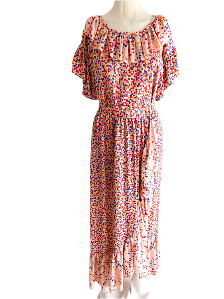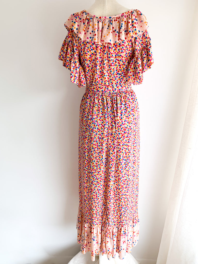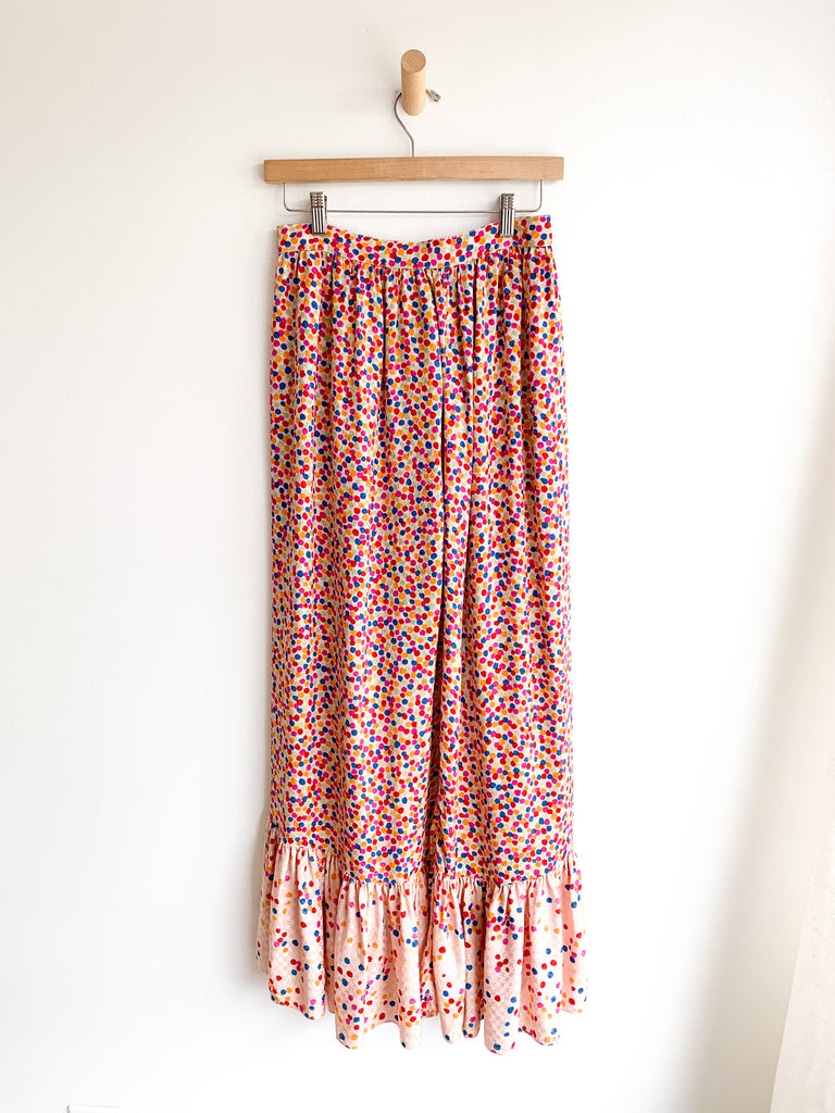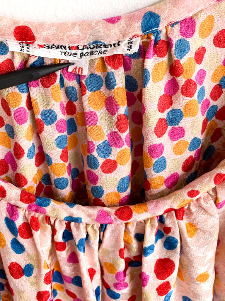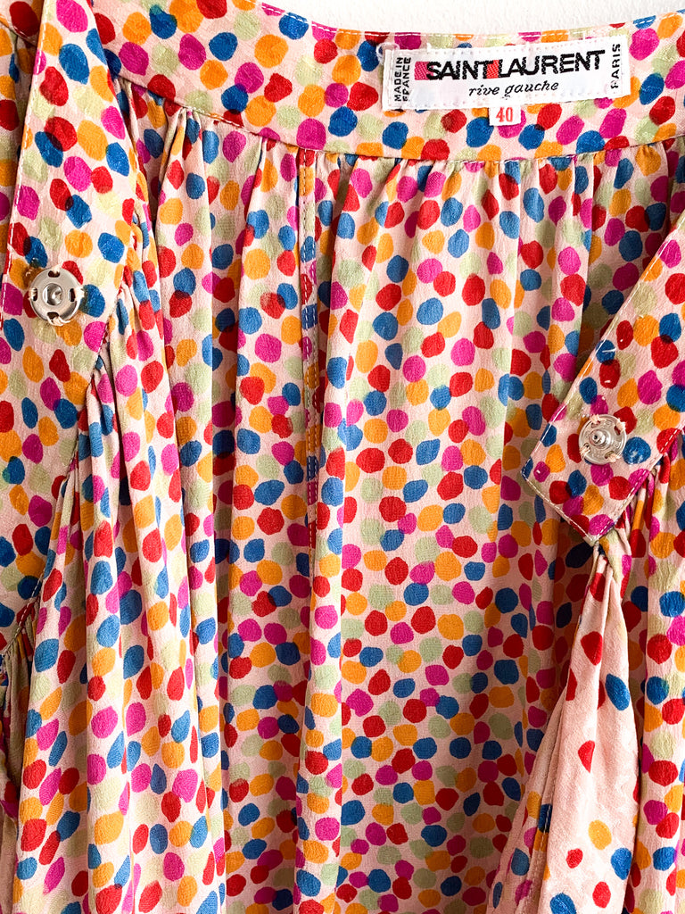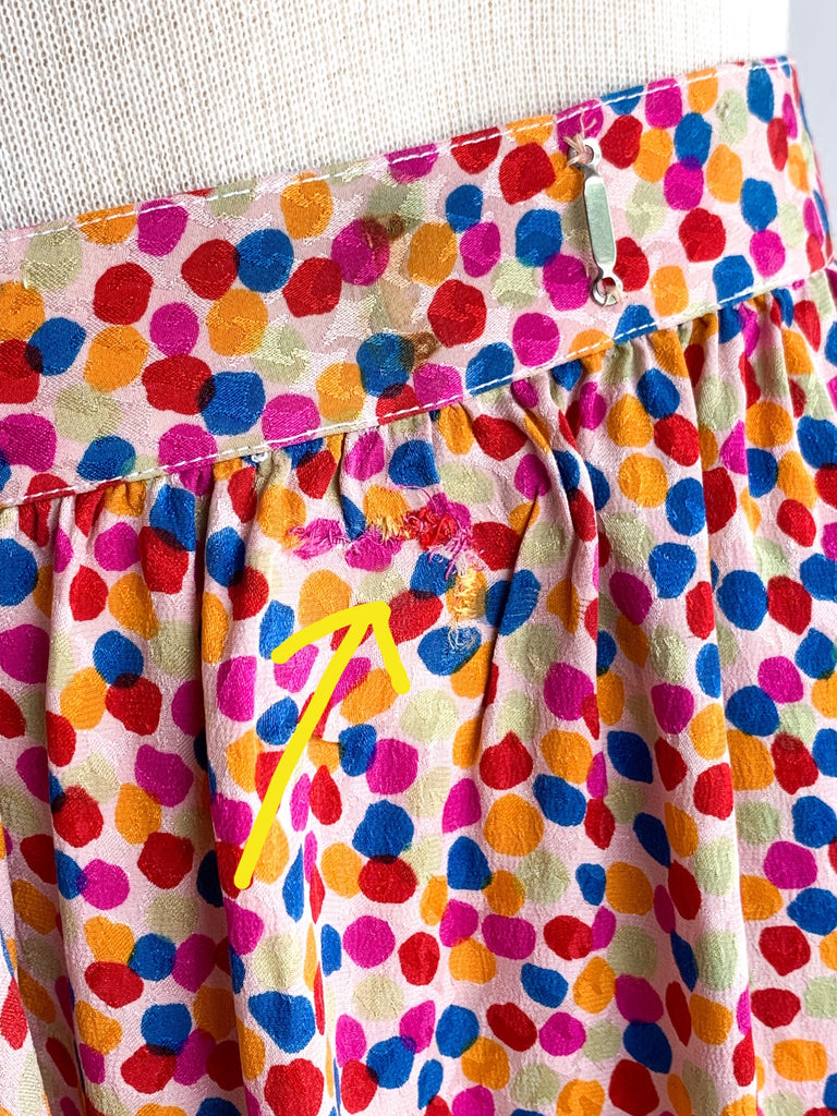 Dots, ruffles, pastel silk goodness in this really special skirt and top ensemble from 1970/80’s Yves Saint Laurent. Pretty pastels and ultra feminine. Wear separate or together.