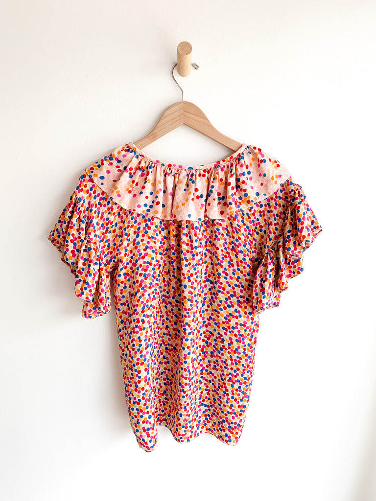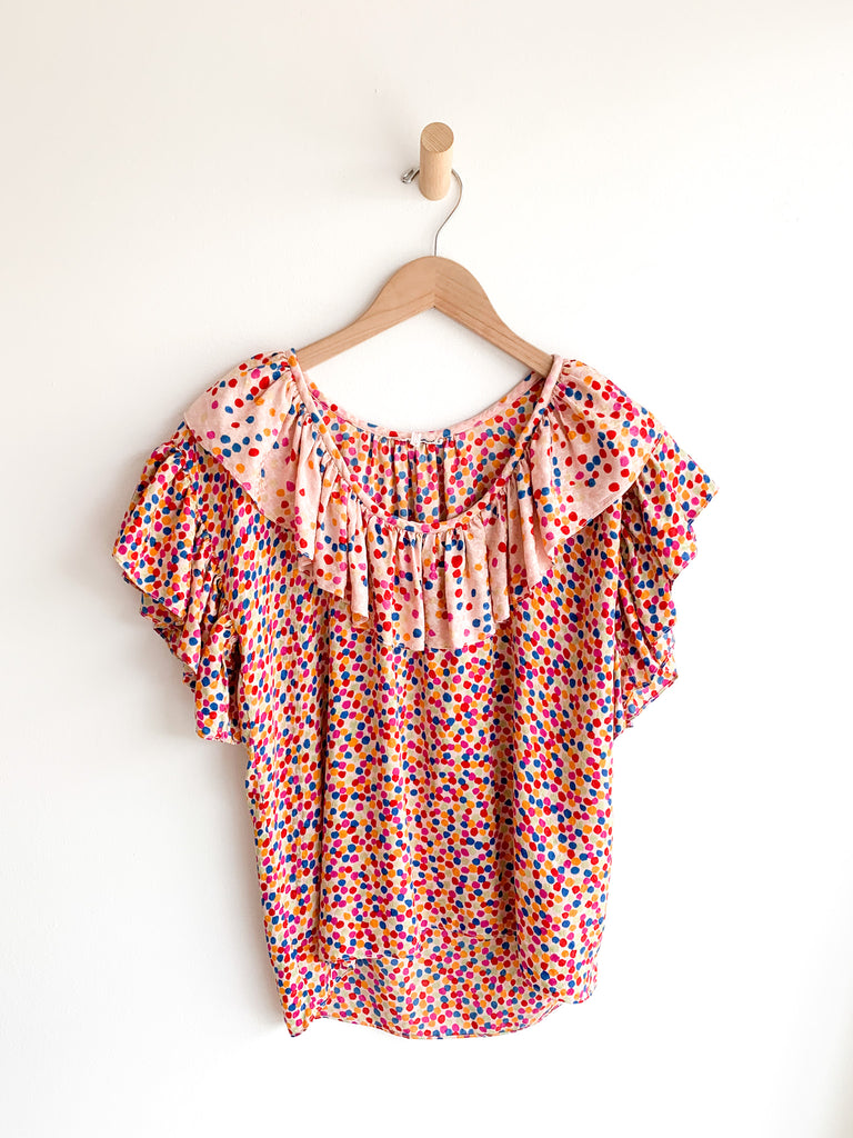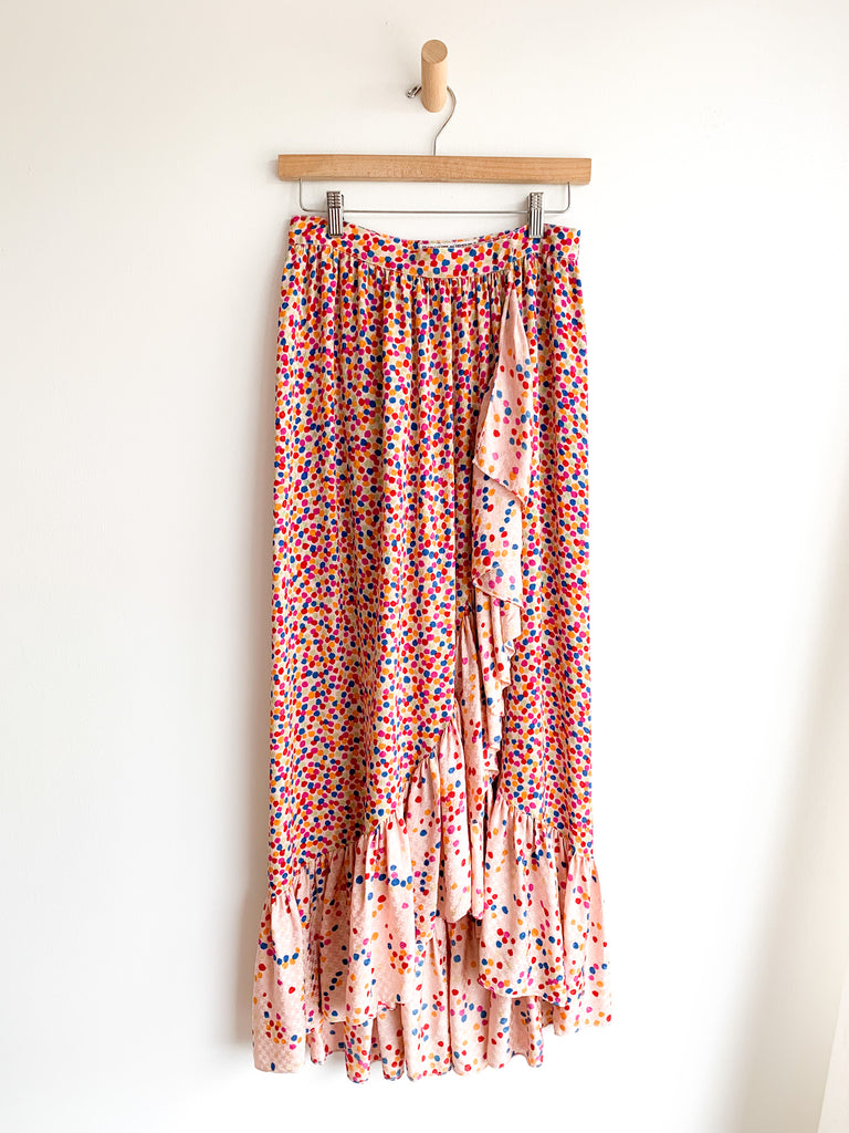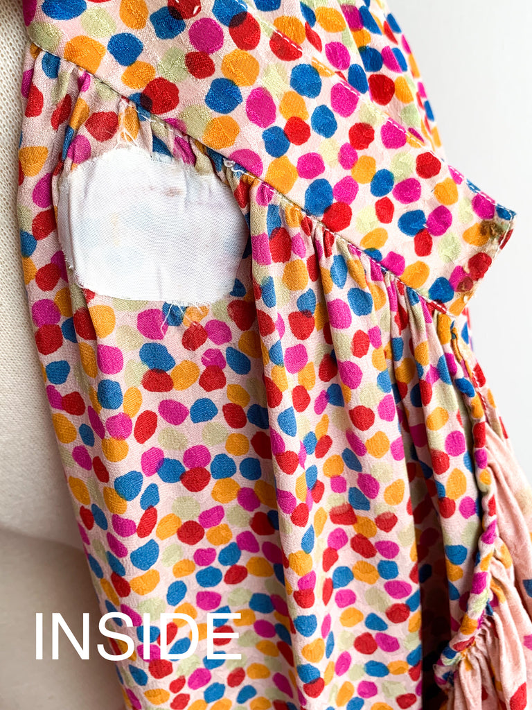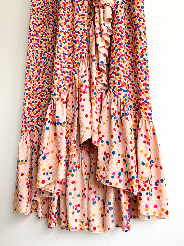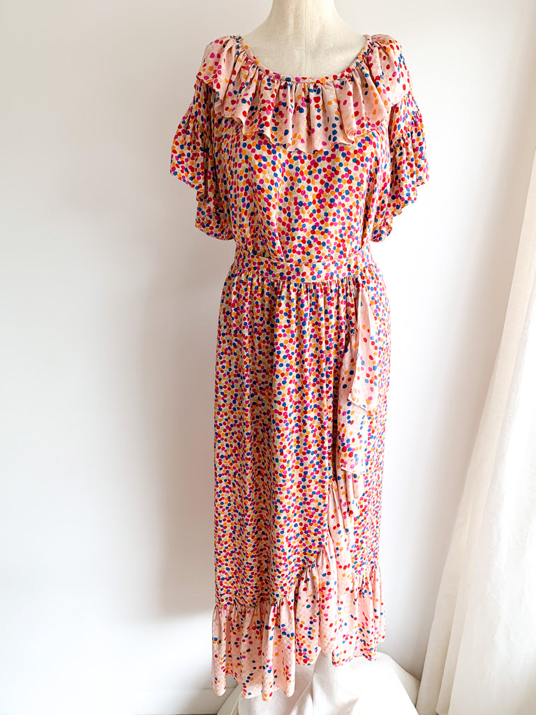 Dots, ruffles, pastel silk goodness in this really special skirt and top ensemble from 1970/80’s Yves Saint Laurent. Pretty pastels and ultra feminine. Wear separate or together.