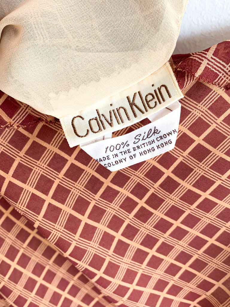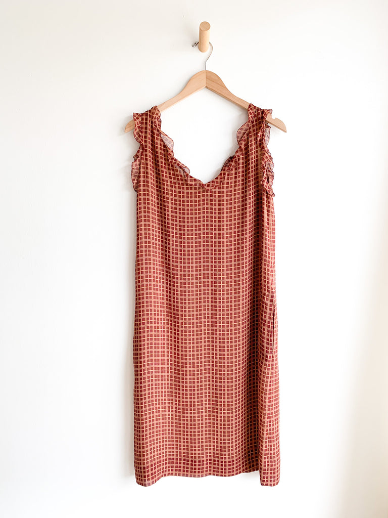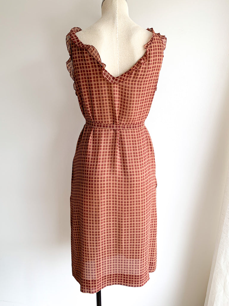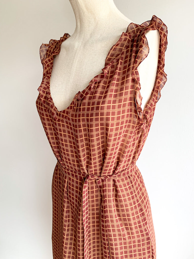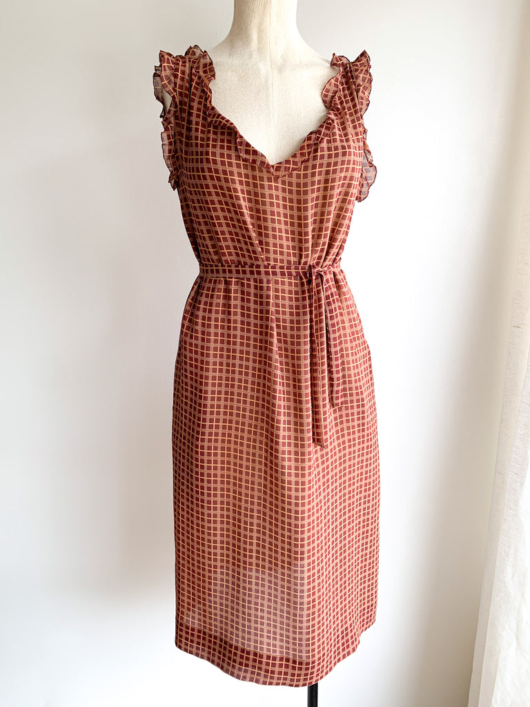 Silk sleeveless sheath dress fully lined with pockets and optional styling tie. Ruffle at neckline and arms. The perfect dress from Calvin Klein in neutral nutmeg/spice colors window pane printed sheer silk.