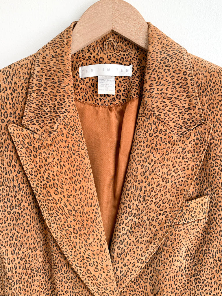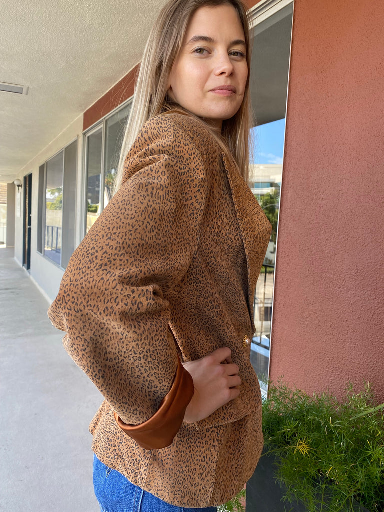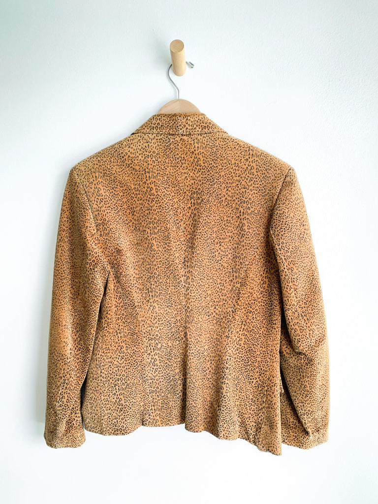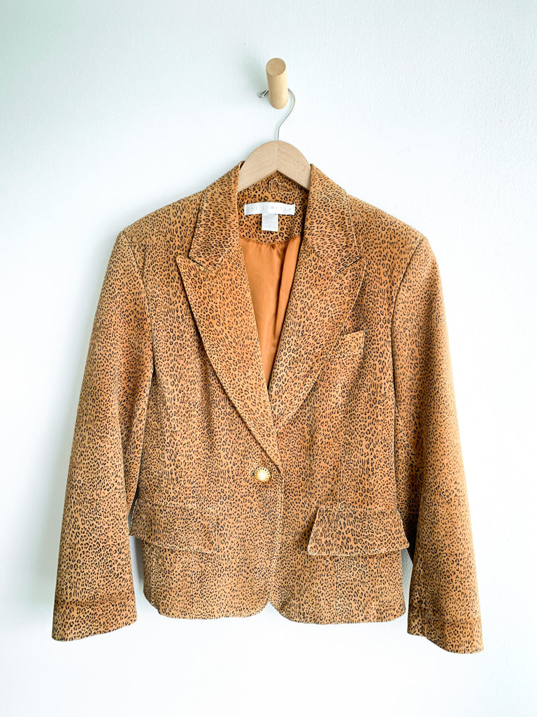 Excellent, super stylish cheetah printed suede blazer. Pearl gem single button closure. Flap front pockets, notched lapel. Fully satin acetate lined.