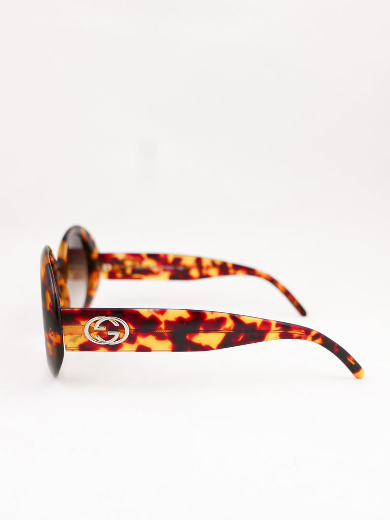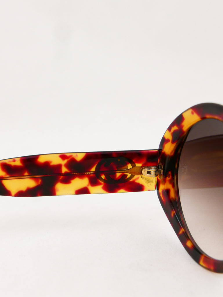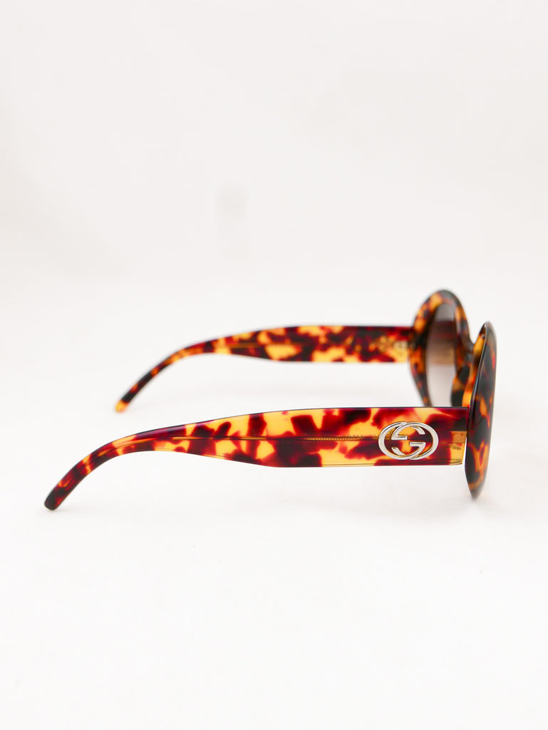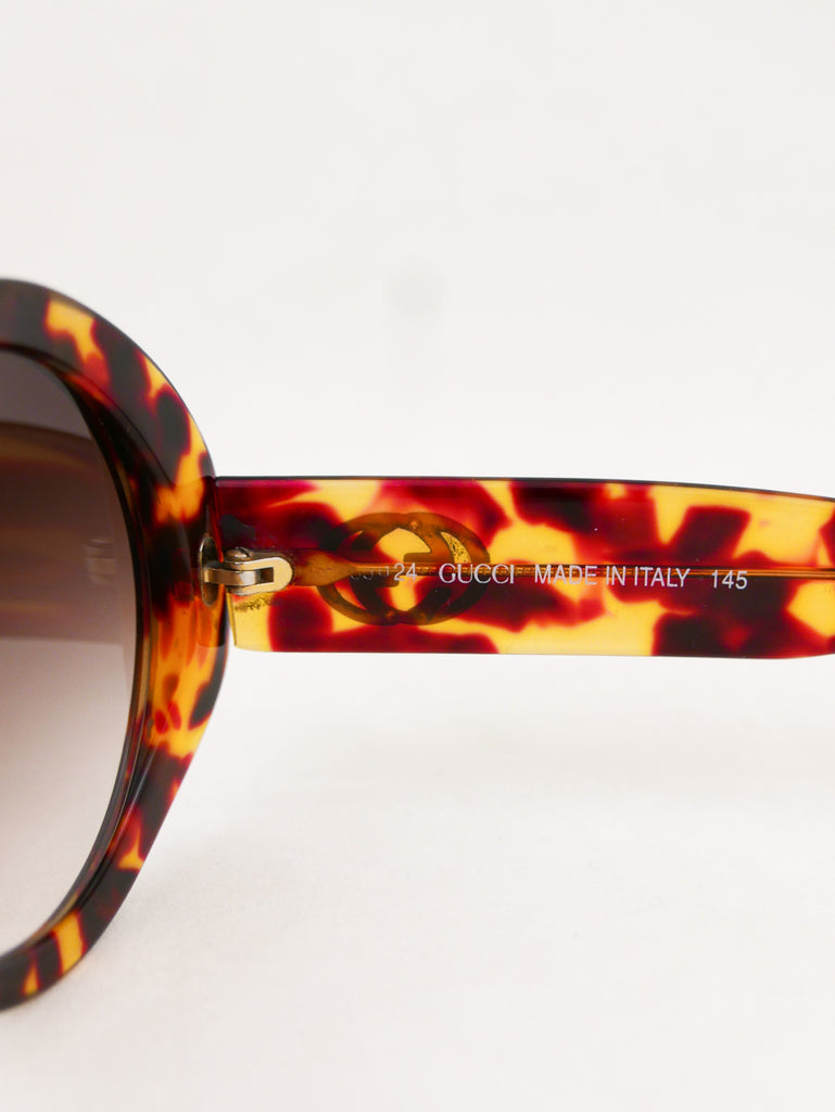 Oversized sunglasses with gradient lenses and tortoise shell style frames, complete with a gold Gucci logo on each end piece. Made in Italy.