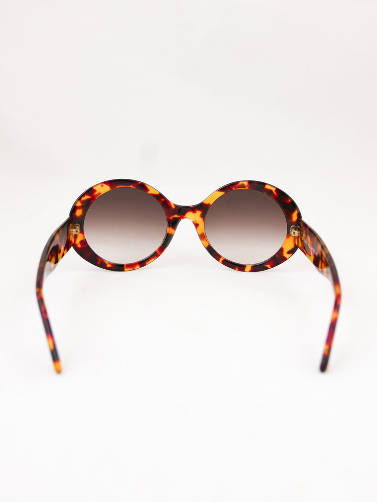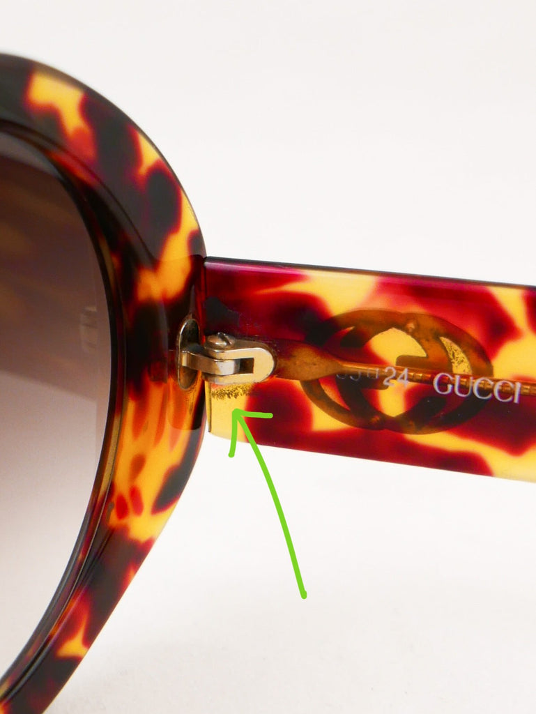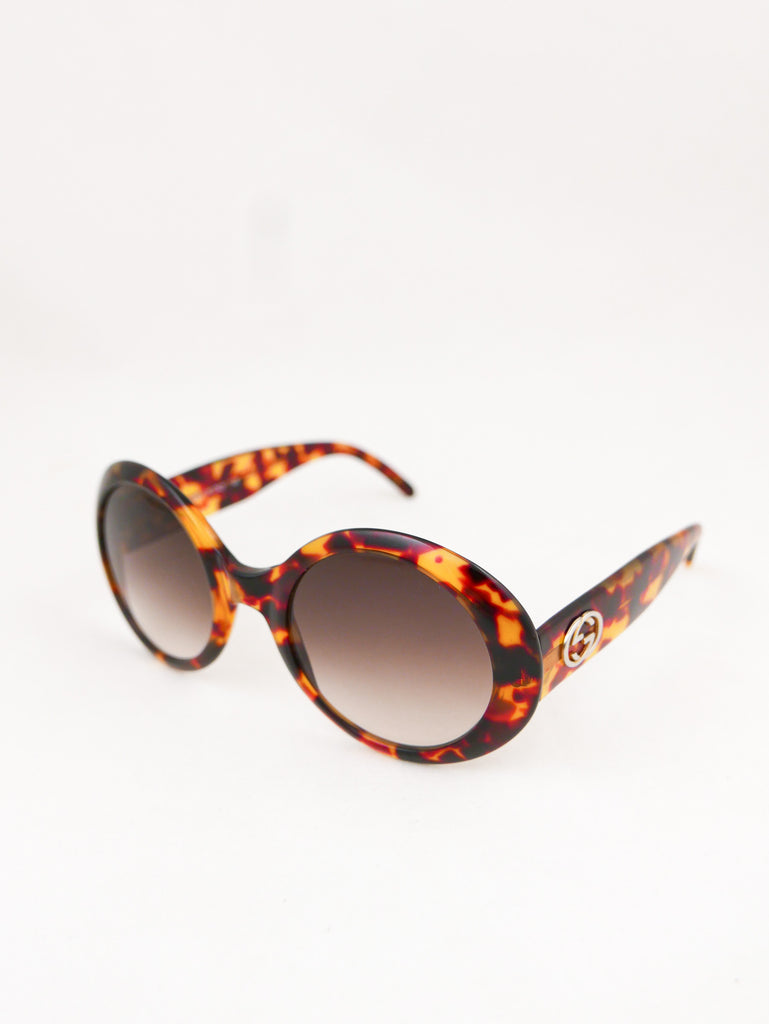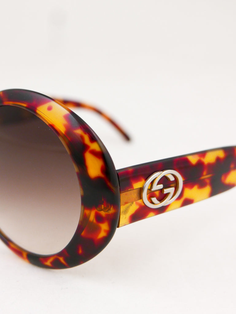Oversized sunglasses with gradient lenses and tortoise shell style frames, complete with a gold Gucci logo on each end piece. Made in Italy.