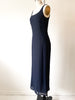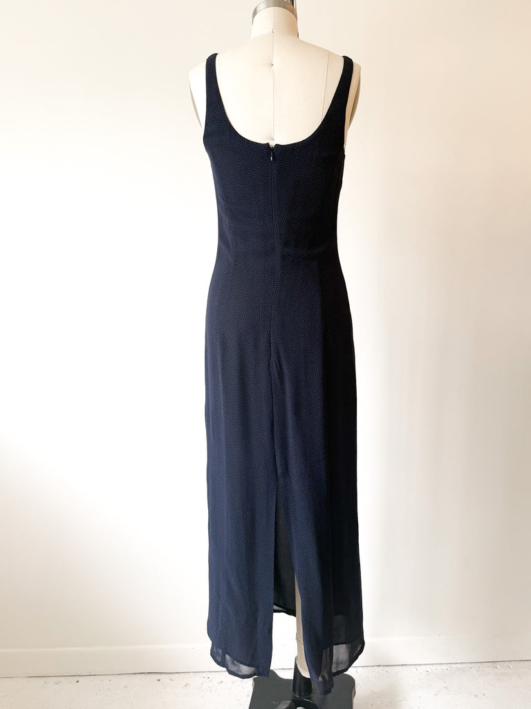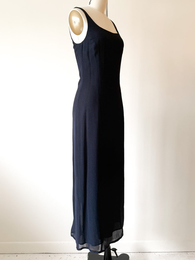 Double layered silk chiffon minimalist easy slip dress with midnight dotted color way. Back zip. Made in Italy