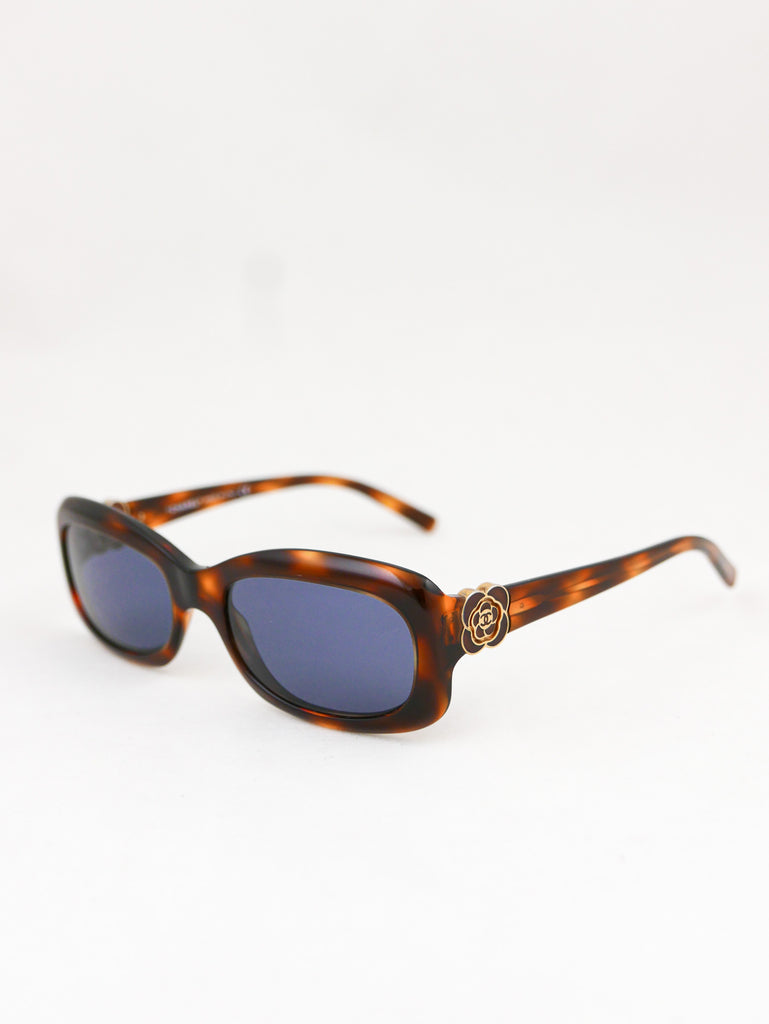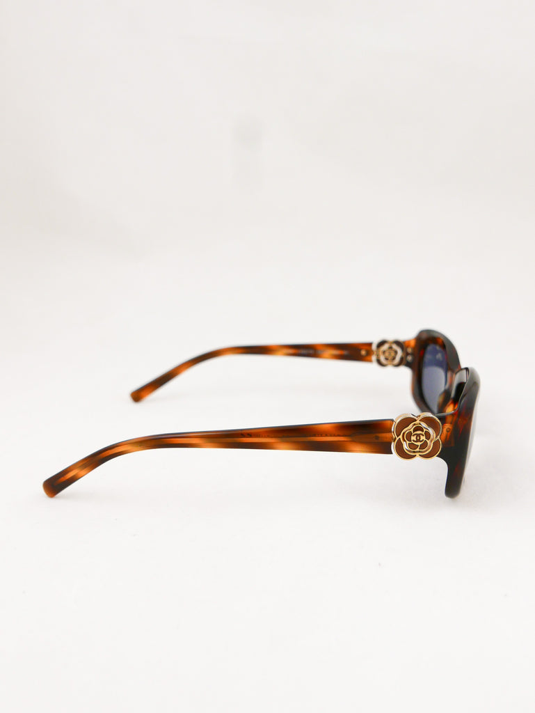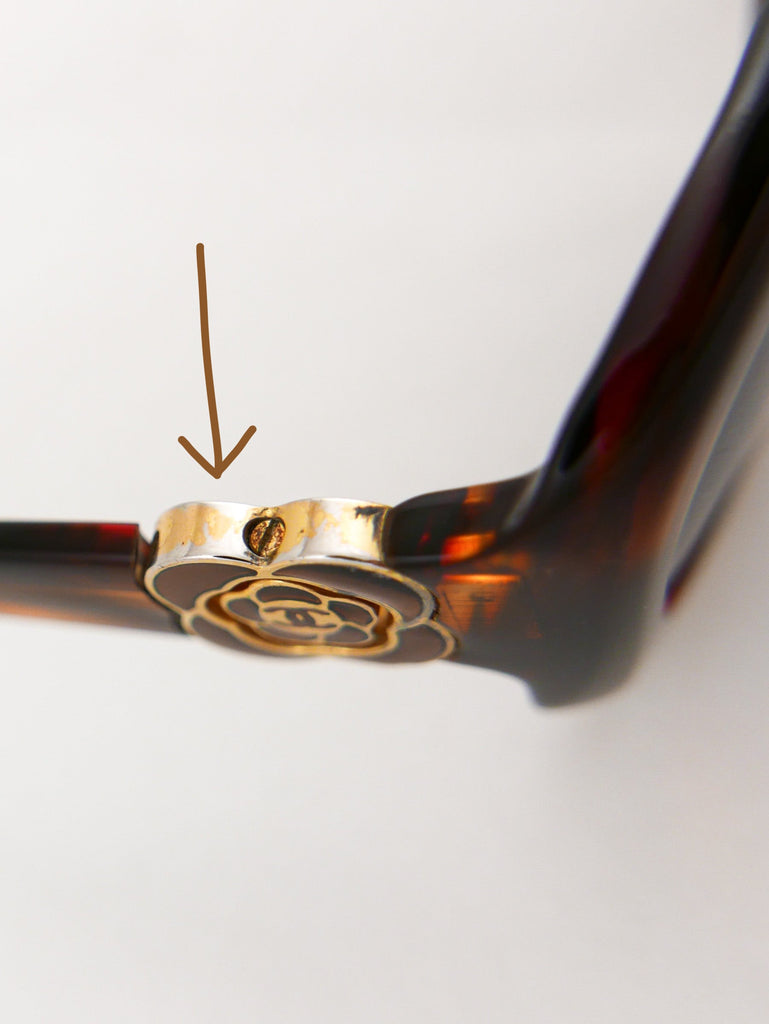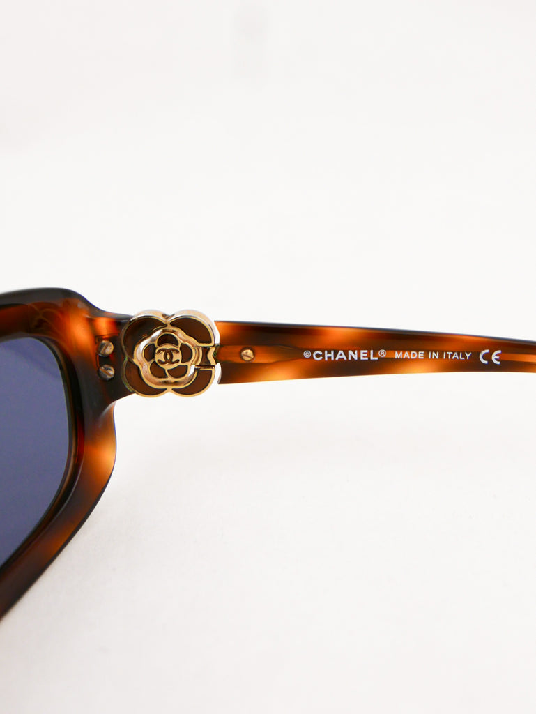 Sleek tortoise shell style frames with Chanel logo in a "gold rose" on each end piece. Made in Italy.