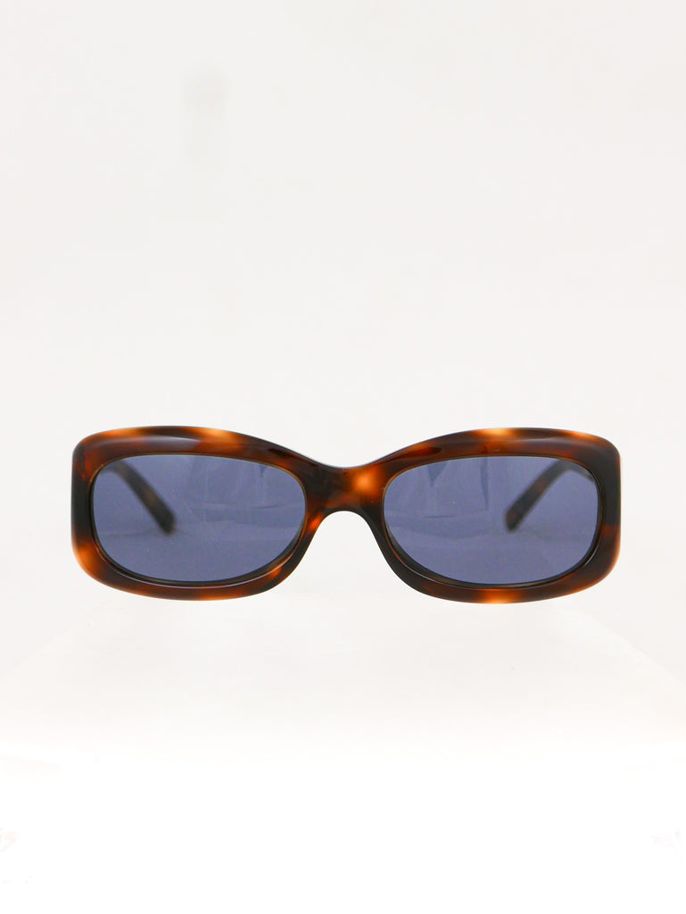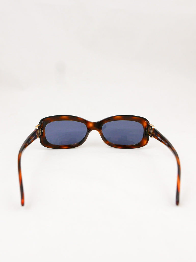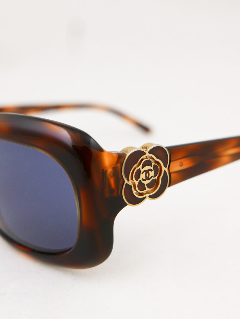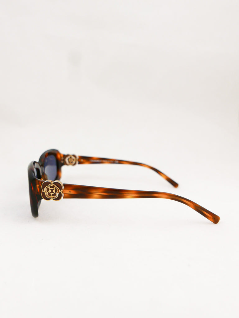 Sleek tortoise shell style frames with Chanel logo in a "gold rose" on each end piece. Made in Italy.