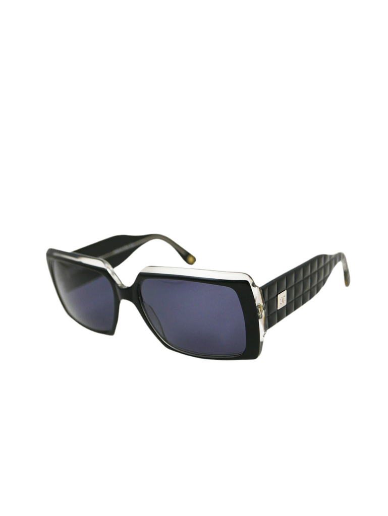These distinctive sunglasses have squared black rims with clear borders. The lenses have a solid tint of violet and the wide quilted temples have silver-toned Chanel CC logo on each side. Arms are black with the classic Chanel quilting. Made in Italy.