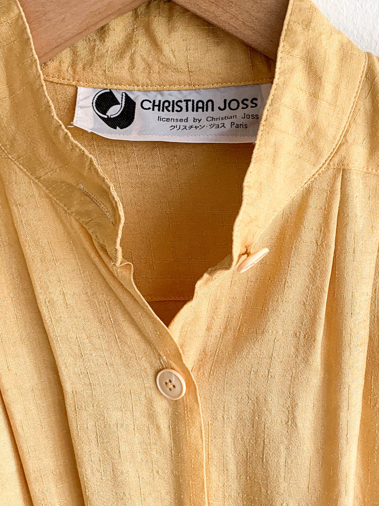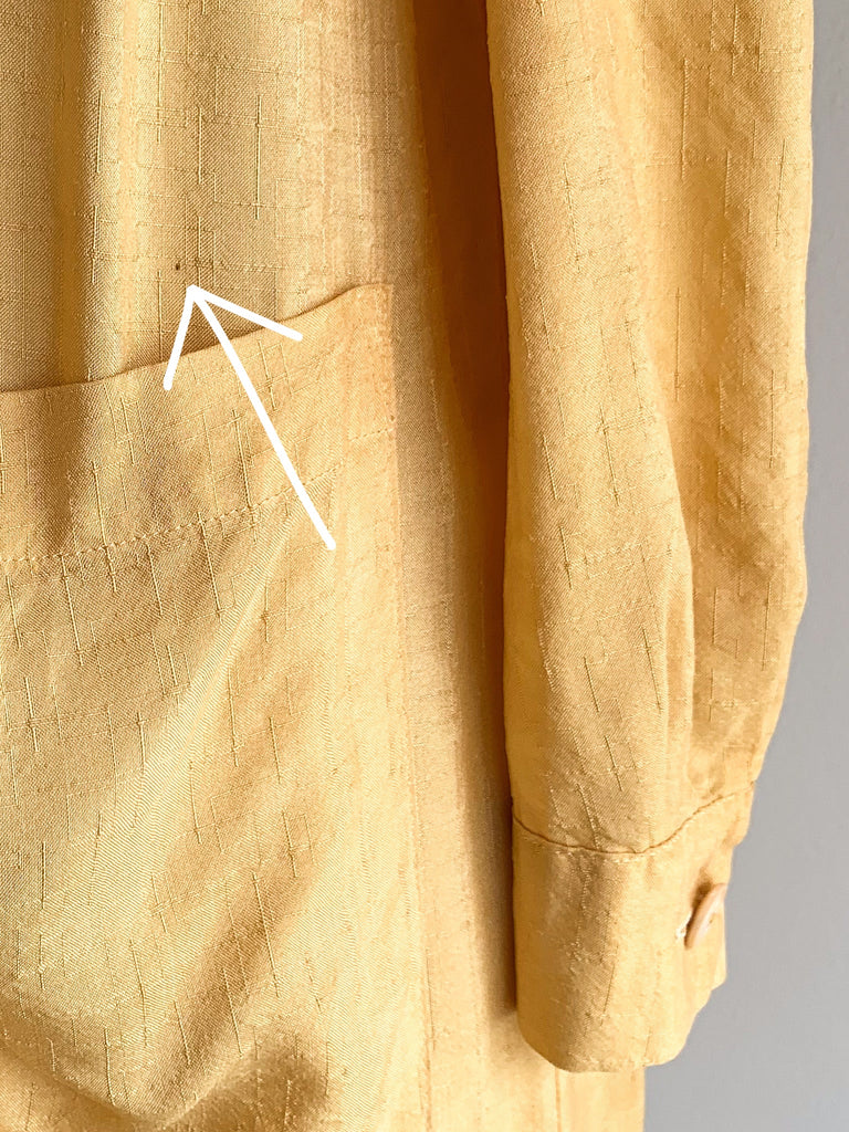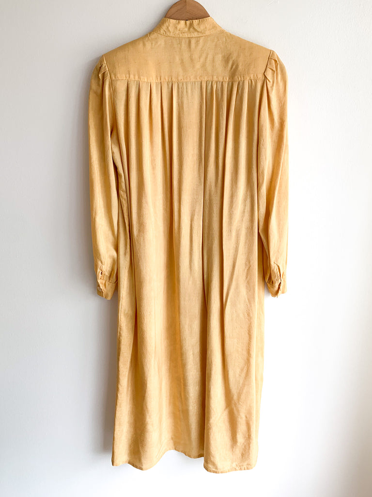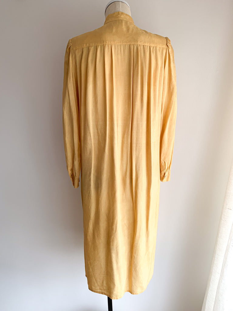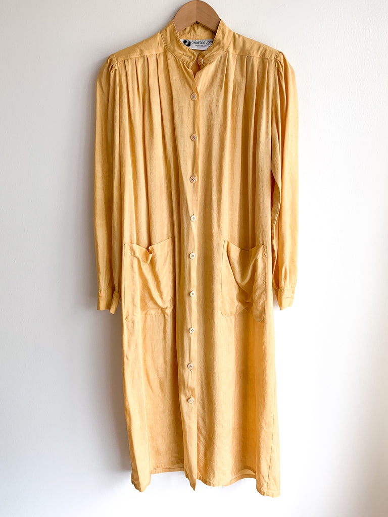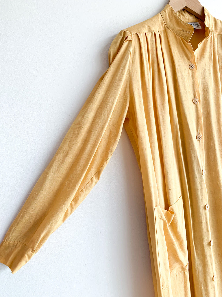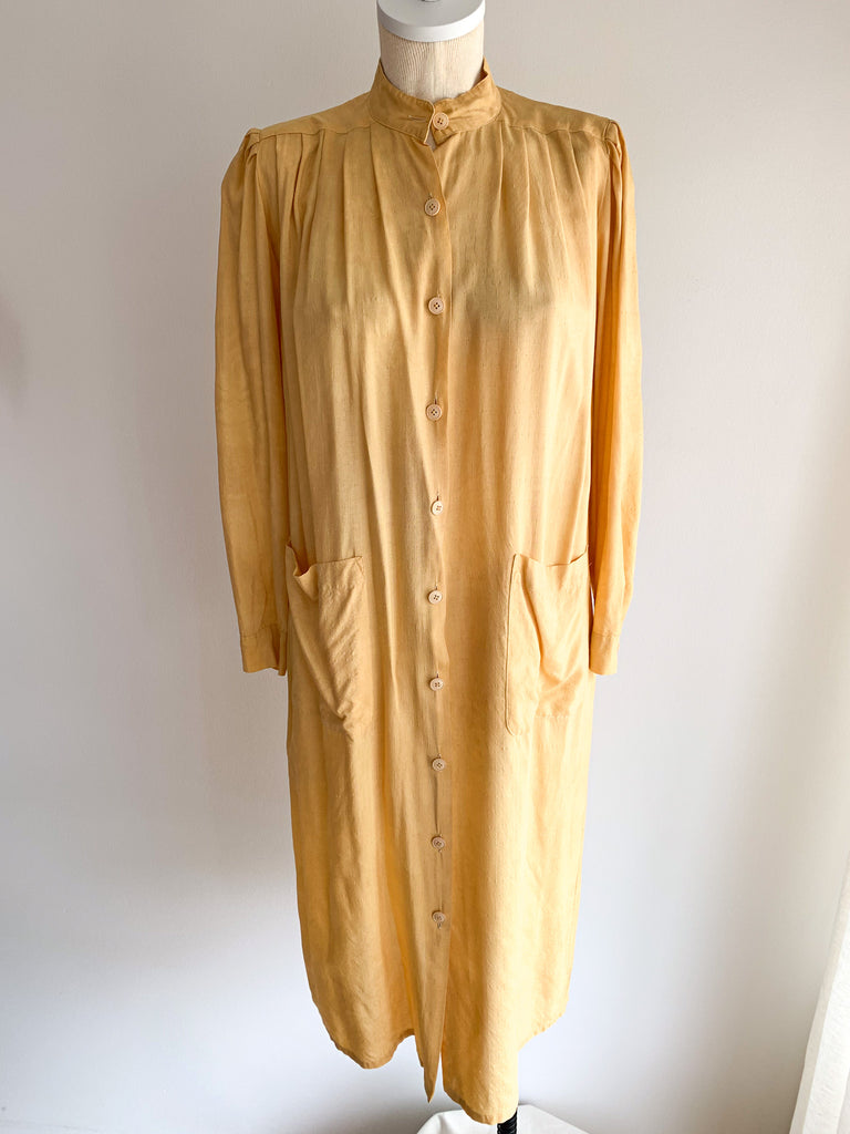 Sweet silk button front dress or wear open as a duster for layering. Patch pockets, mandarin collar and flattering pleats.