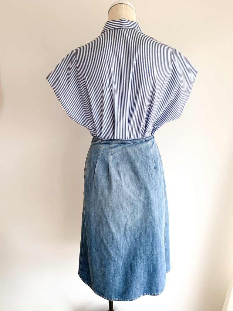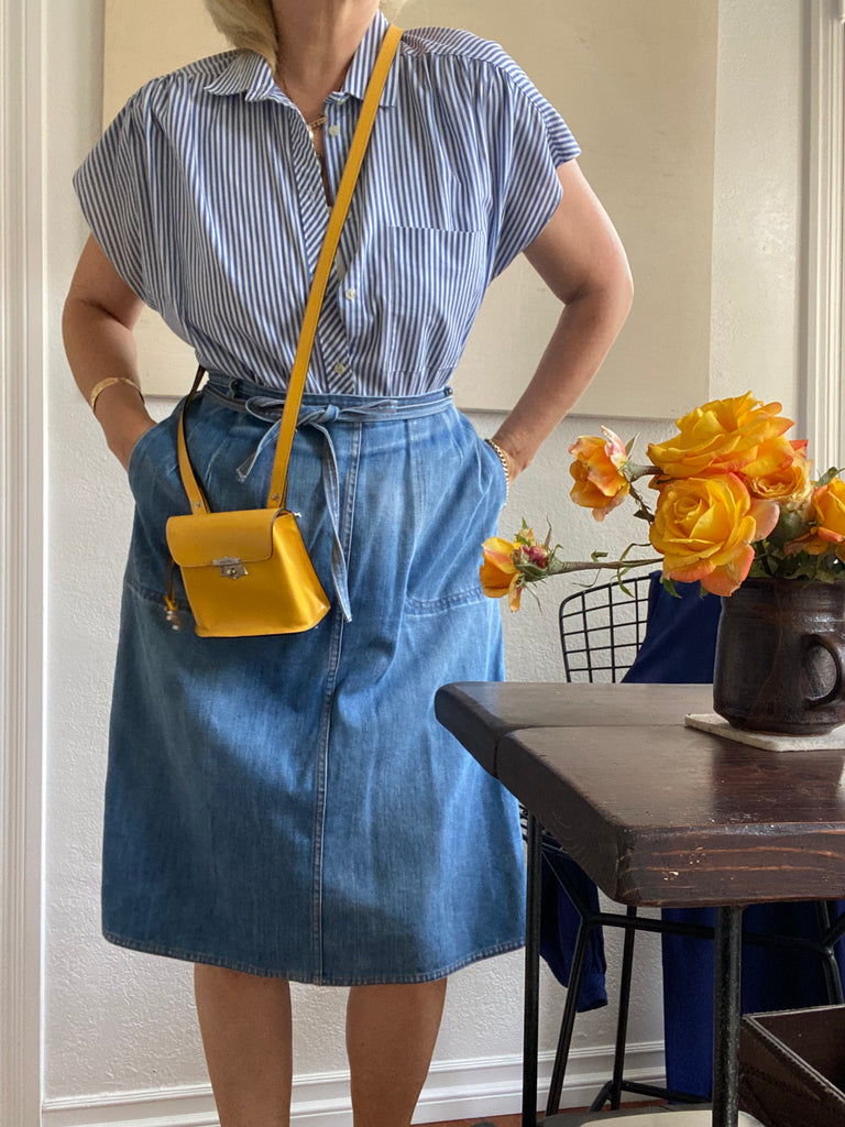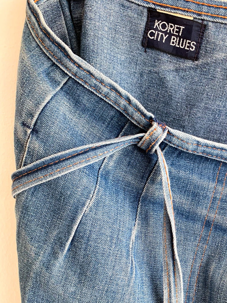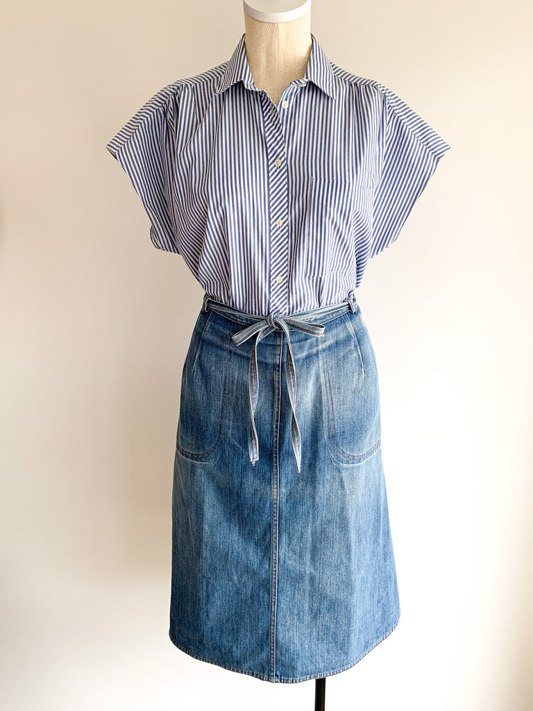 Washed denim wrap skirt with big front patch pockets. Especially great color and wear on this timeless piece.
