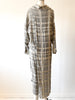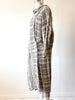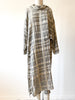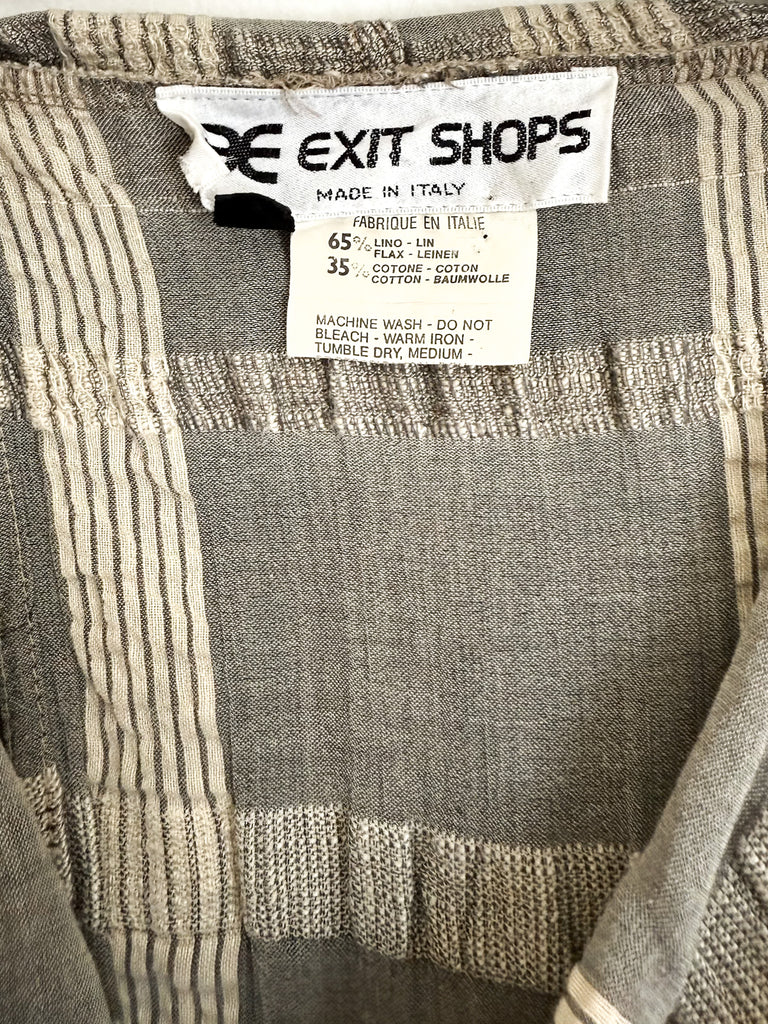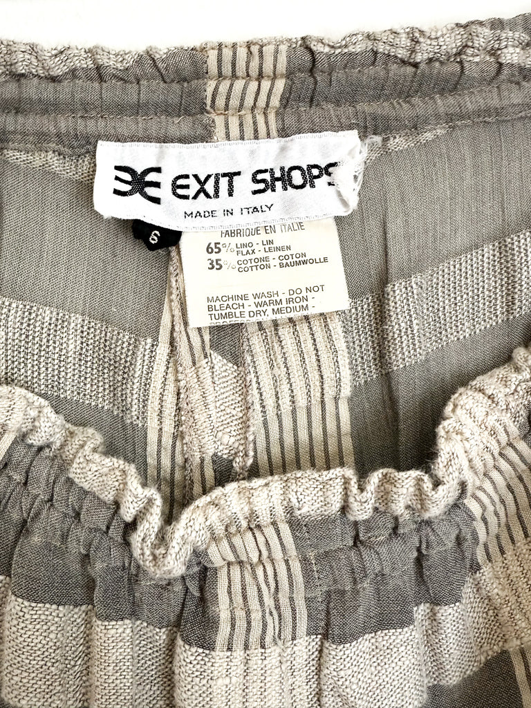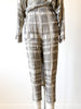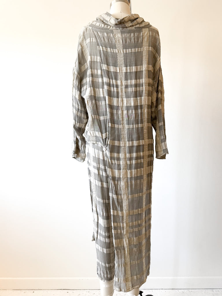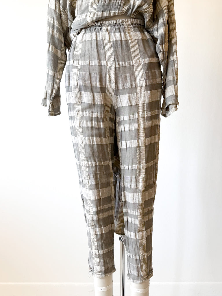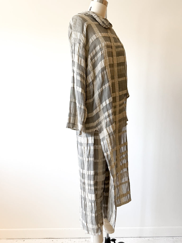 Comprised of asymmetrical tunic top with high neck and elastic waist trousers in a fog and sand color way. Lightweight and packable for a great travel outfit.