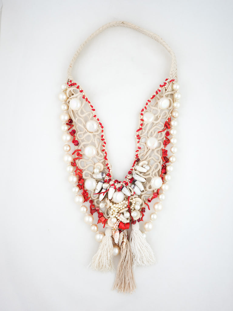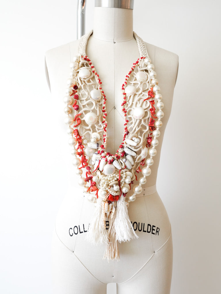 Large necklace hand-made for Nina Ricci Spring/Summer runway by Luthier Reinhard. Mixed media: braided rope, shells, beads, dyed coral and cotton tassels.
