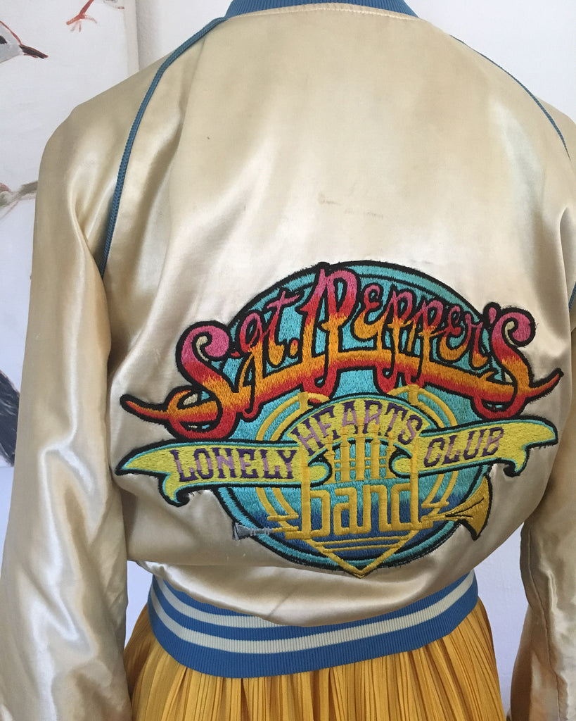 Ladies small, fitted satin bomber jacket featuring a Sargent Peppers Lonely Hearts Club Band embroidered full sized patch on back.