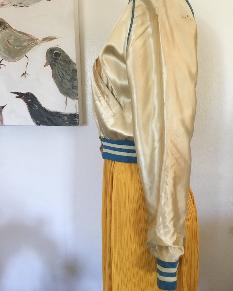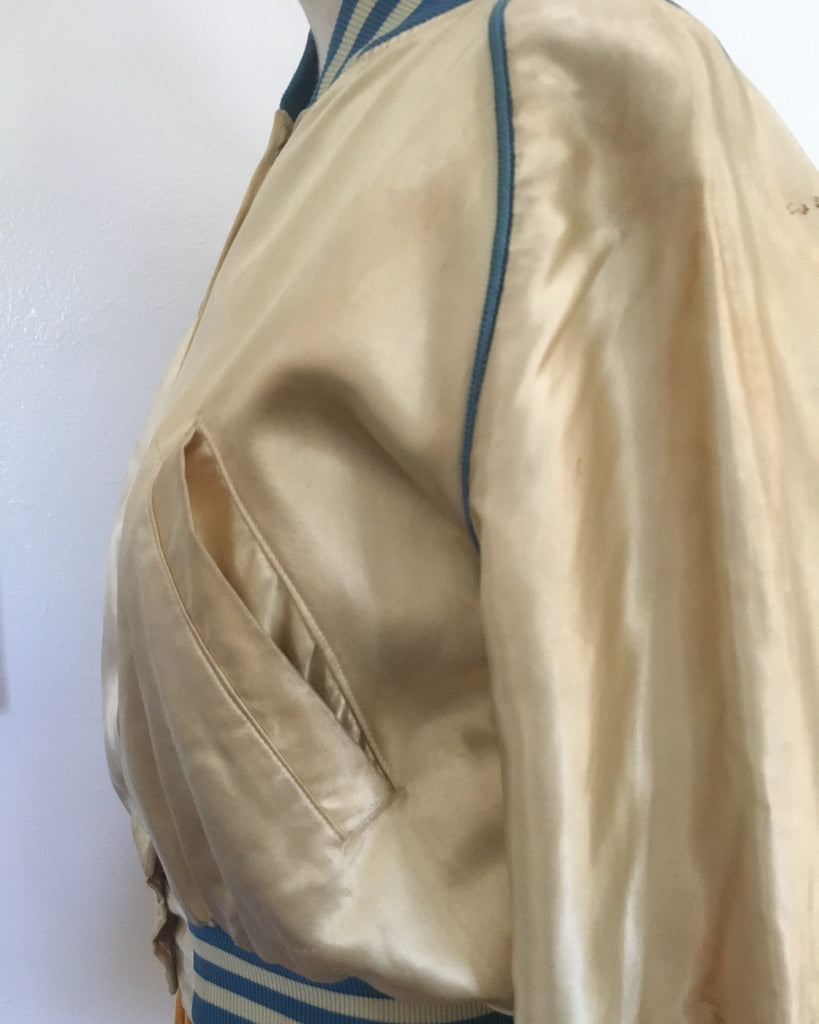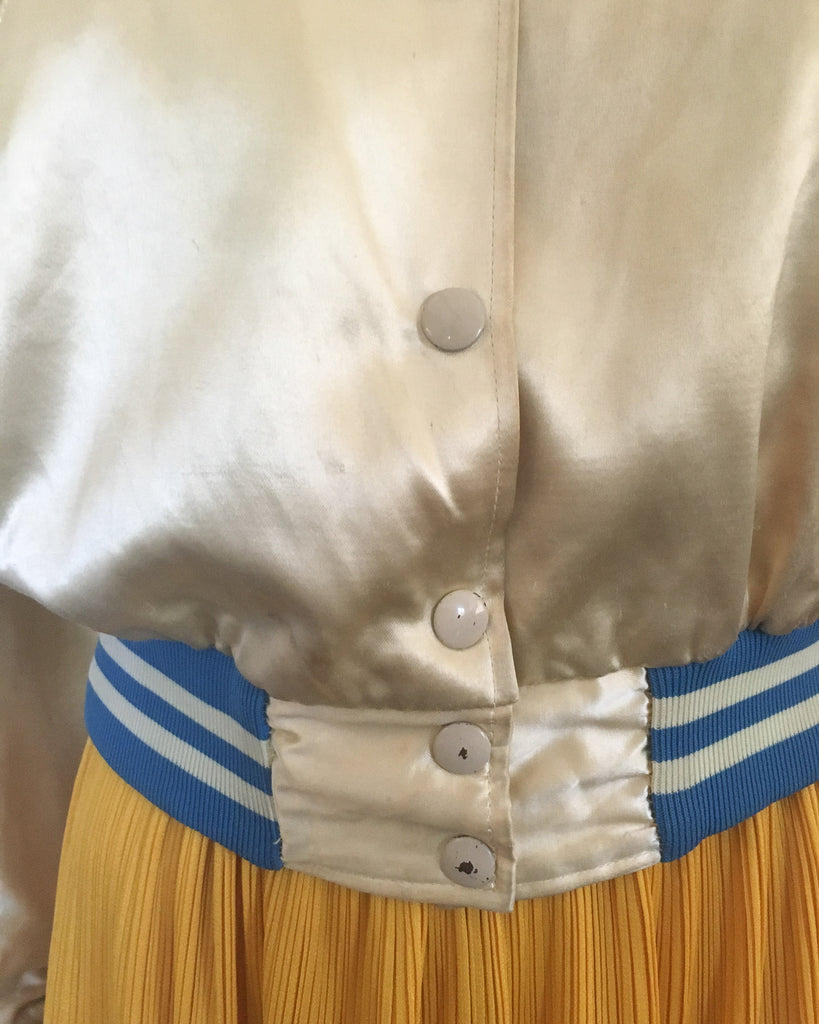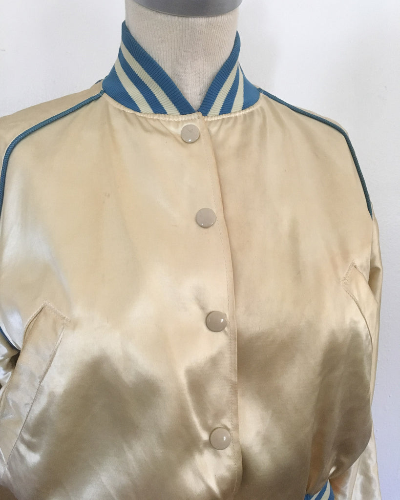 Ivory satin body with turquoise and ivory striped ribbed cuffs, collar and waist.  Snaps up the front with 7 metal painted buttons. Last three buttons have some wear, rub marks, and scratched off paint (see photos).